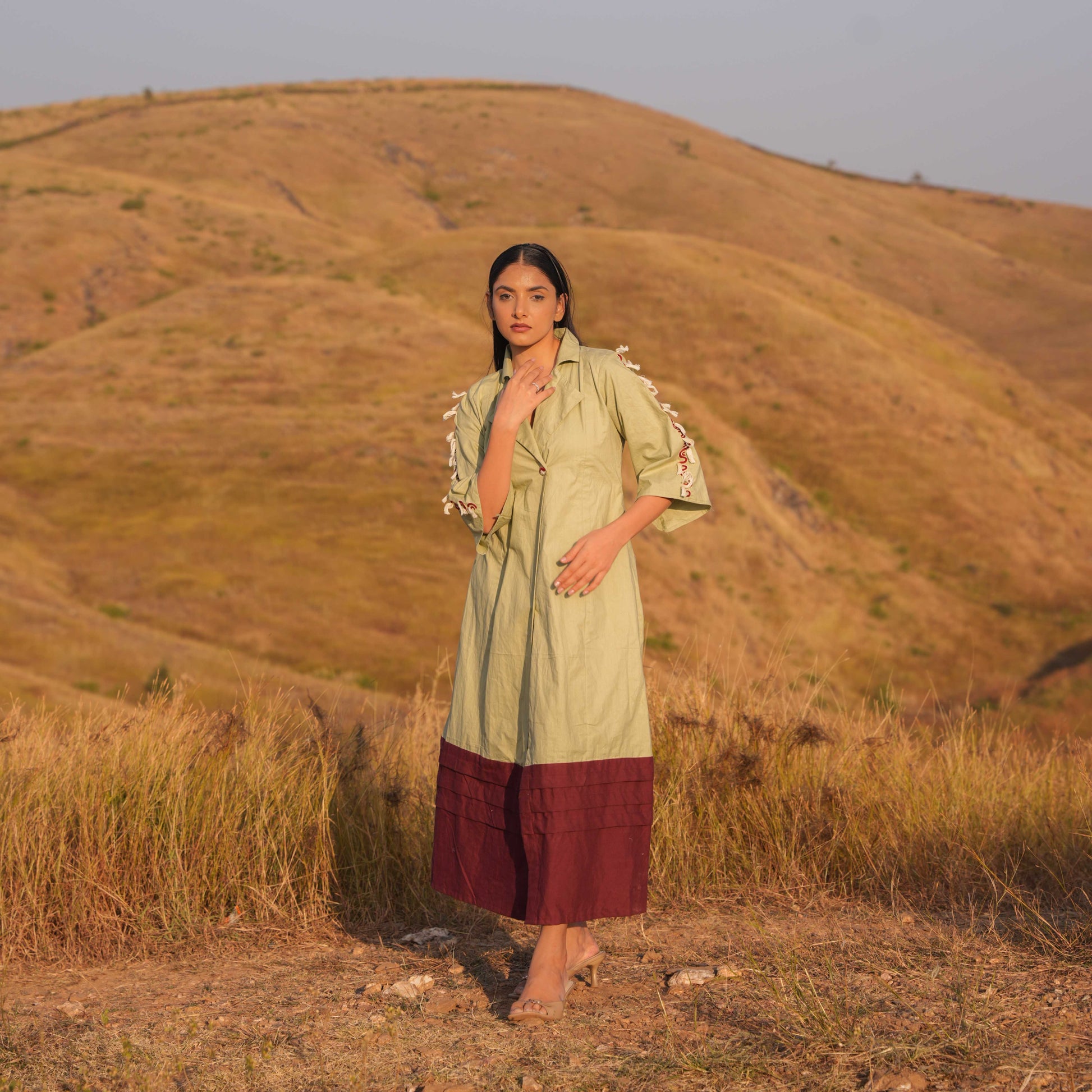 Intricate shoulder-to-sleeve lace detailing adds a touch of femininity and grace, while embroidered buttons along the neckline offer a polished finish. A standout feature of this dress is the tassel detailing on the back yoke line, adding whimsical charm and a unique focal point to the ensemble