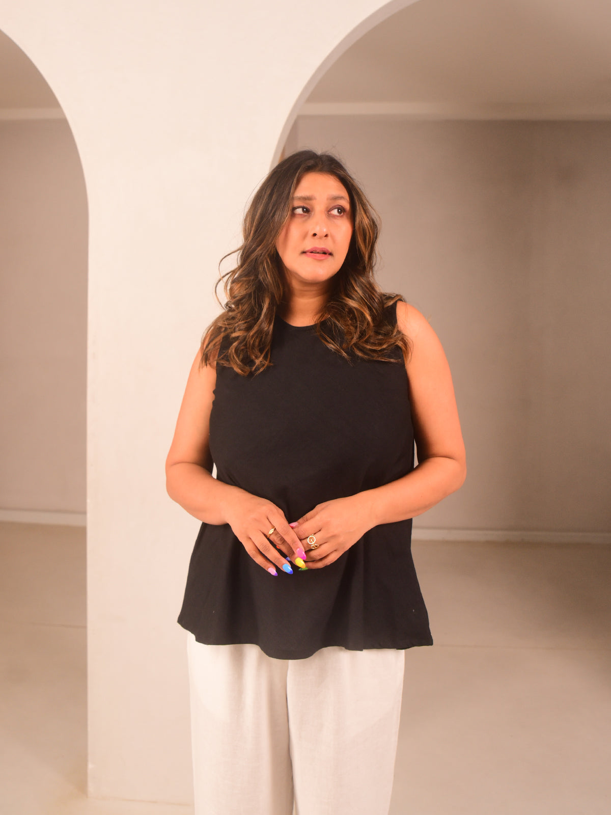 Crafted in black-dyed Amara cotton-linen, this version of the Everyday Top is effortlessly polished. The structured yet breathable fabric, combined with the clean neckline, subtle keyhole back, and flared fit, creates a look that's minimal yet elevated. Pair with tailored trousers and bold earrings for a monochrome work look that transitions seamlessly into the evening. Perfect for formal office settings, team presentations, or dinner with colleagues.