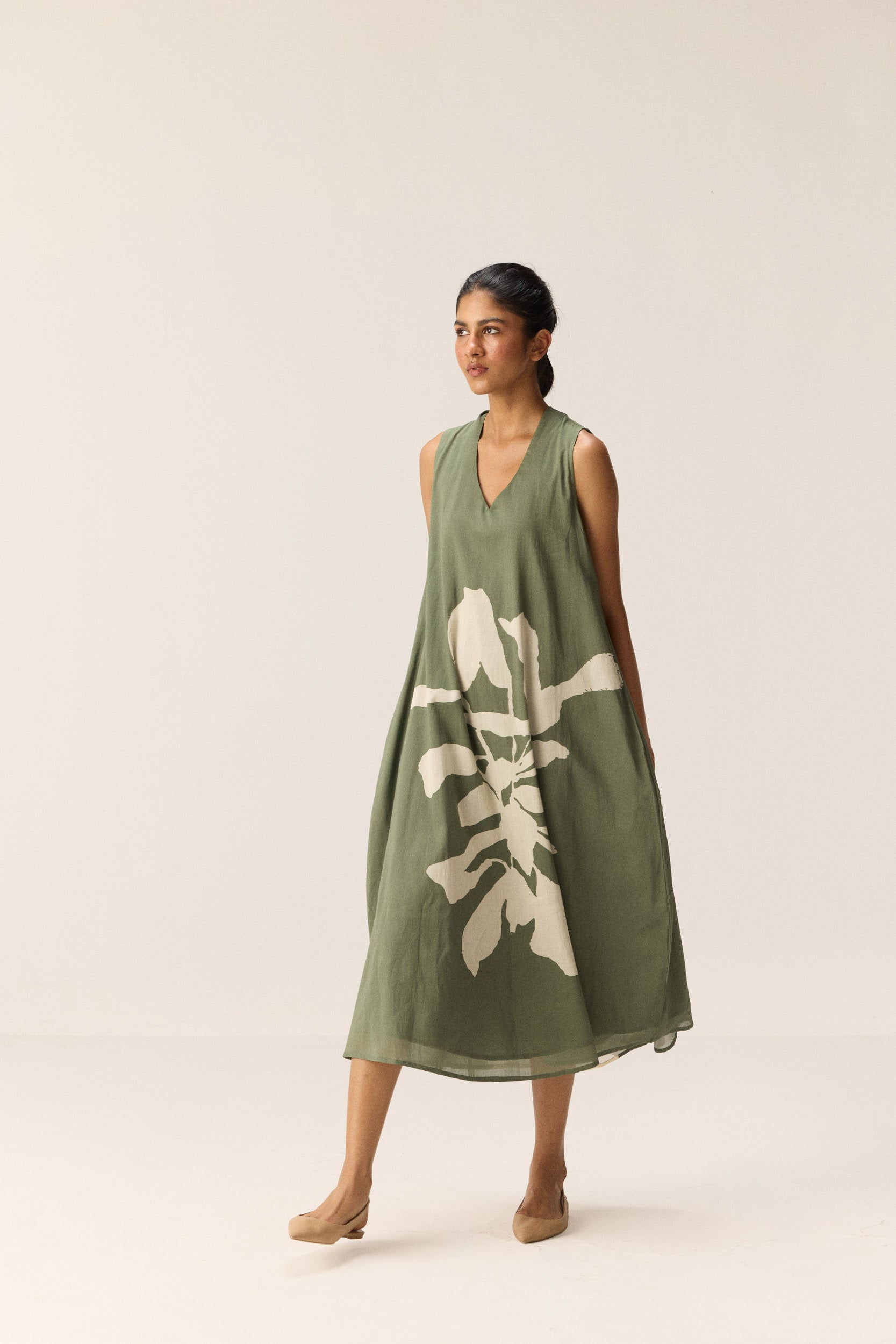 A sleeveless sage green dress crafted in soft cotton mul, featuring a curved V neckline and an abstract white floral print on the front. Finished with side seam pockets, this piece balances subtle elegance with everyday comfort.
