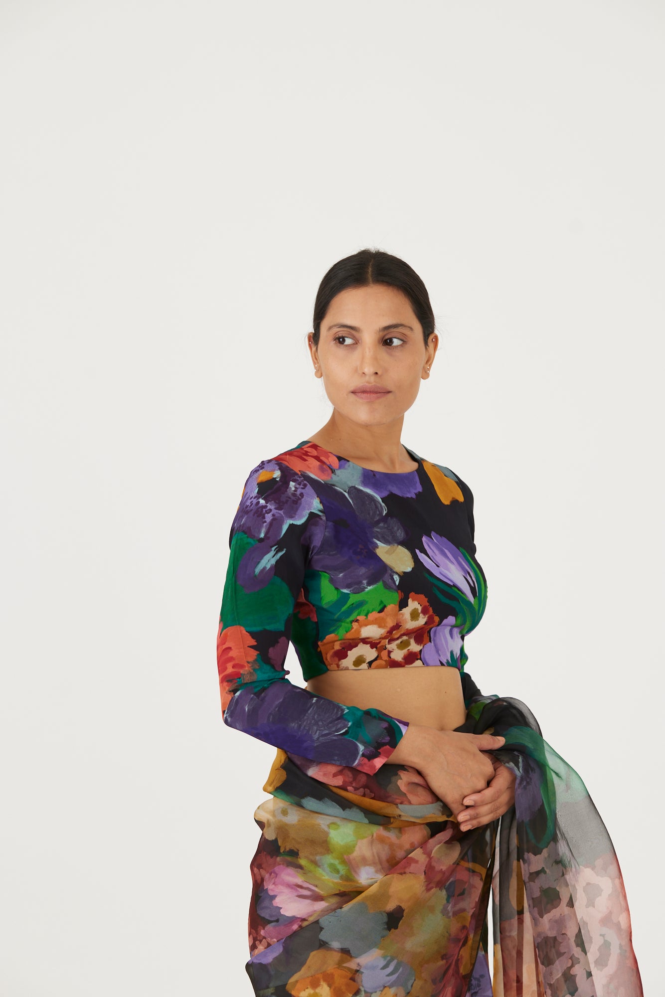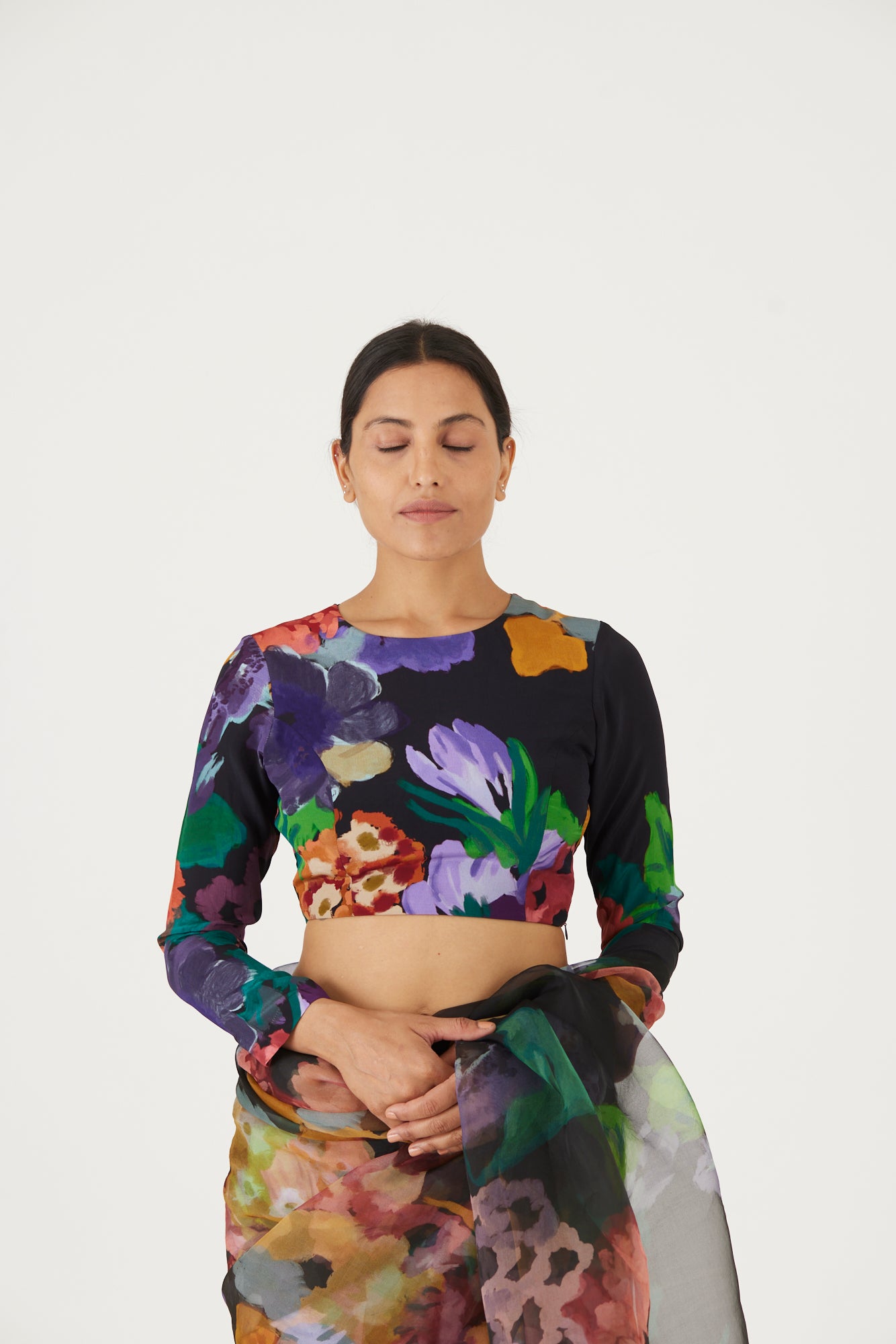 The print features an abundance of roses along with marigolds and jasmines arranged together in a bouquet in a black base