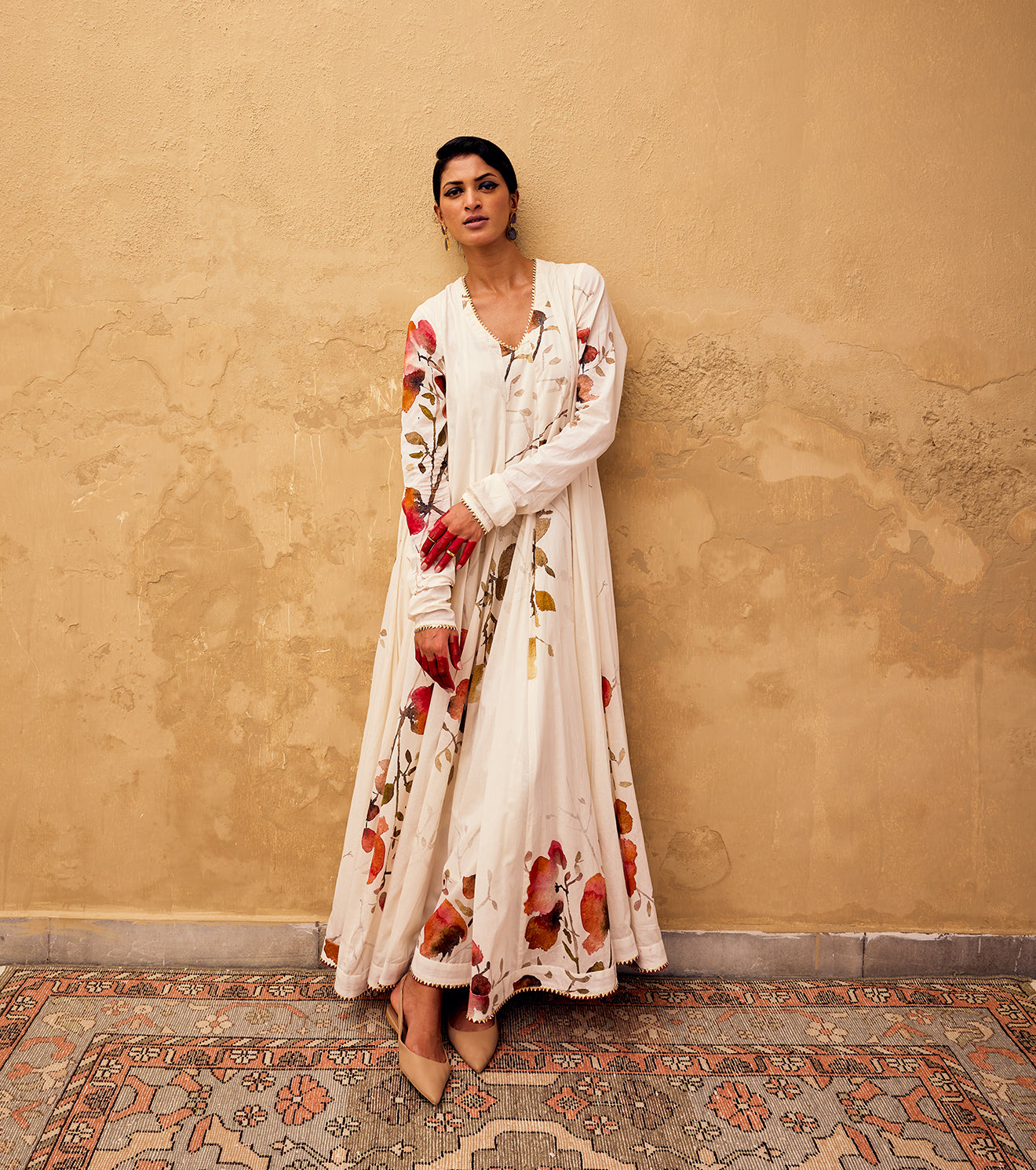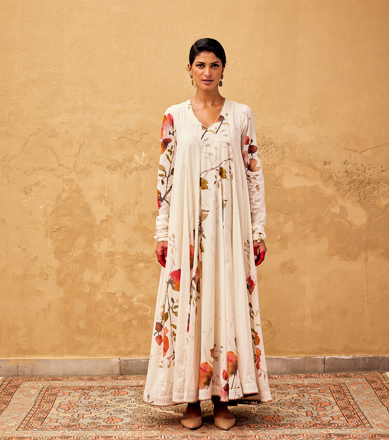 A voluminous floral printed maxi dress with bijiya gota detailing in the neckline , hemline and cuffs crafted from breathable soft cotton mul fabric.