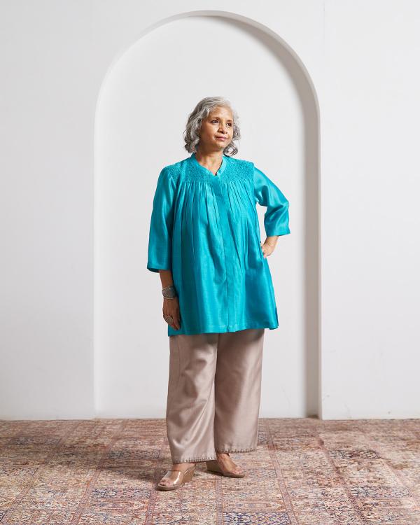 Elegant. Effortless. Enduring. Crafted in luminous silk chanderi, this ferozi blue top is a refreshing ode to understated charm. Smocking details across the yoke add gentle texture and depth, creating soft gathers that let the fabric flow with ease.