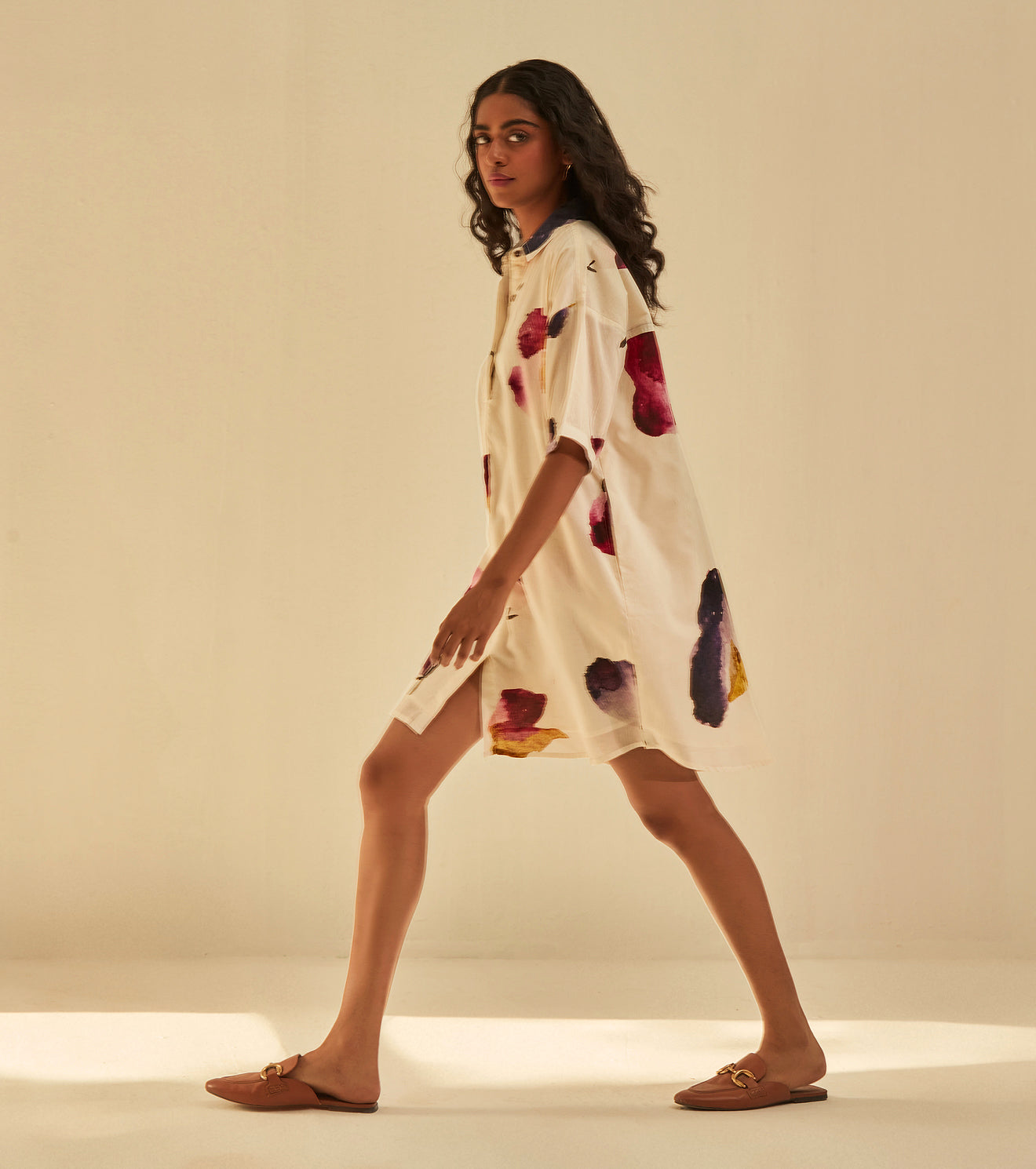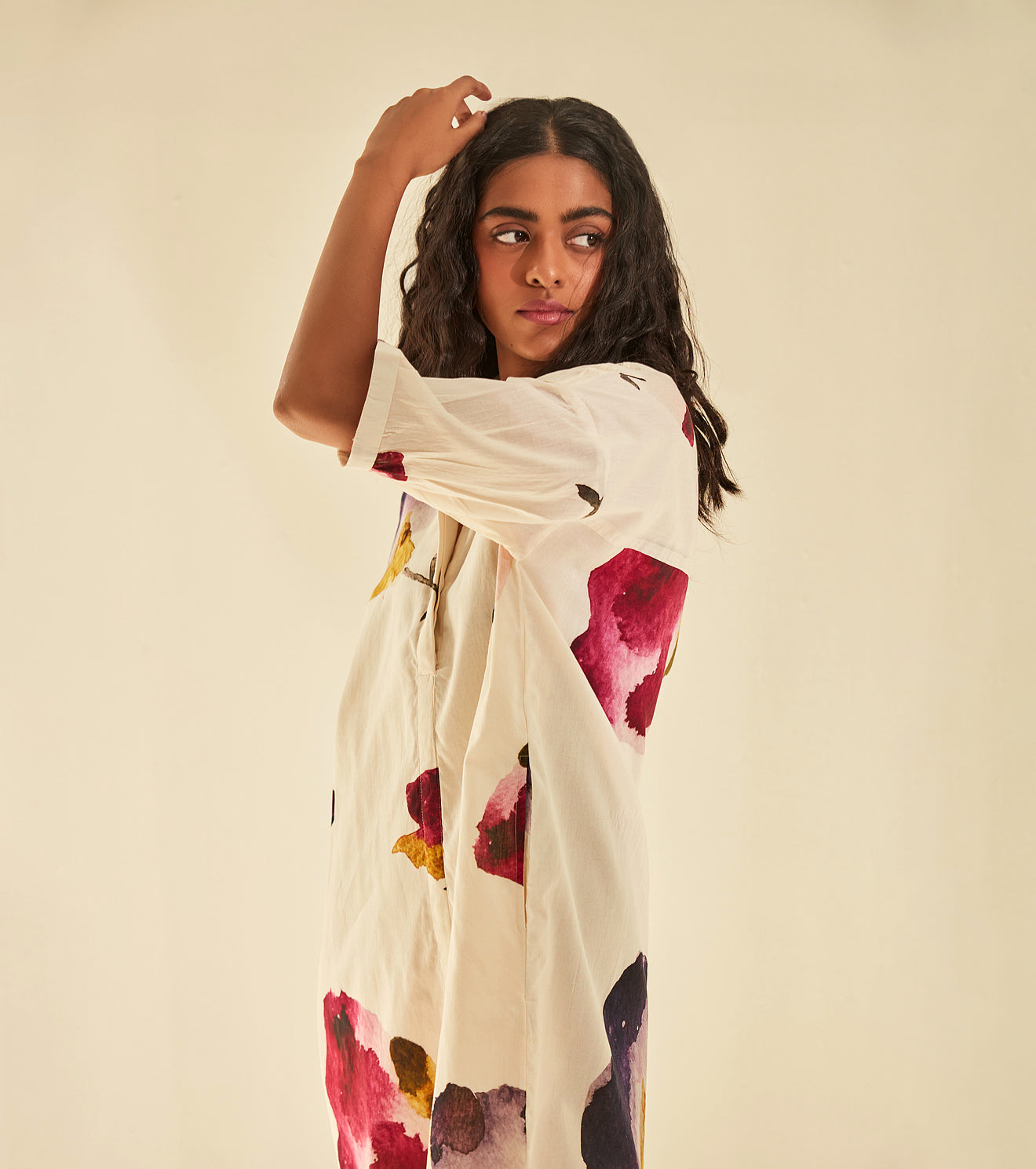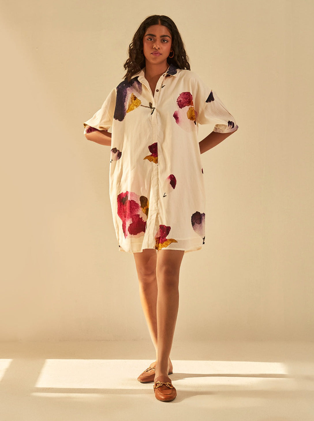 An easy shirt dress crafted to bloom, adorned with a floral print with front button opening, for the season's glee. crafted in soft cotton mul.Handcrafted in India. Side seam pockets.