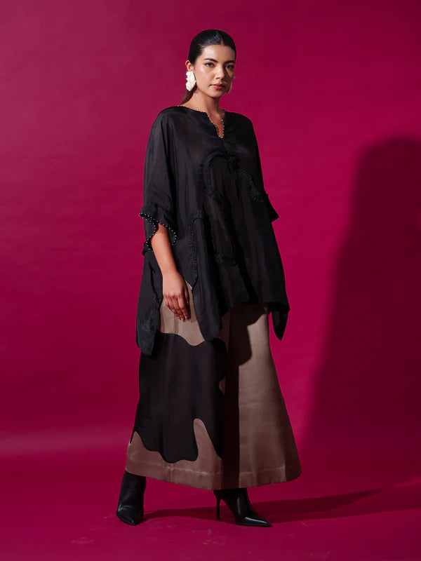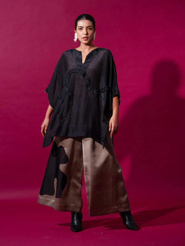Oversized top made in light silk feature hand sewn ruffles and intricate embroidery details on the neck and sleeves