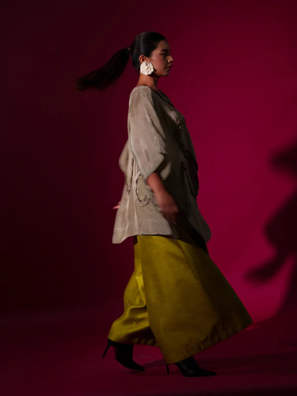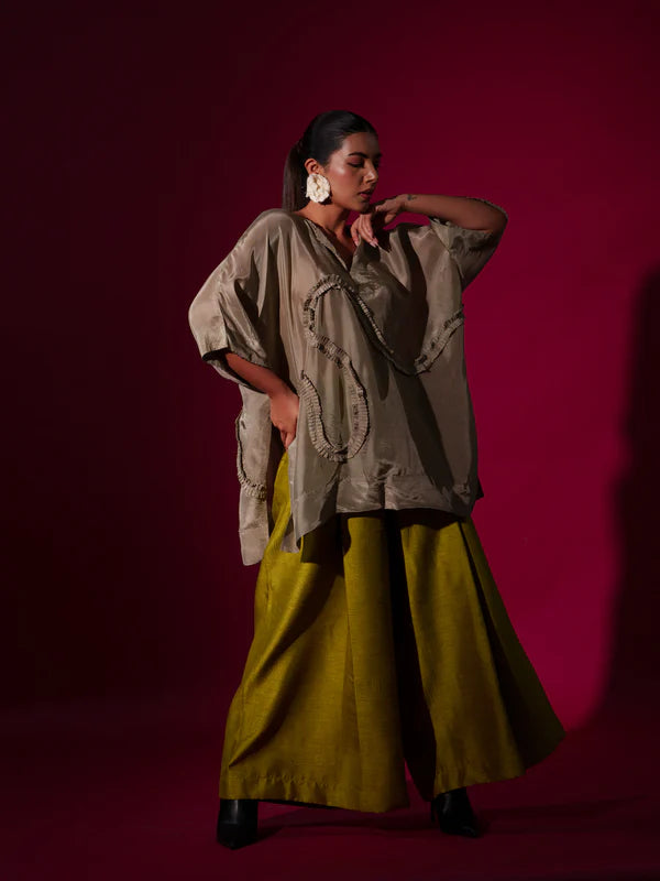 Oversized top made in light silk feature hand sewn ruffles and intricate embroidery details on the neck and sleeves