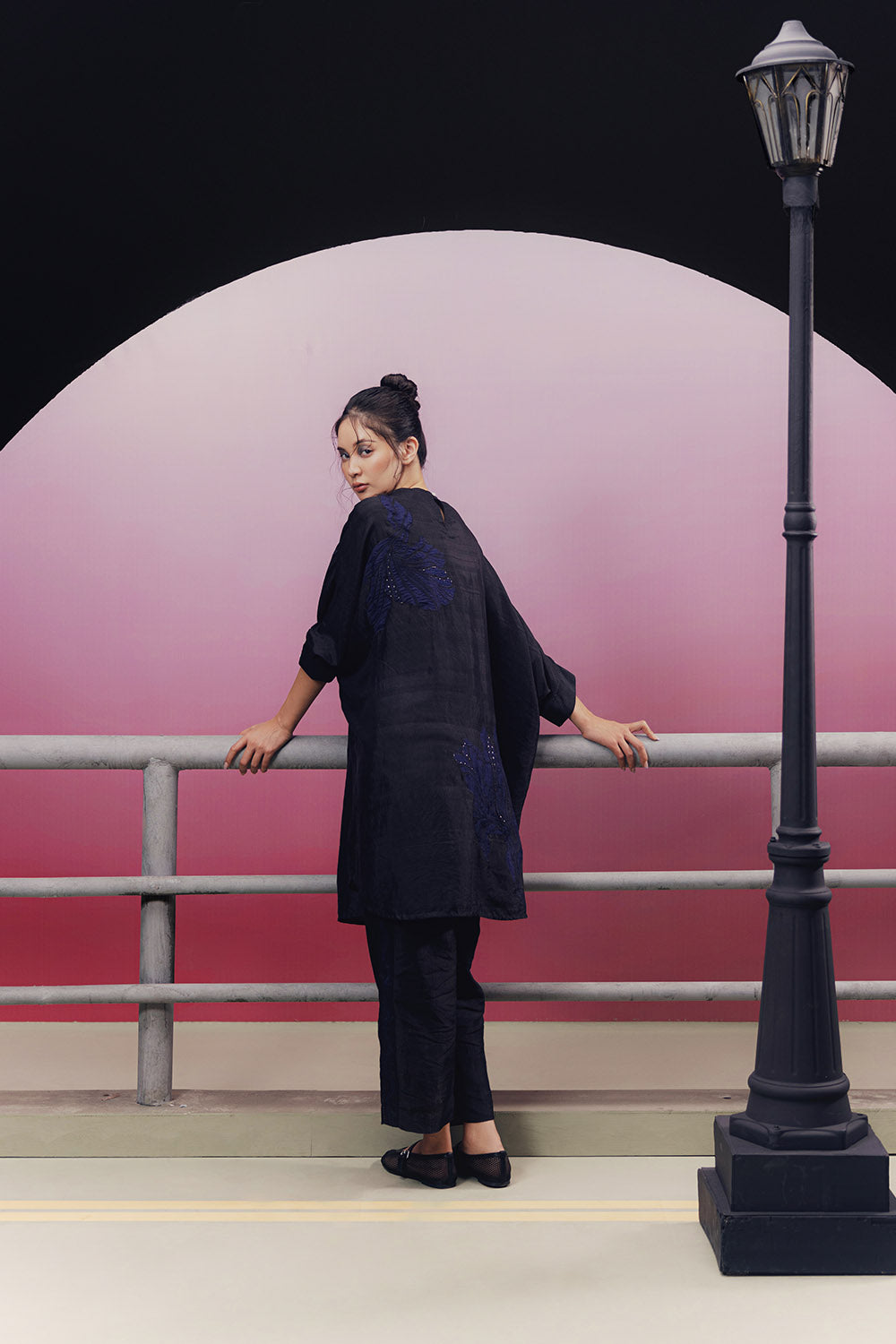 Handwoven silk free-size tunic co-ord set with applique on the tunic and the pant borders. The applique is highlighted with bead work.