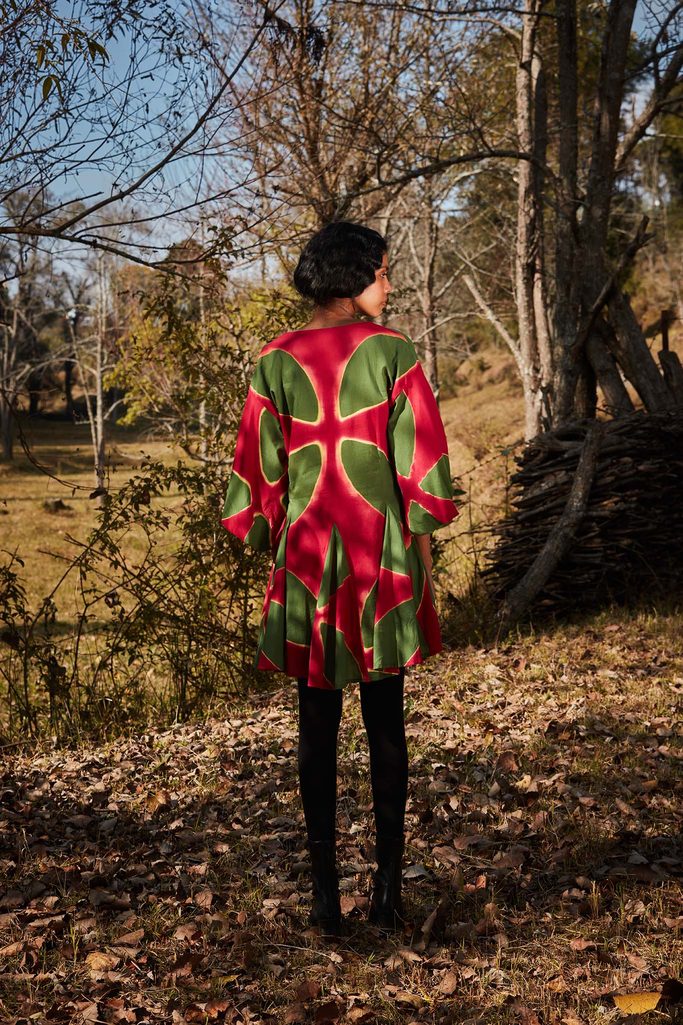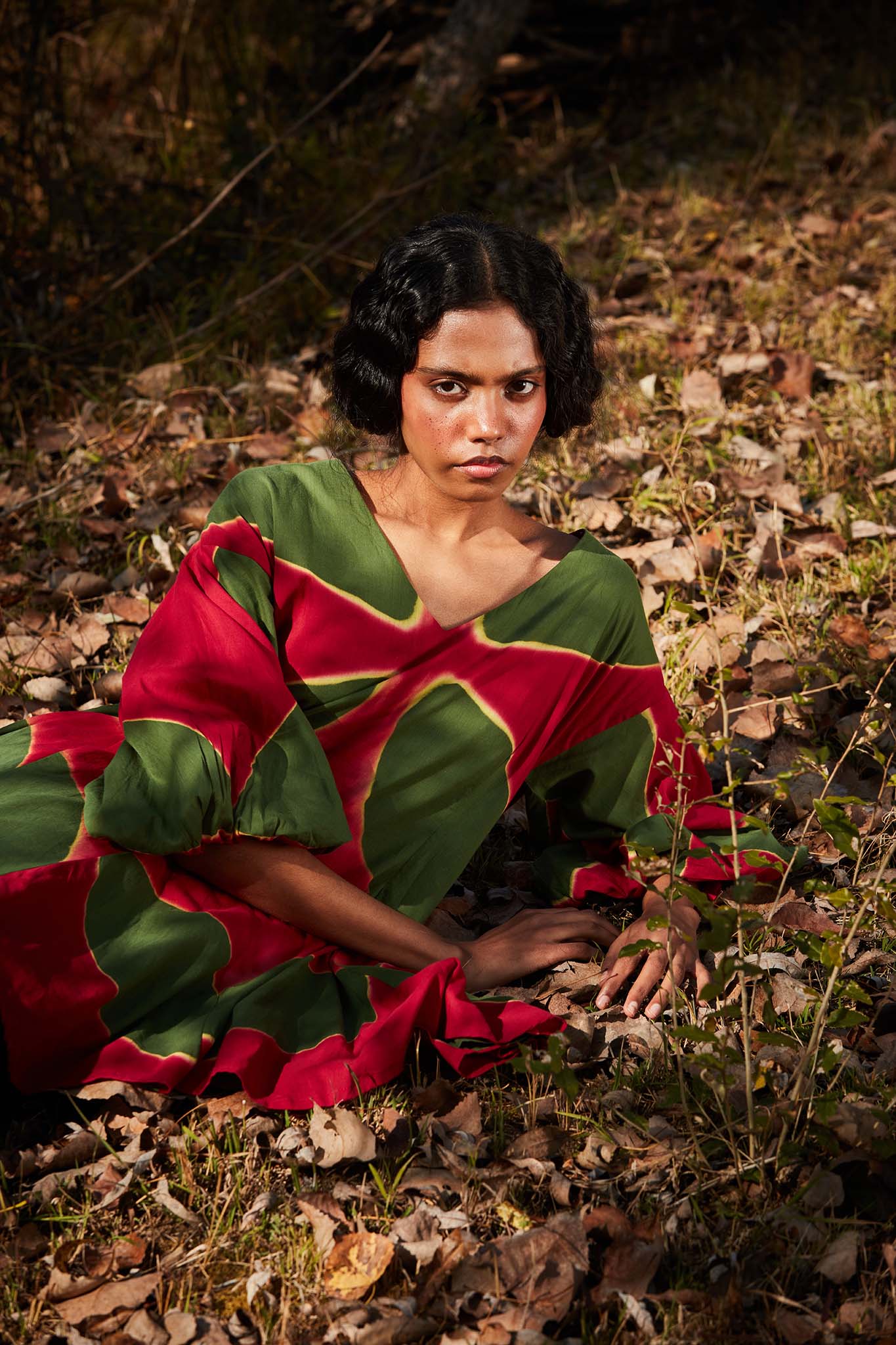 A one-of-a-kind vibrant cotton Shibori dress, dyed in pink and green, featuring puffy elasticated sleeves and a flattering V-neckline for a bold, distinctive look.