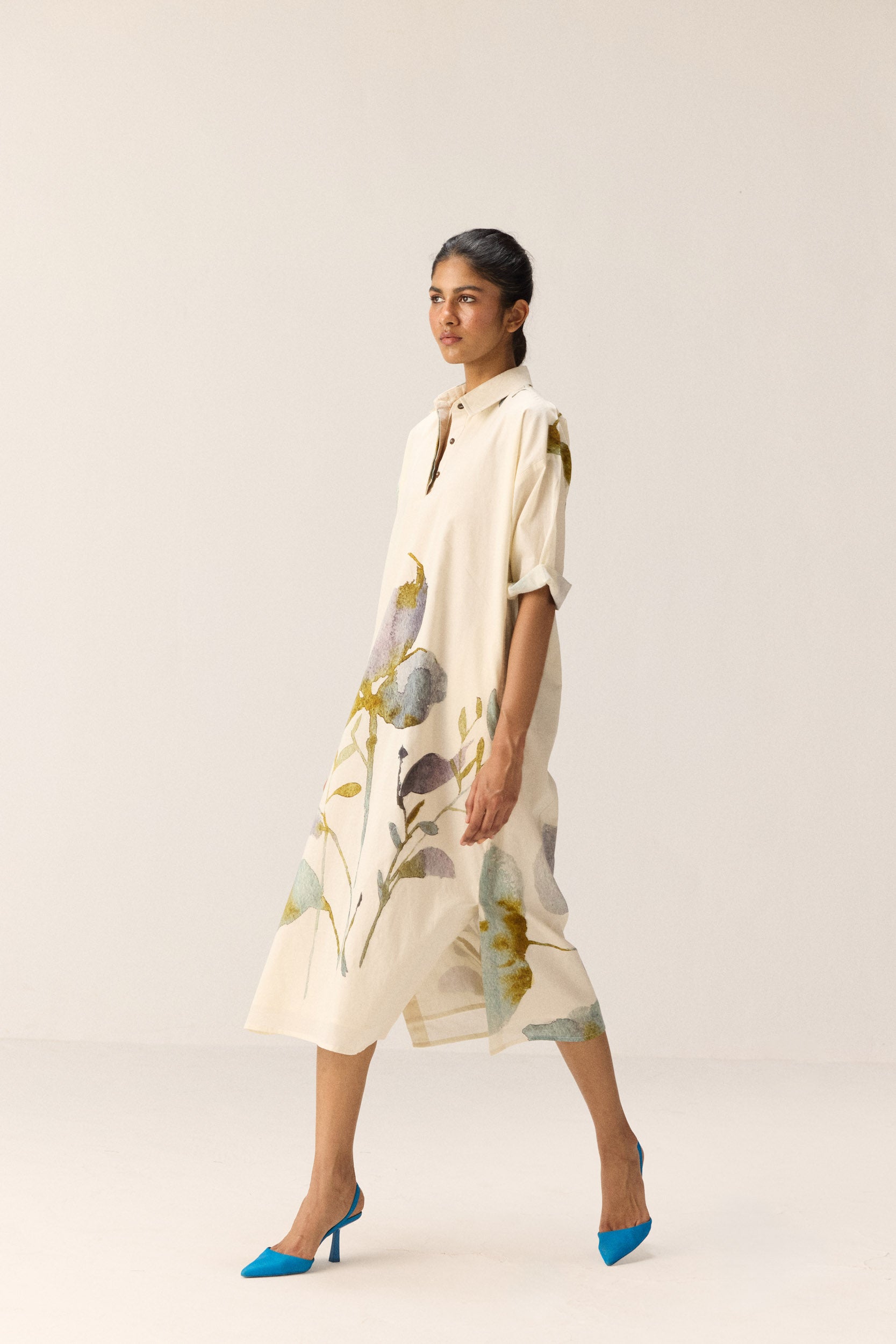 An elegant off-white dress crafted in soft cotton mul, featuring a structured collar and three-button placket on the front. Hand-painted floral motifs add a subtle charm to the bodice, bringing a touch of artistry to this everyday silhouette.