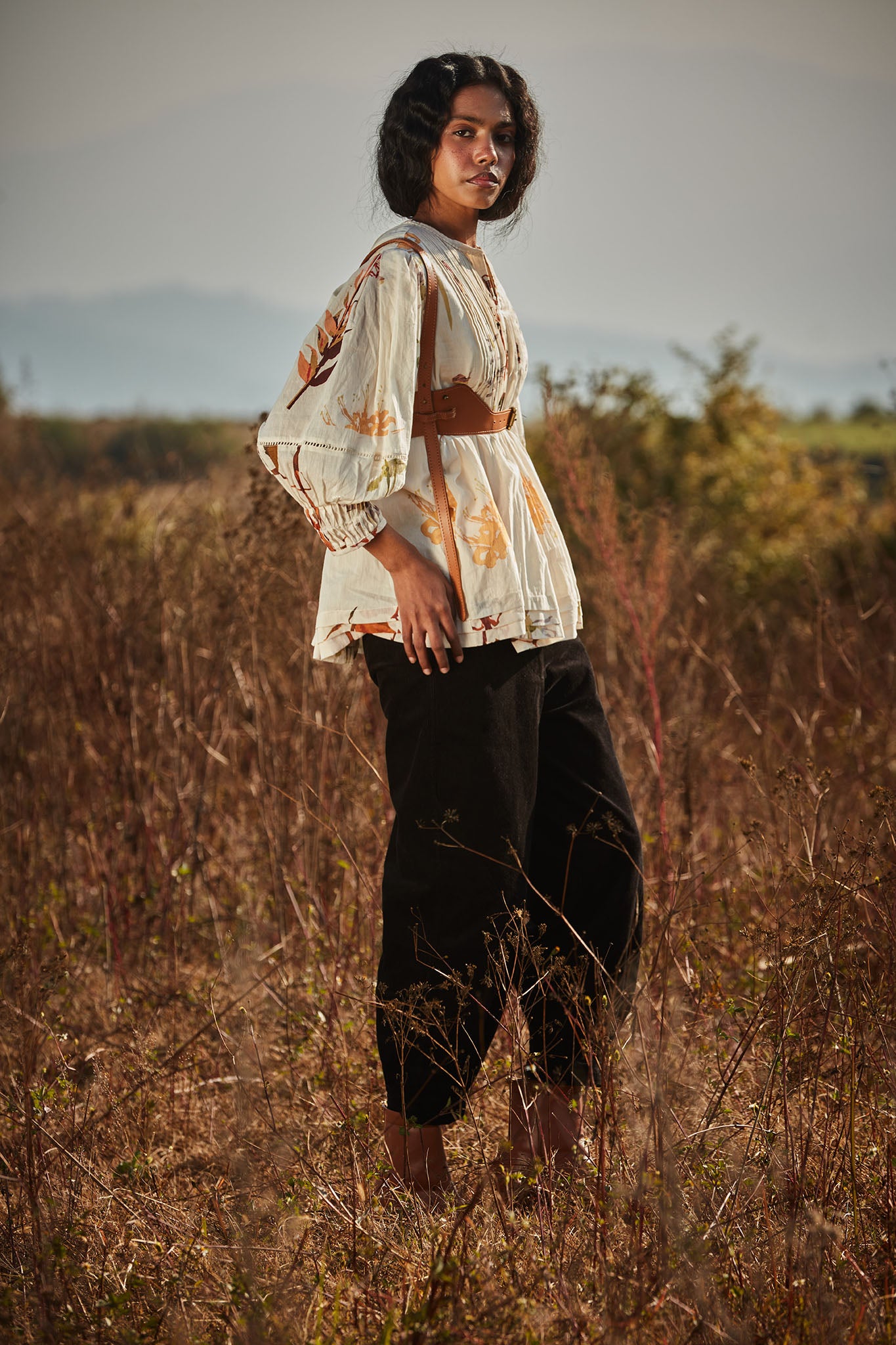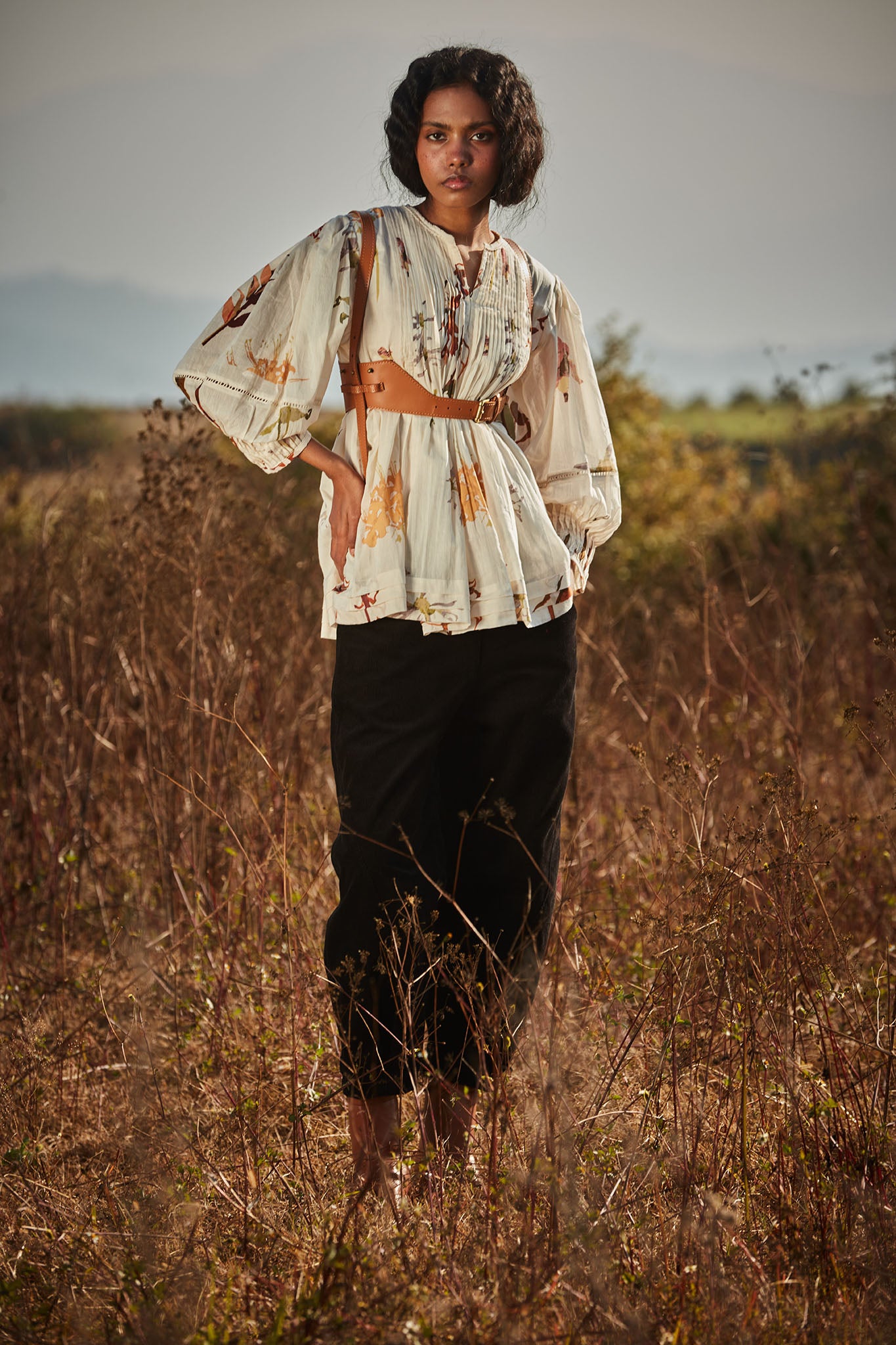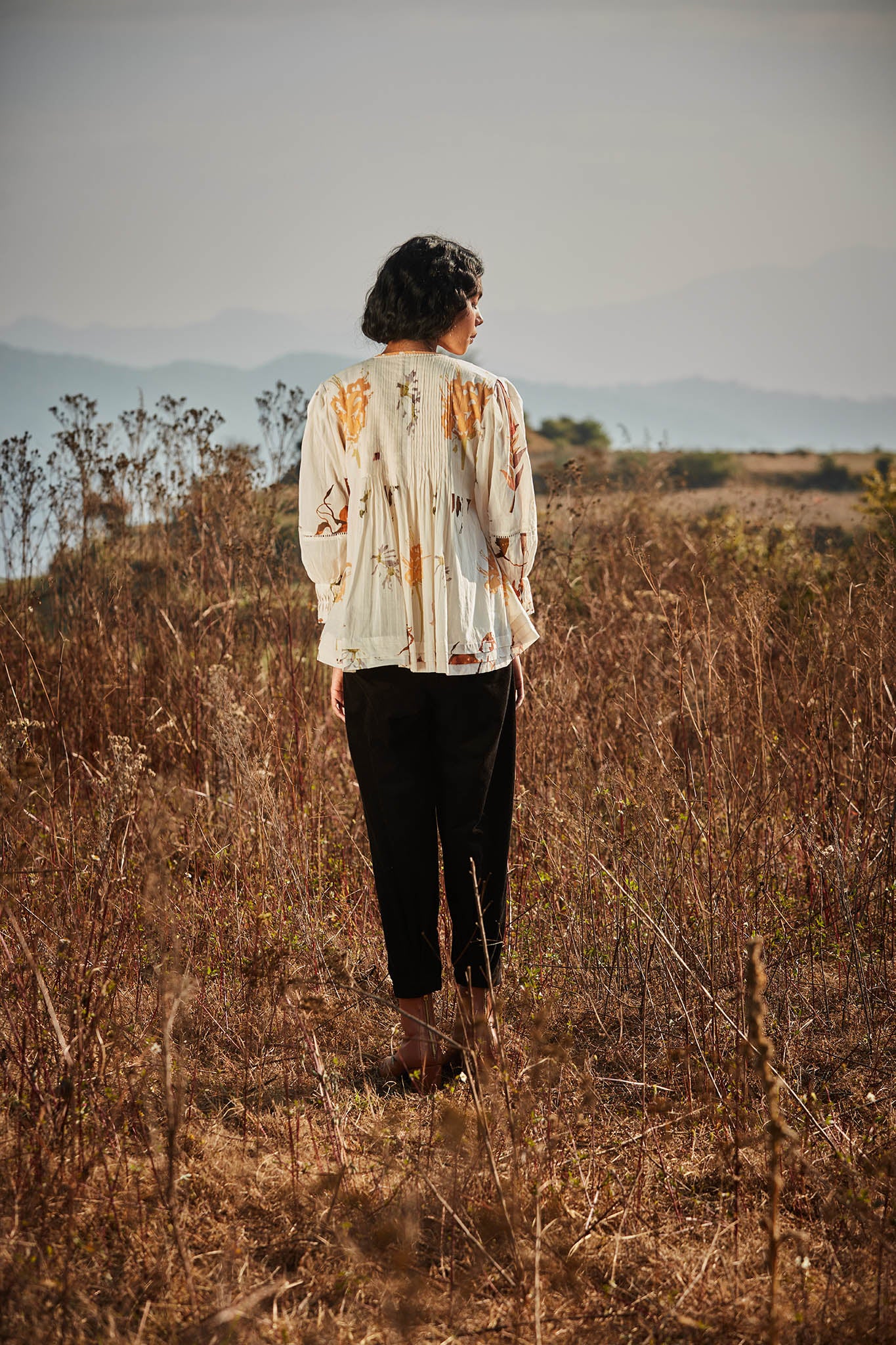 An off-white top with a delicate floral print that evokes the image of flowers scattered across snow. It features pin tuck detailing on the front, back and sleeves, adding subtle texture and elegance.