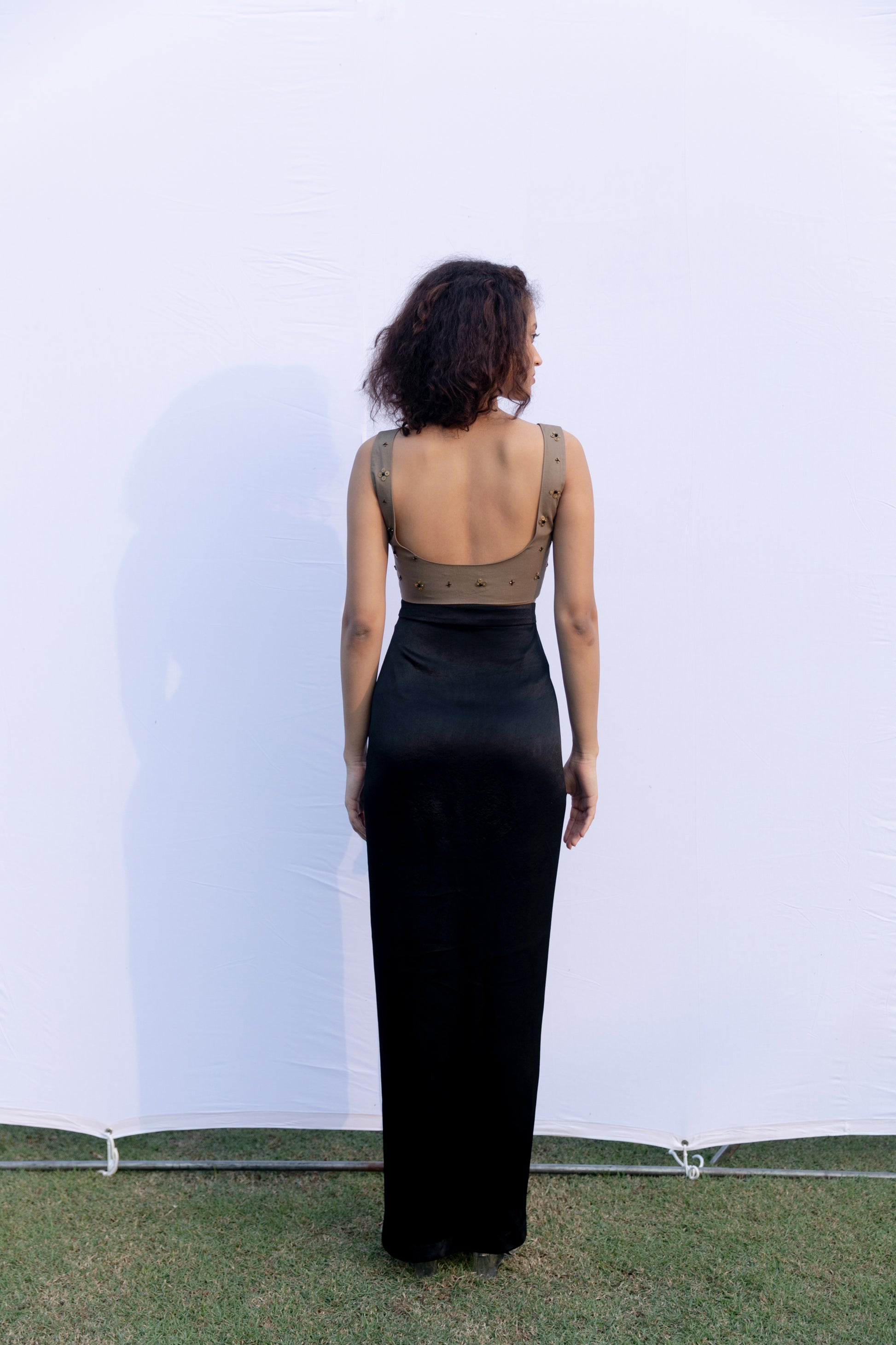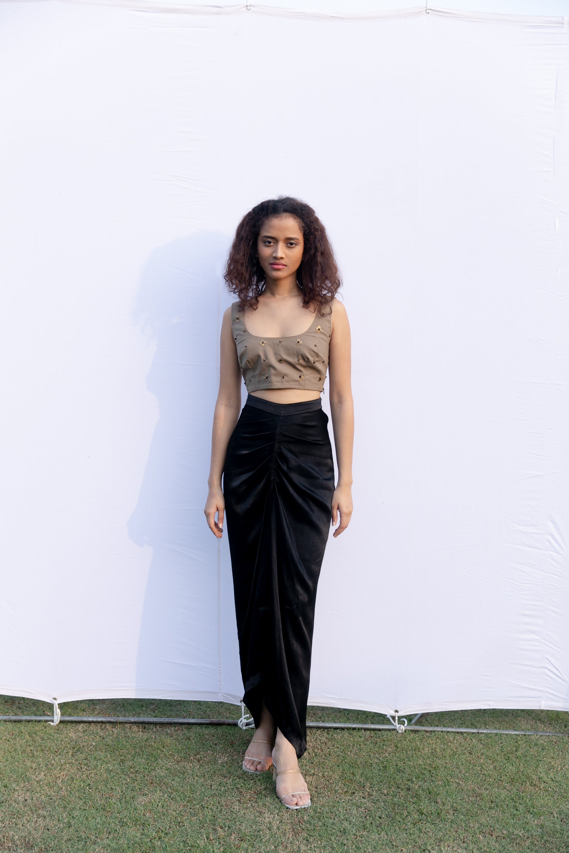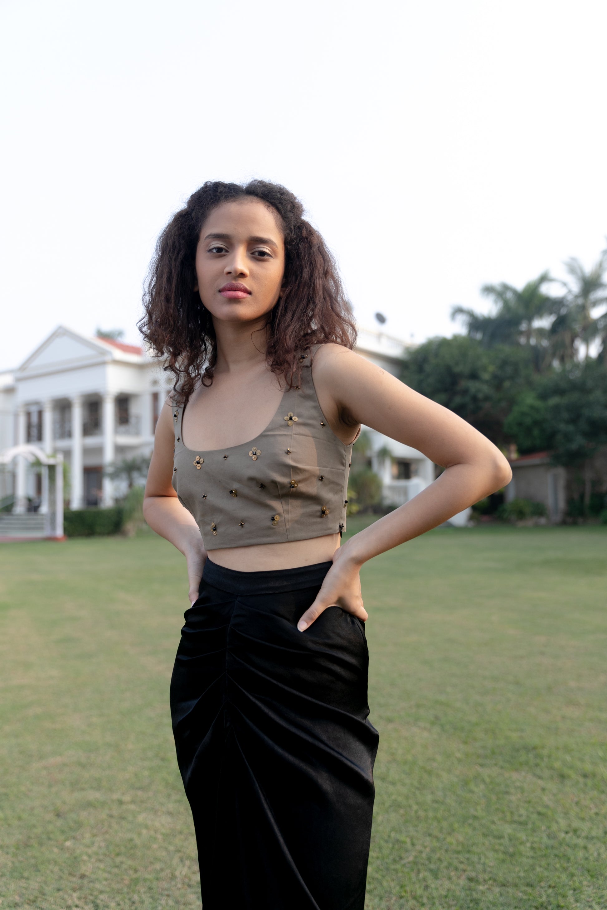 Hand embroidered metal bead cotton crop top with an
