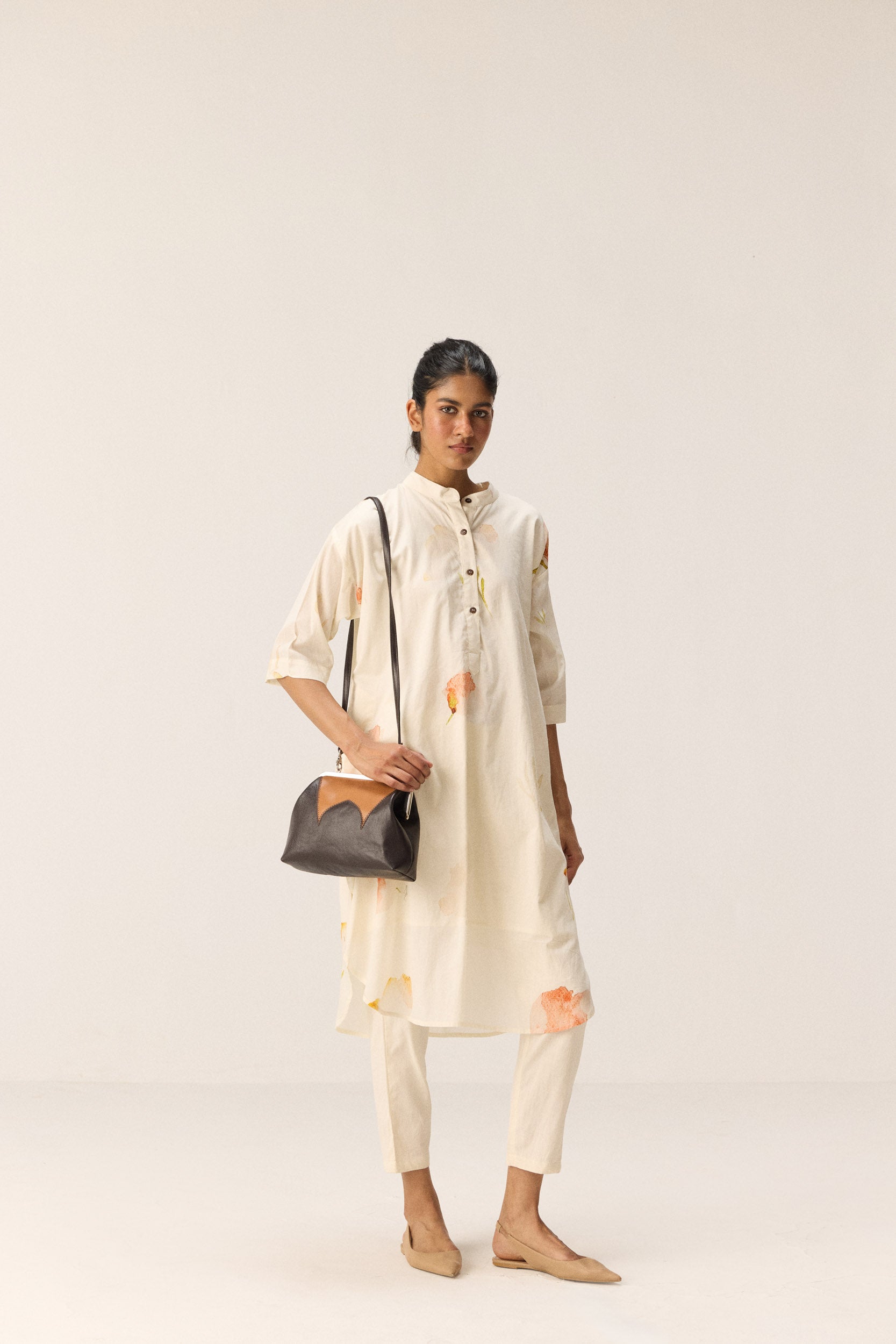 An off white floral printed kurta set with front button opening crafted in soft cotton mul paired with cotton mul pencil pants fully elasticated.
