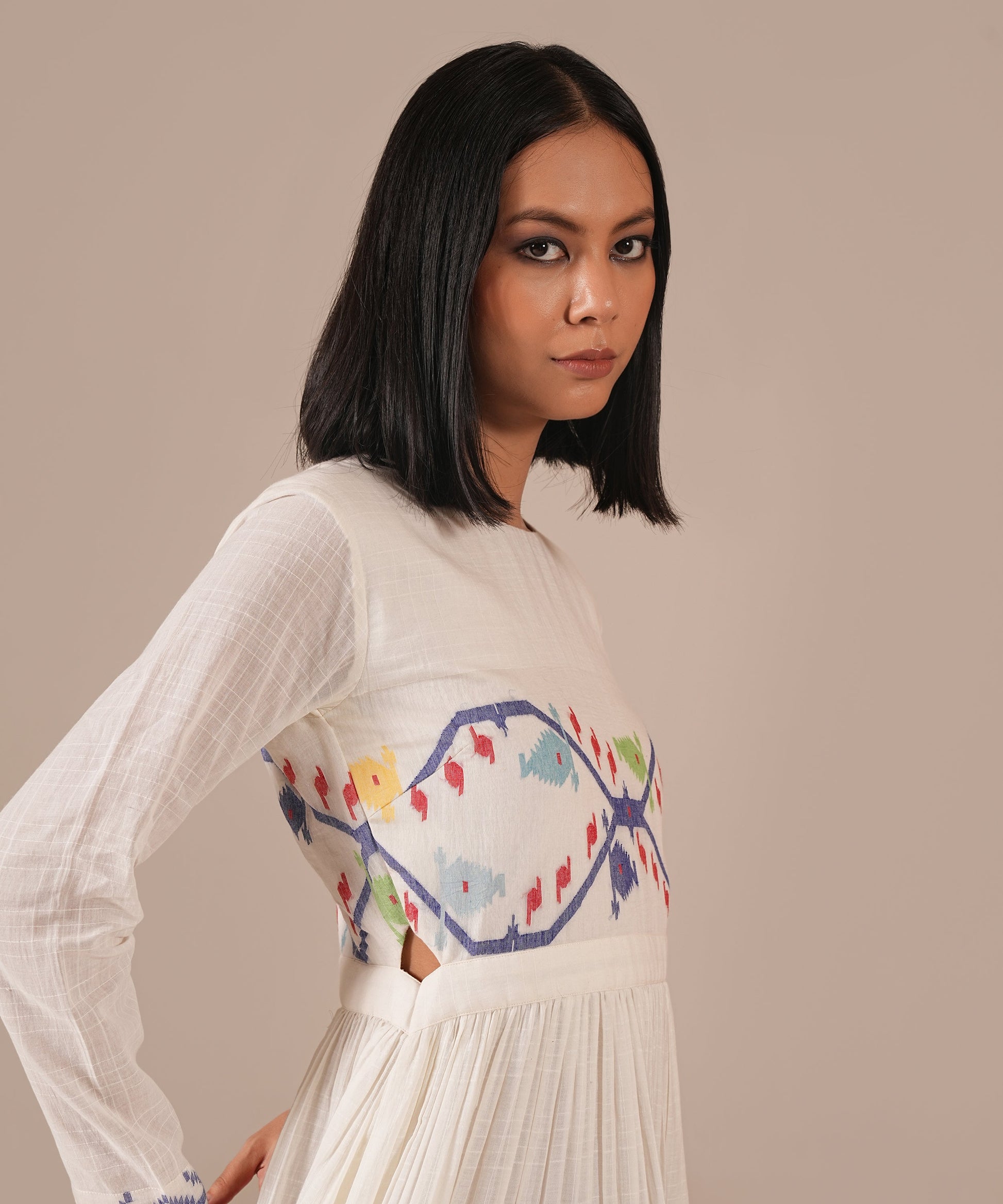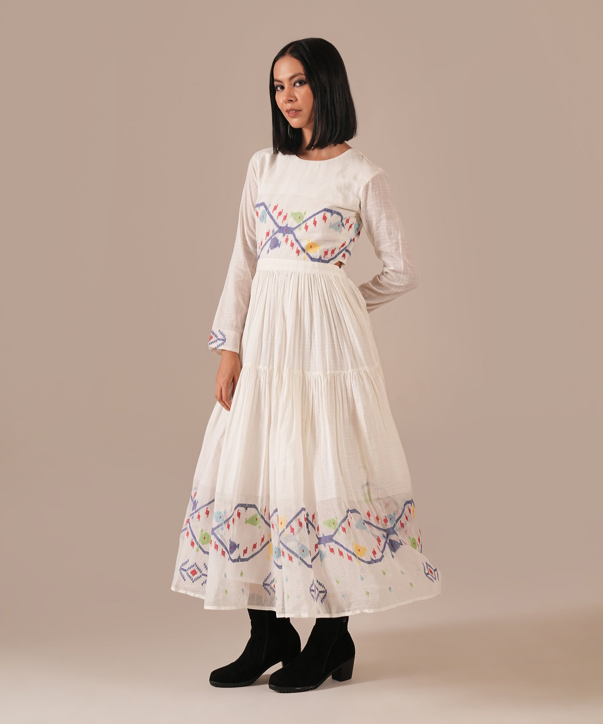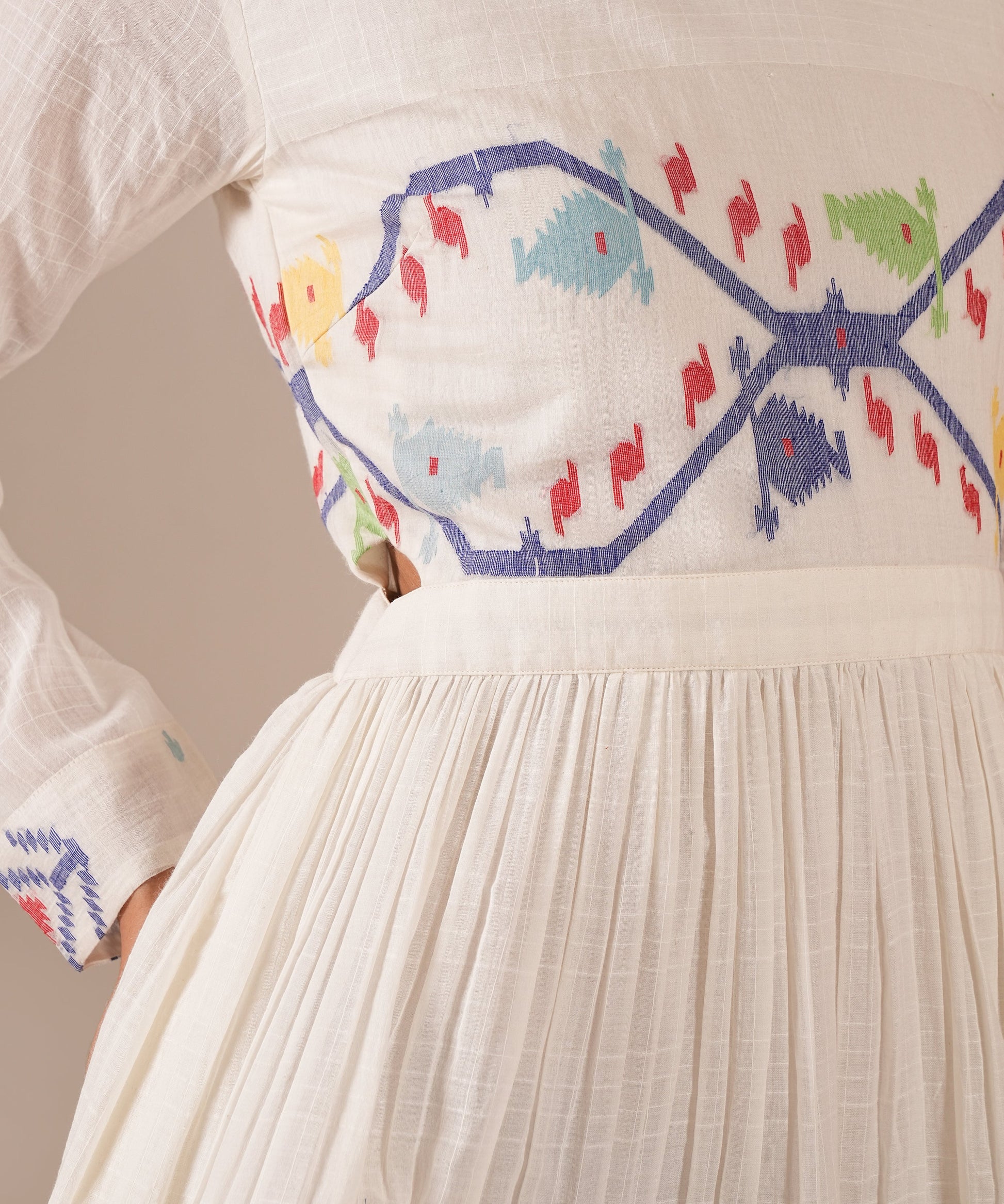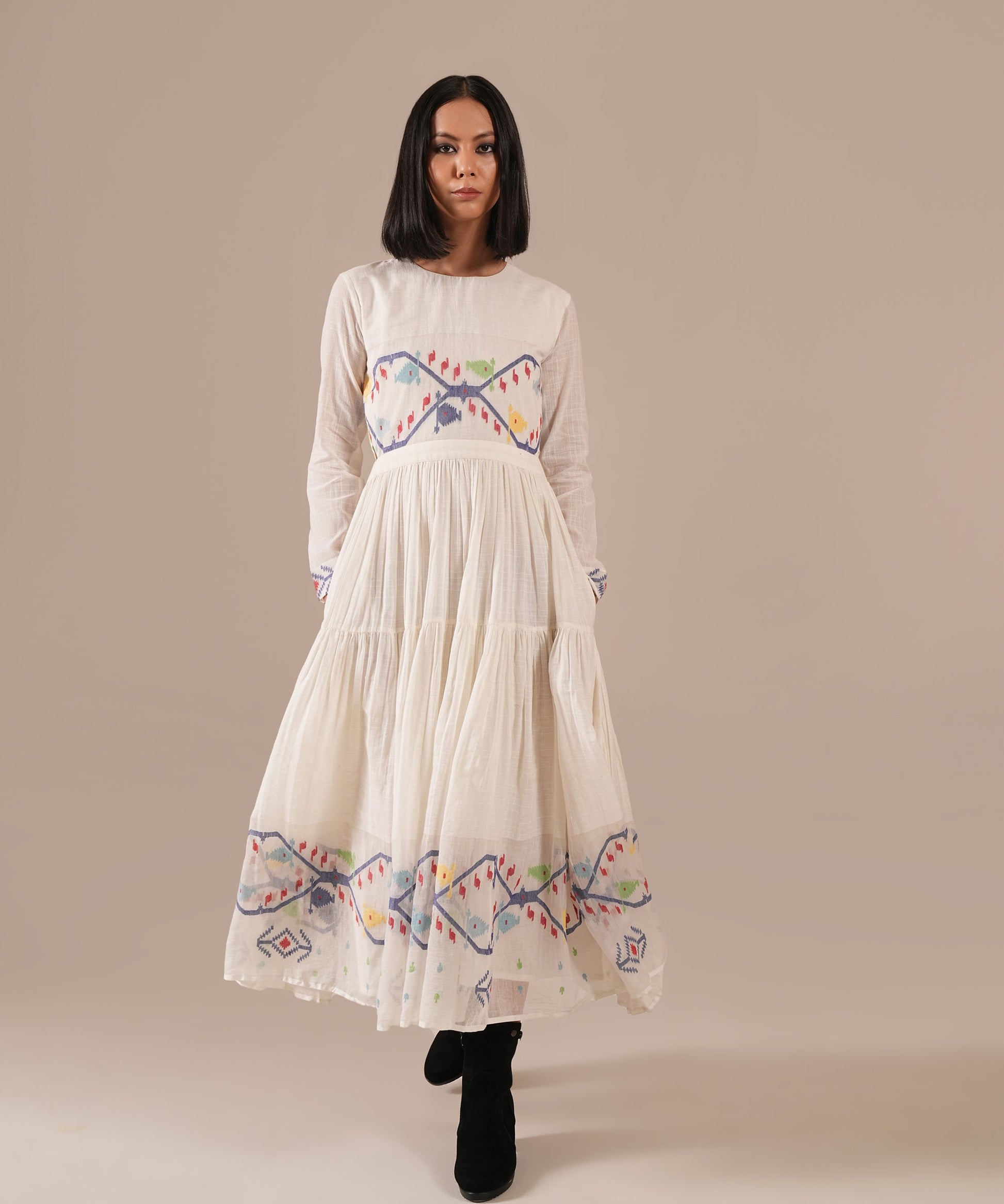 An attire that stands for its glamour and effortlessness features a fitted bodice, round neck, full sleeves, back zipper fastening, and skin-barring cut out at the waist that comes with a voluminous tiered silhouette. Handwoven by Indian artisans, the dress comes with side pockets.