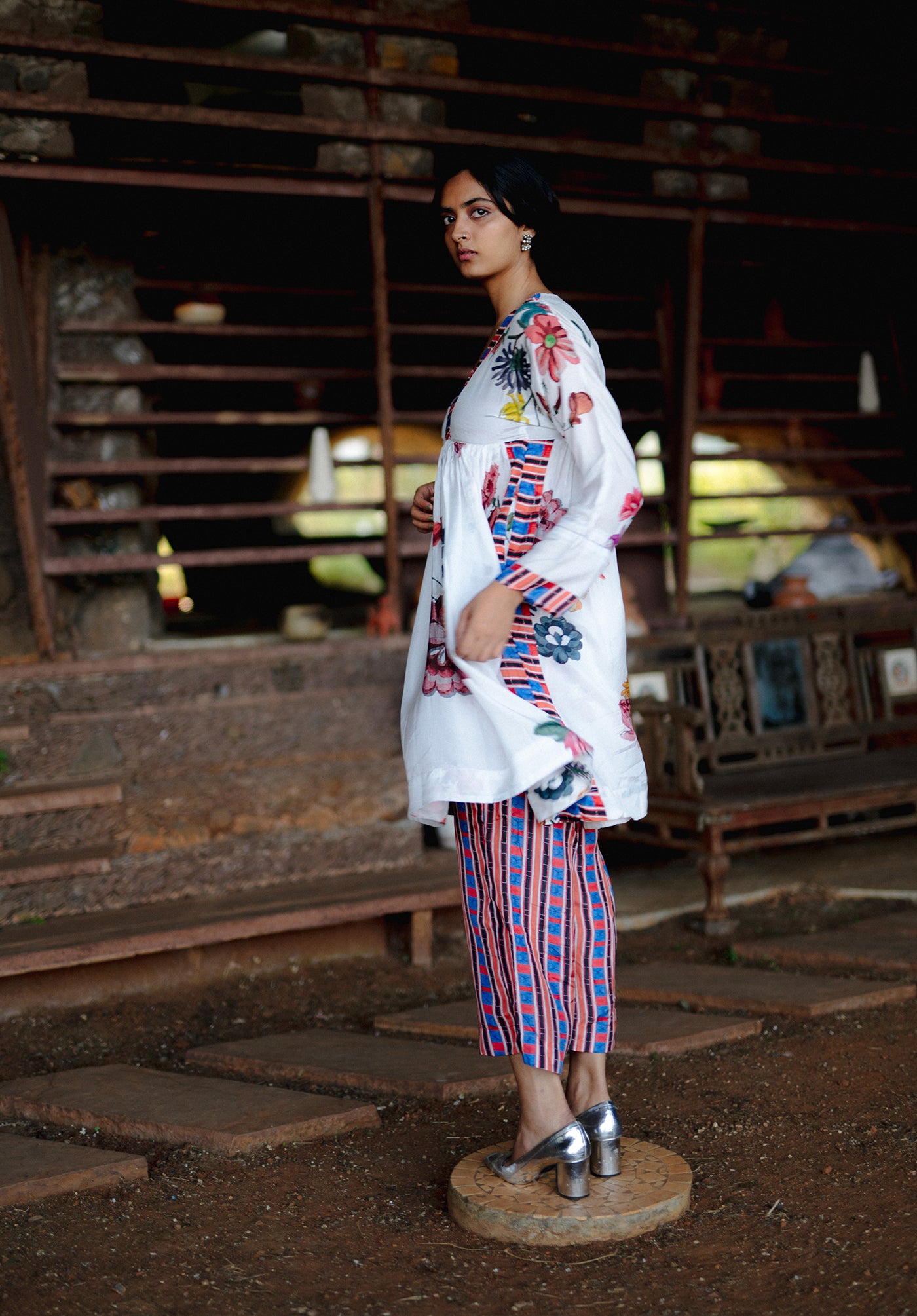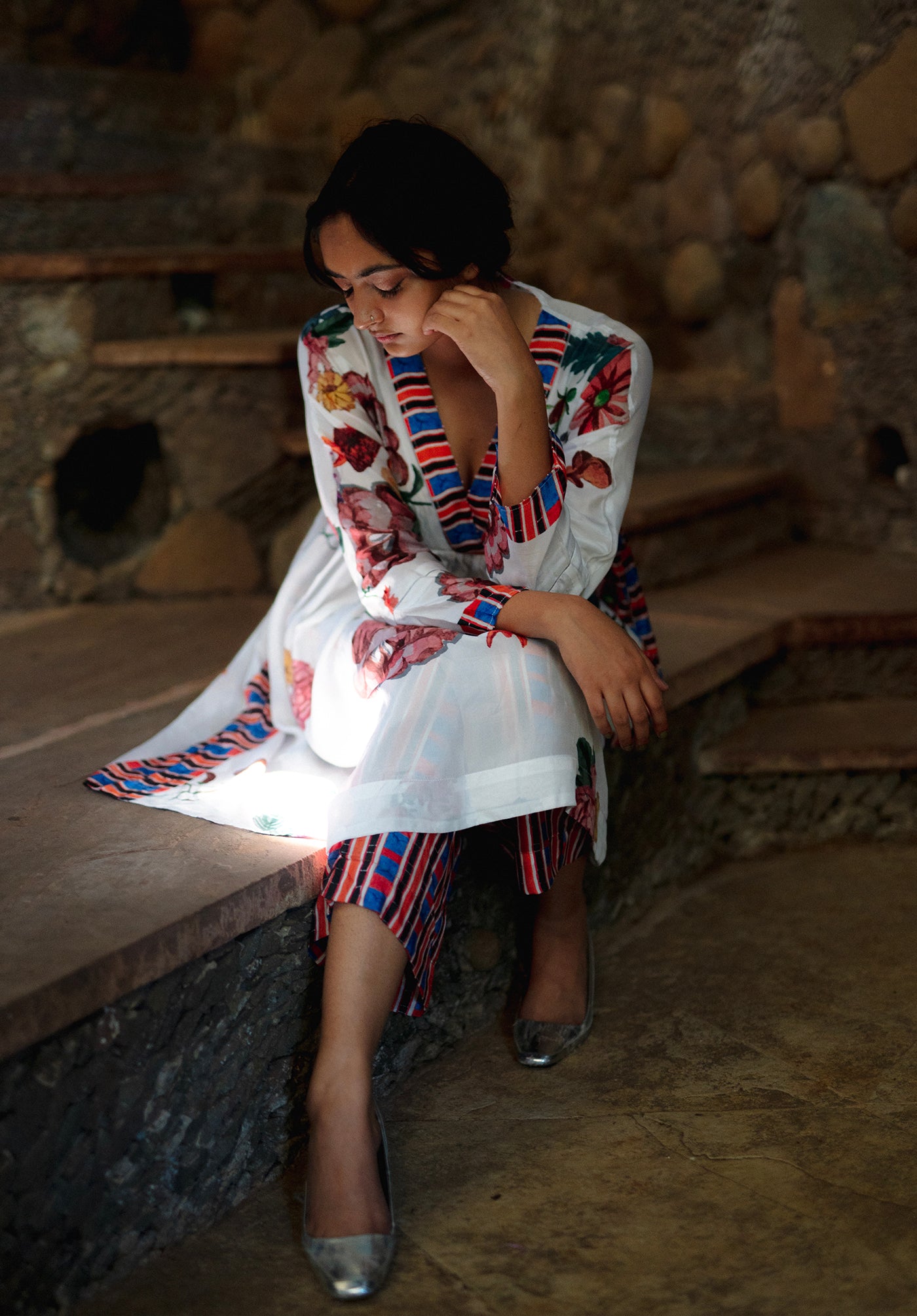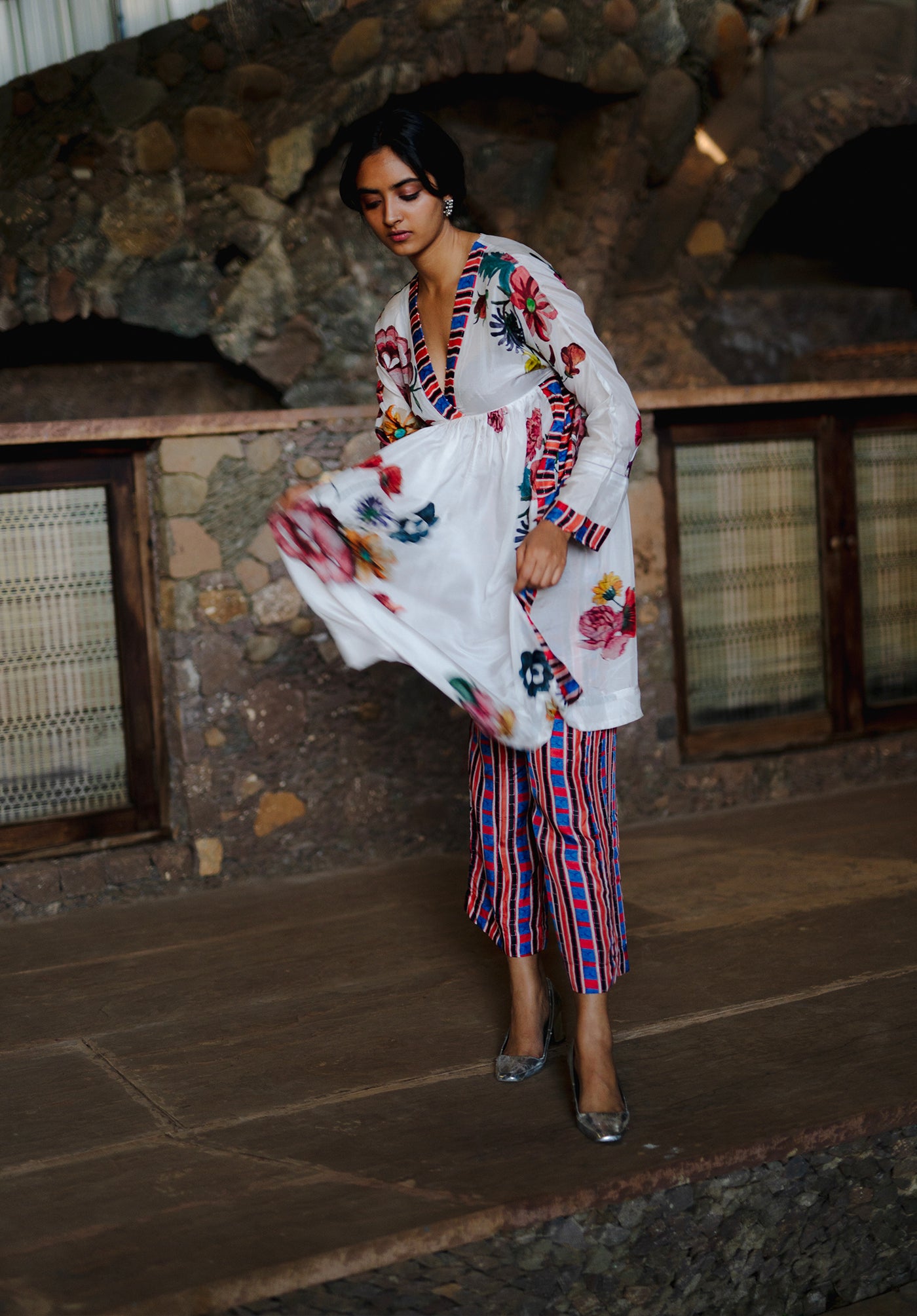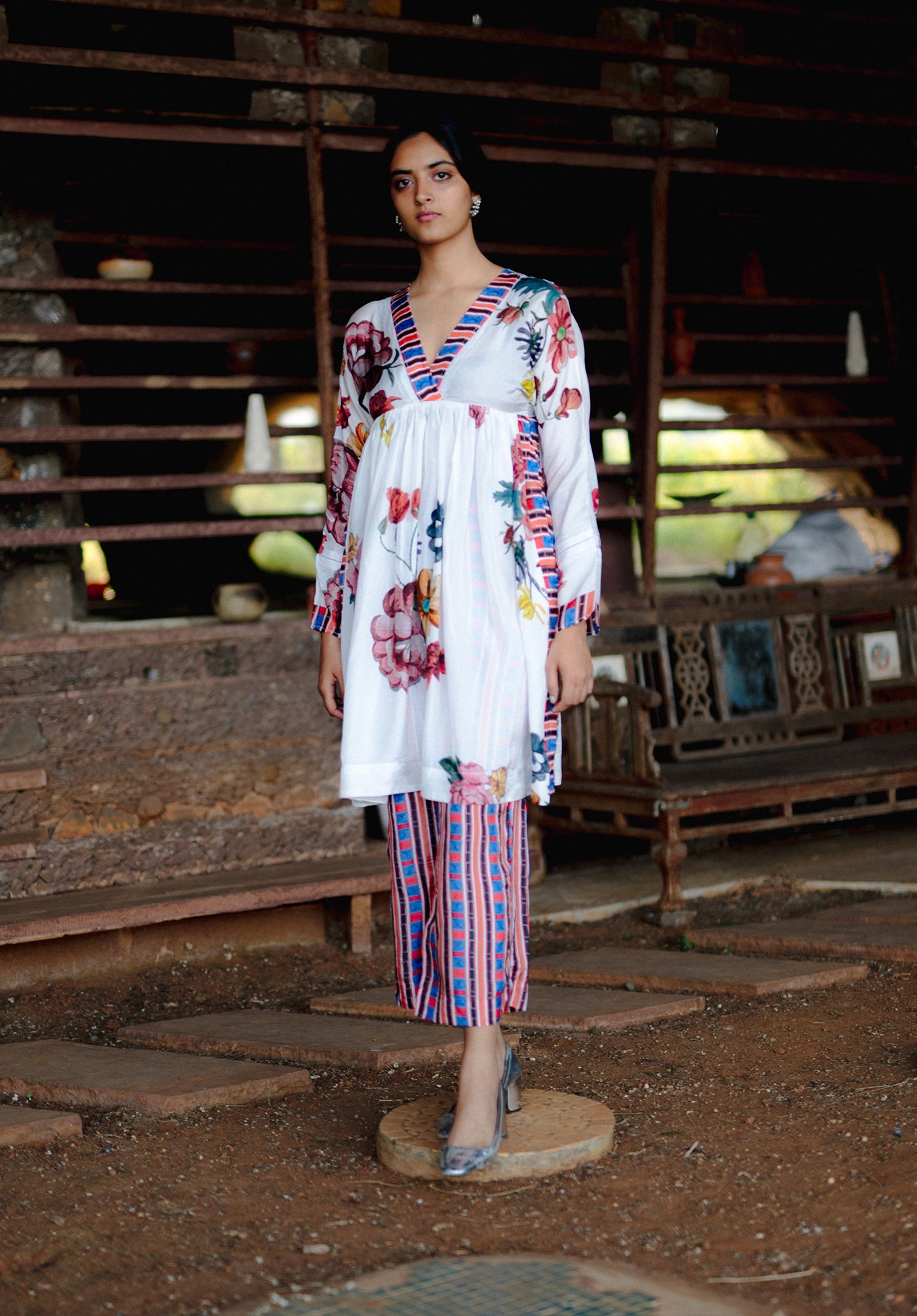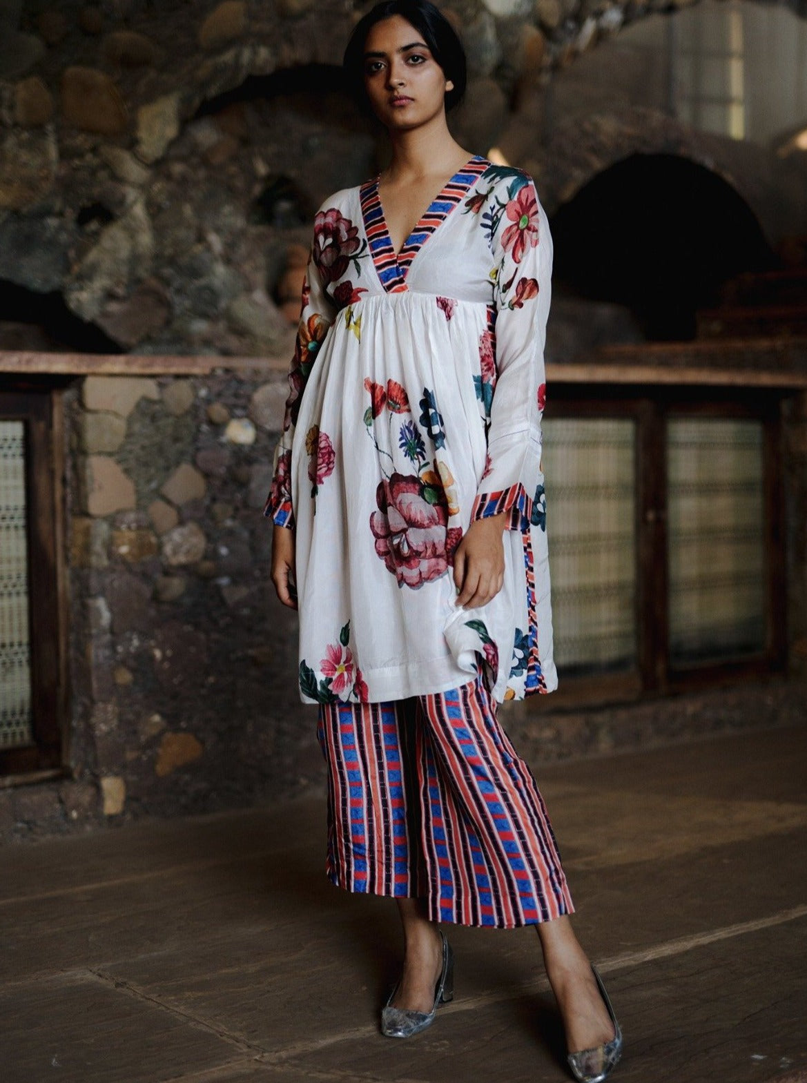 The Garden of paradise set in pure silk features handpainted florals arranged tastefully in bouquets all throughout a stark white background with a multicolor striped on the neckline and side seam. It is finished with delicate beading on the neck and the sleeves. The pants are completely printed in the multi color stripe print.