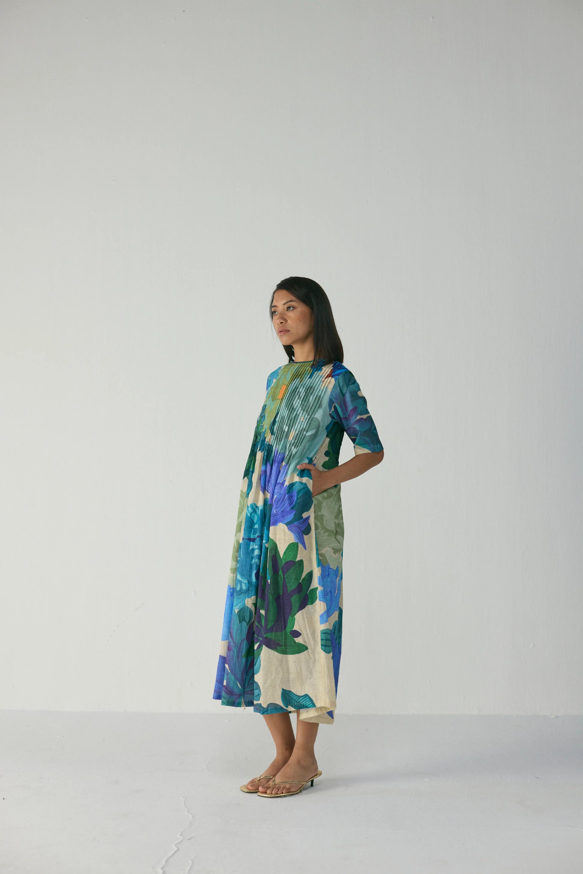 Effortlessly modern and undeniably comfortable, this A-line midi dress blends relaxed sophistication with artistic charm. Featuring a straight, easy silhouette and short sleeves, the dress is designed with soft pleated detailing along the front yoke, adding subtle structure and visual interest. Crafted from a breathable, lightweight fabric that moves fluidly, this dress is ideal for everyday wear, travel, or elevated casual outings. Functional side pockets make it as practical as it is stylish.