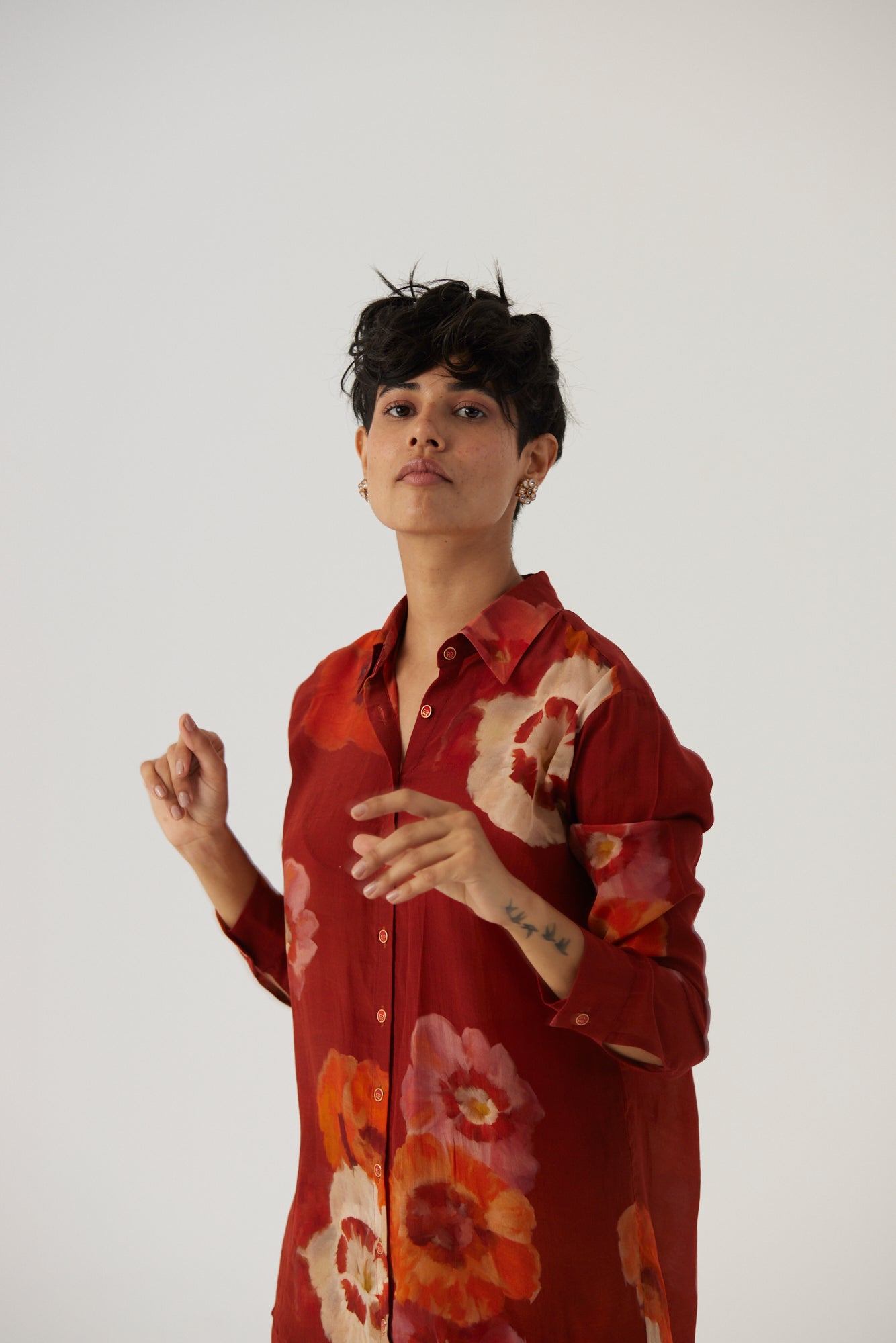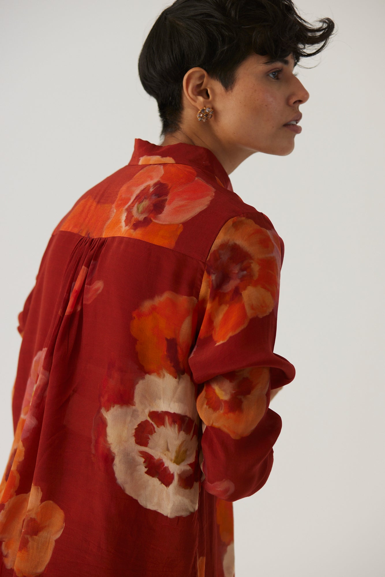 This print of the dress is crafted in blood red colour with shades of massive poppies carefully printed on crepe. This dress is designed as a midi length dress with some gathers and a button at the back end of the neckline with a puff sleeve.