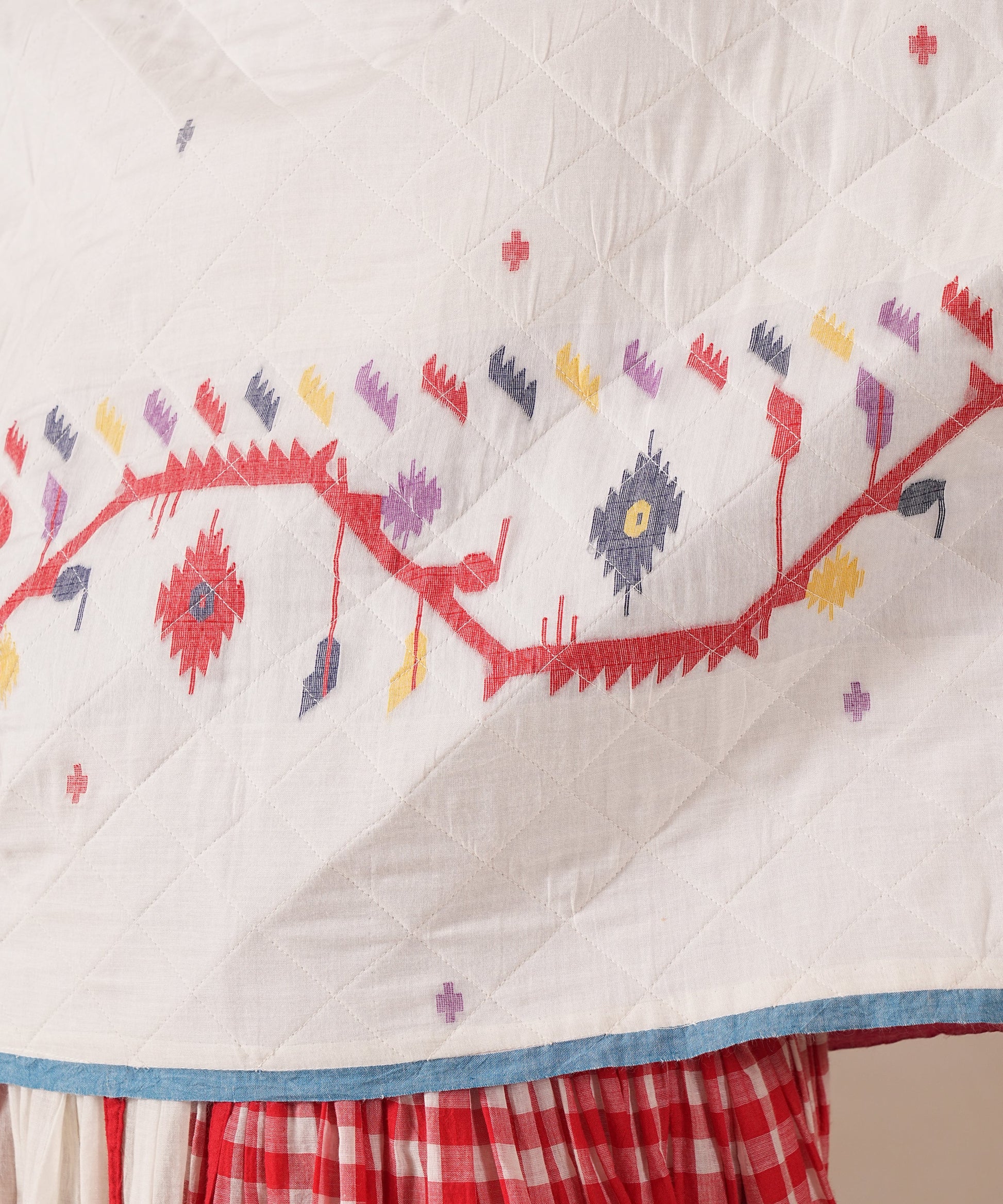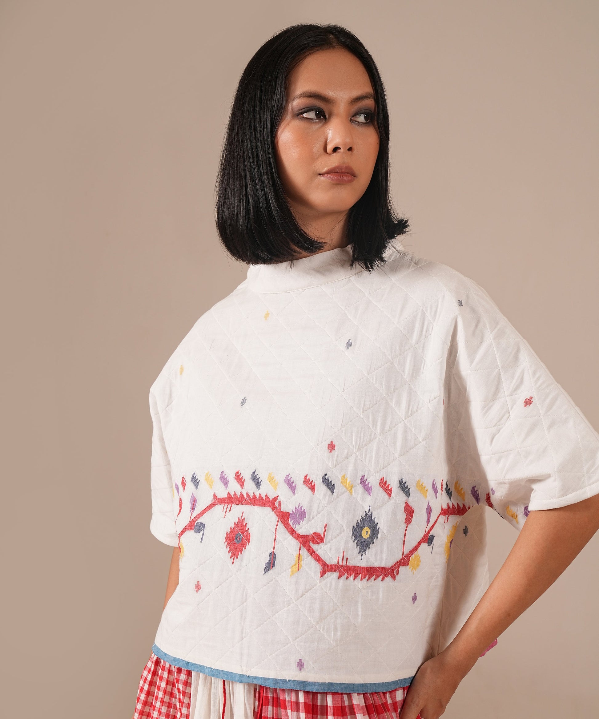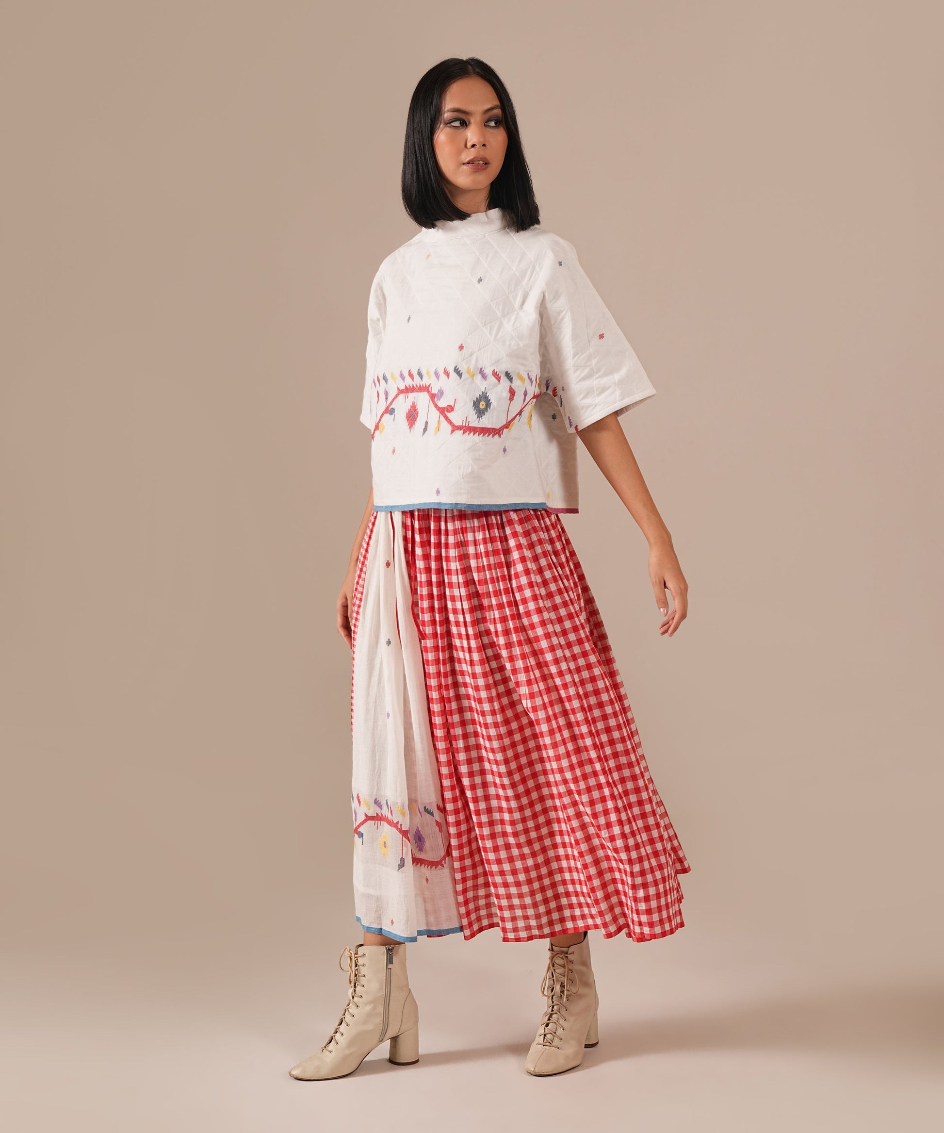 A classic Jamdani ensemble with a quilted boxy top and gathered skirt, enhanced by contrast panel detailing, an elasticated waist, and side pockets, a perfect harmony of artisanal craftsmanship and modern sophistication.