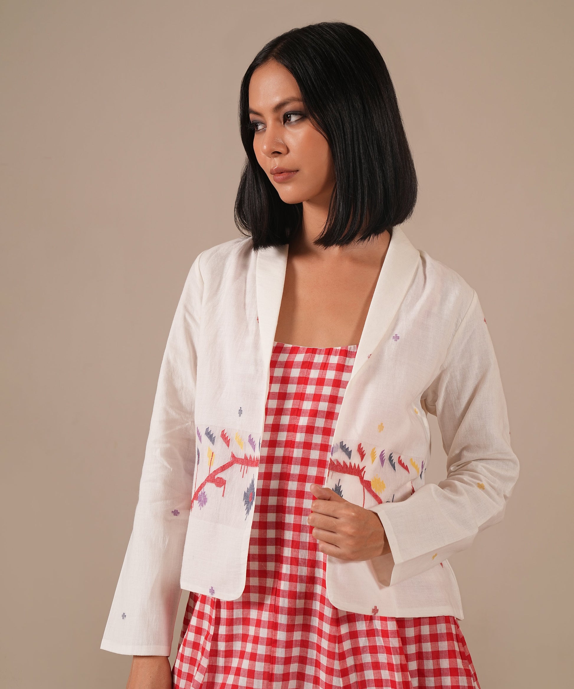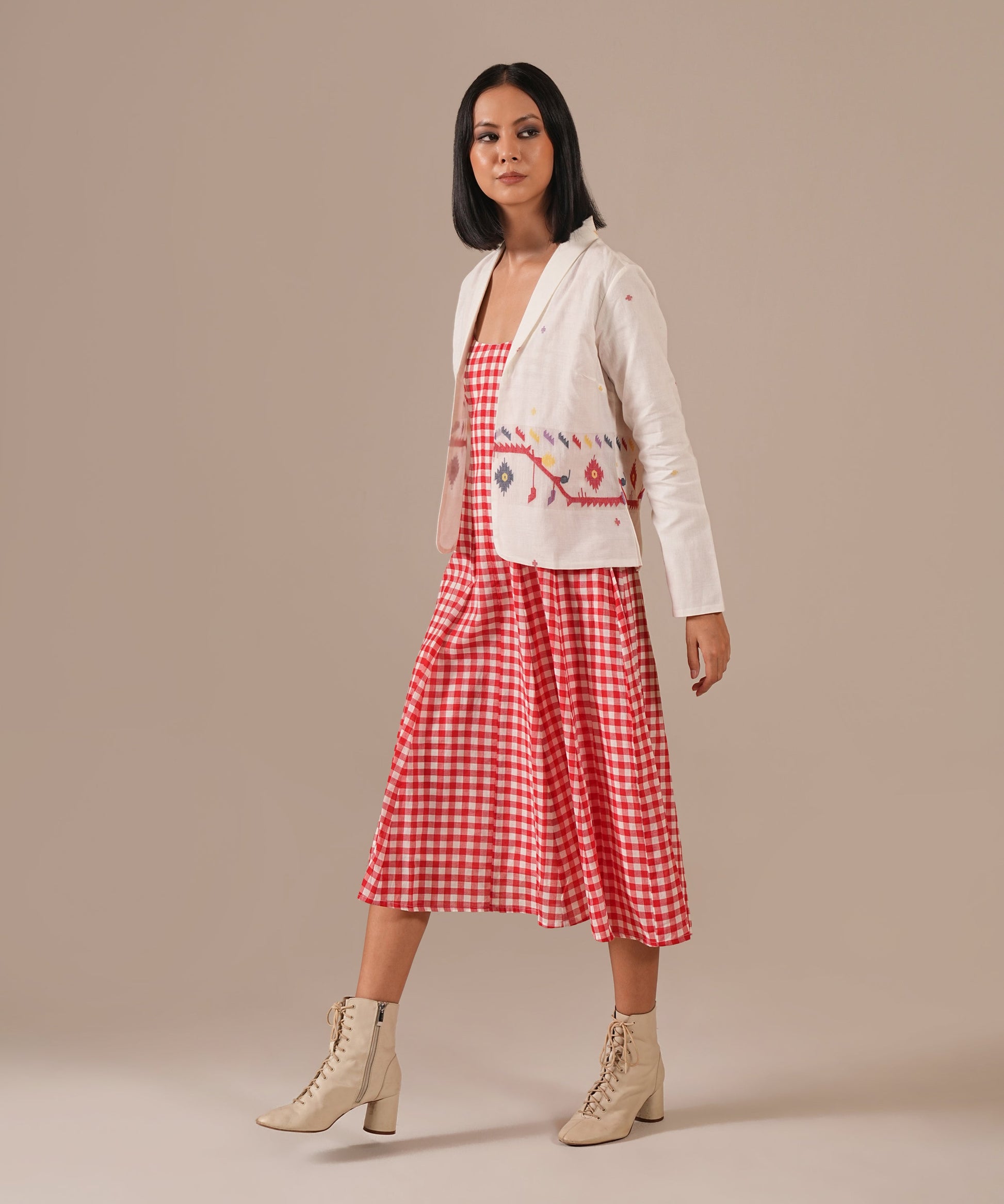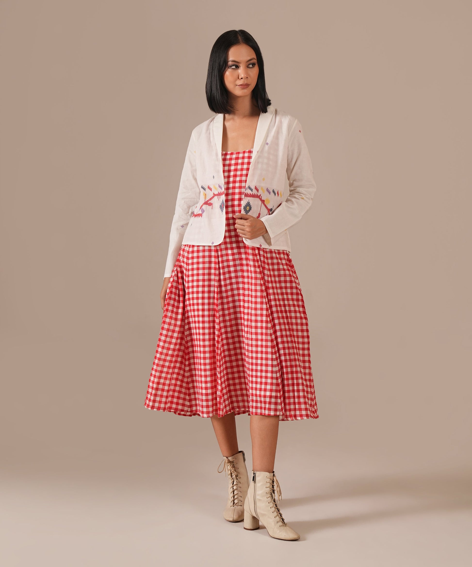 The jamdani fit-and-flare ensemble featuring a deep square neck dress with back zipper fastening, and kali/panel detailing, and a jamdani co-ord jacket that is perfect for your summer.