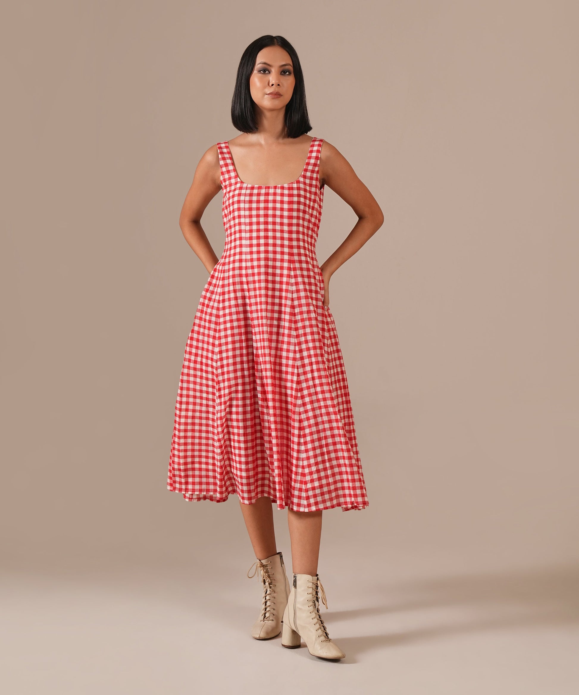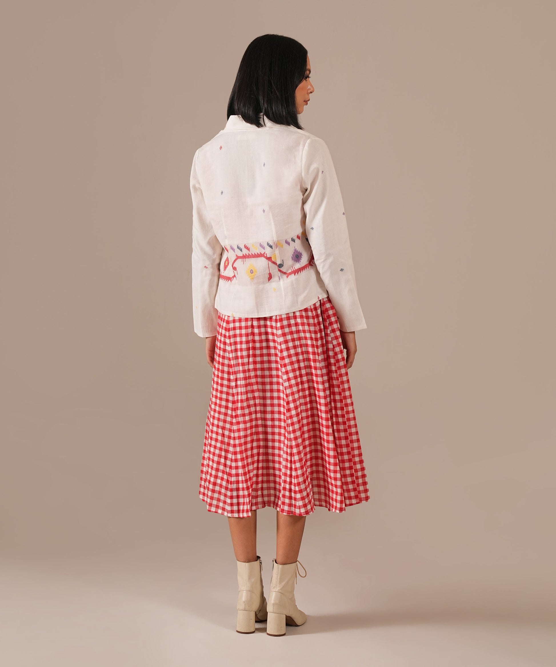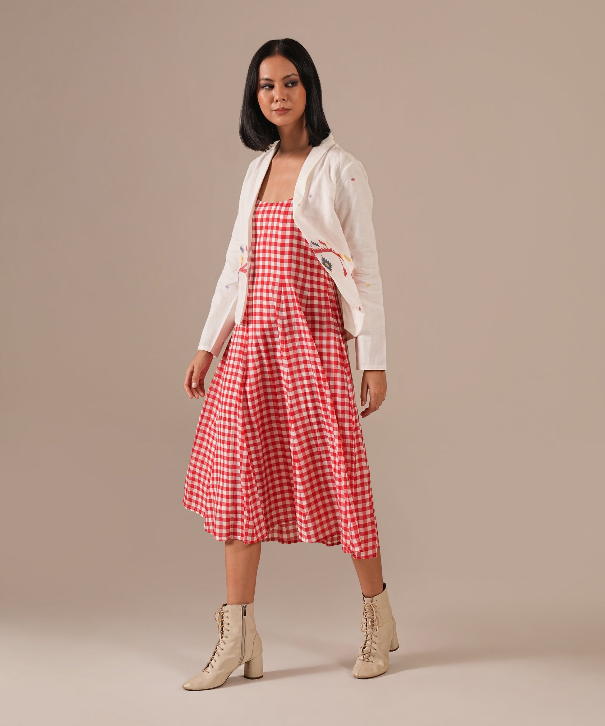 The jamdani fit-and-flare ensemble featuring a deep square neck dress with back zipper fastening, and kali/panel detailing, and a jamdani co-ord jacket that is perfect for your summer.