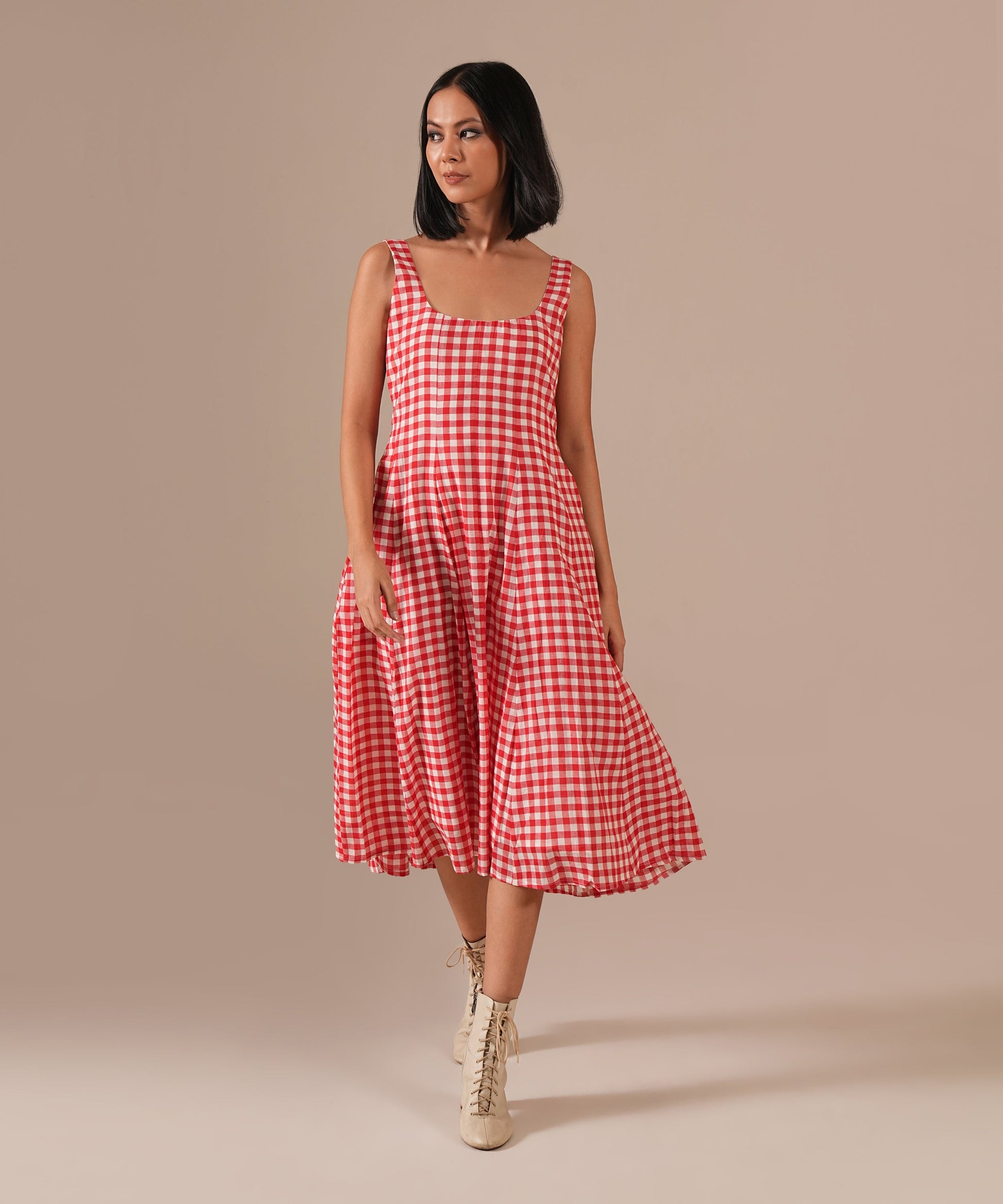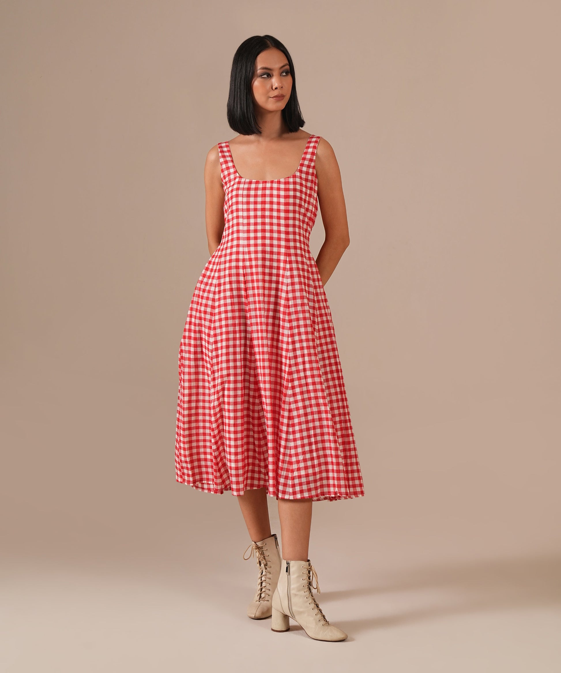 A classic fit-and-flare dress featuring a deep square neckline, back zipper fastening, elegant kali panel detailing, and functional side pockets, a seamless blend of timeless style and modern sophistication.