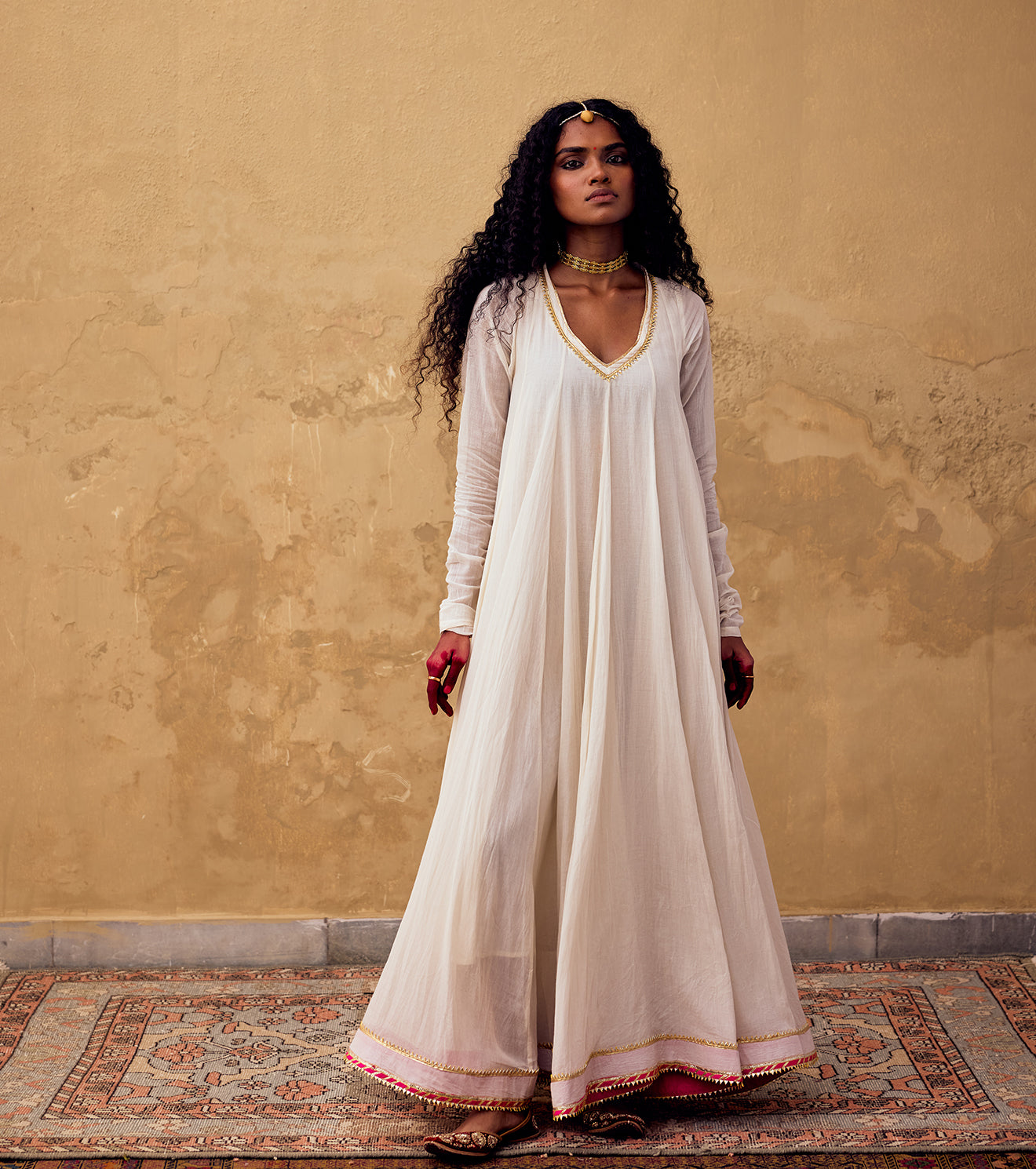 A voluminous off white maxi dress with bijiya gota detailing in the neckline , hemline and cuffs featuring a bright pink contrast detail at the hemline crafted from breathable soft cotton mul fabric.
