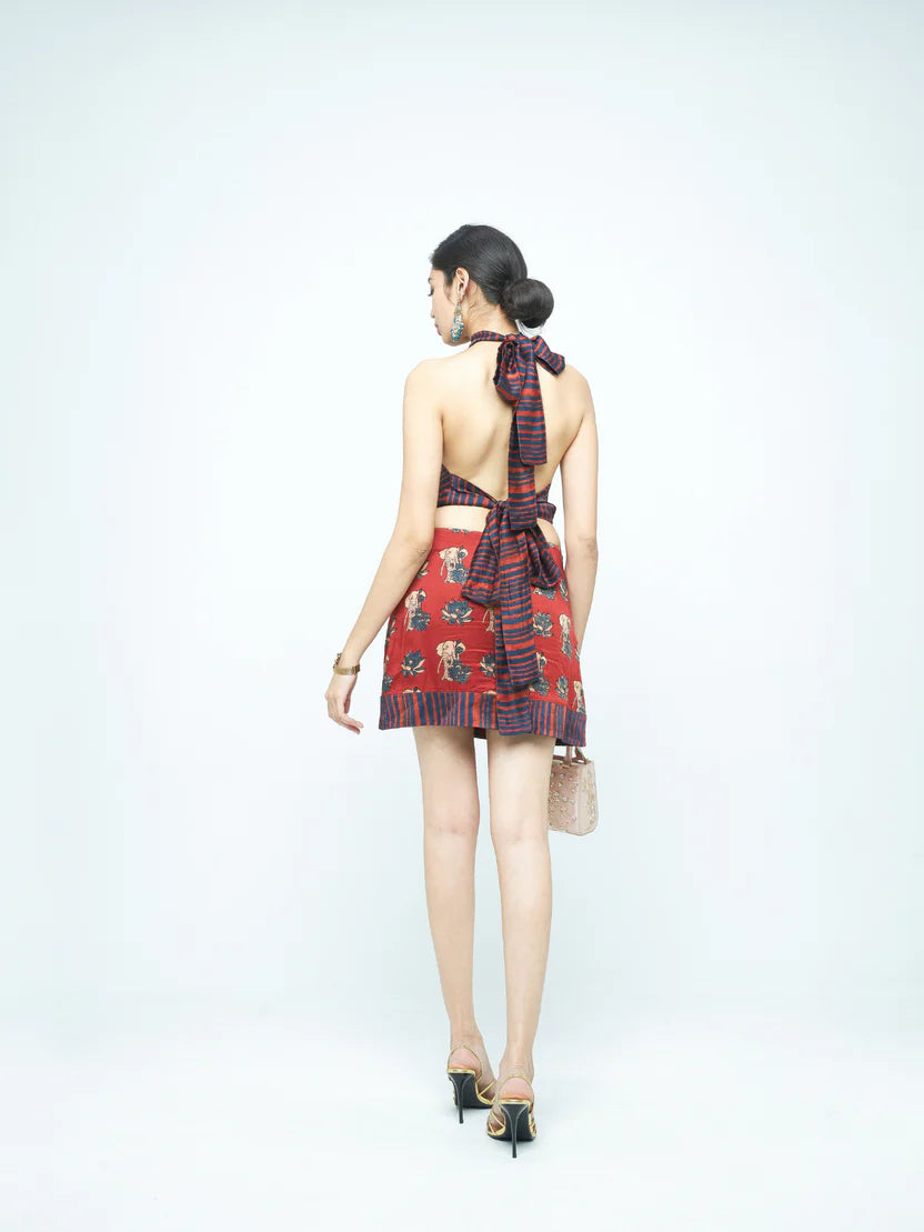 Description: A backless halter mini dress in modal featuring the Gentle Giant print. Designed with a tie-up back, it offers an elegant yet playful silhouette perfect for evenings and celebrations.