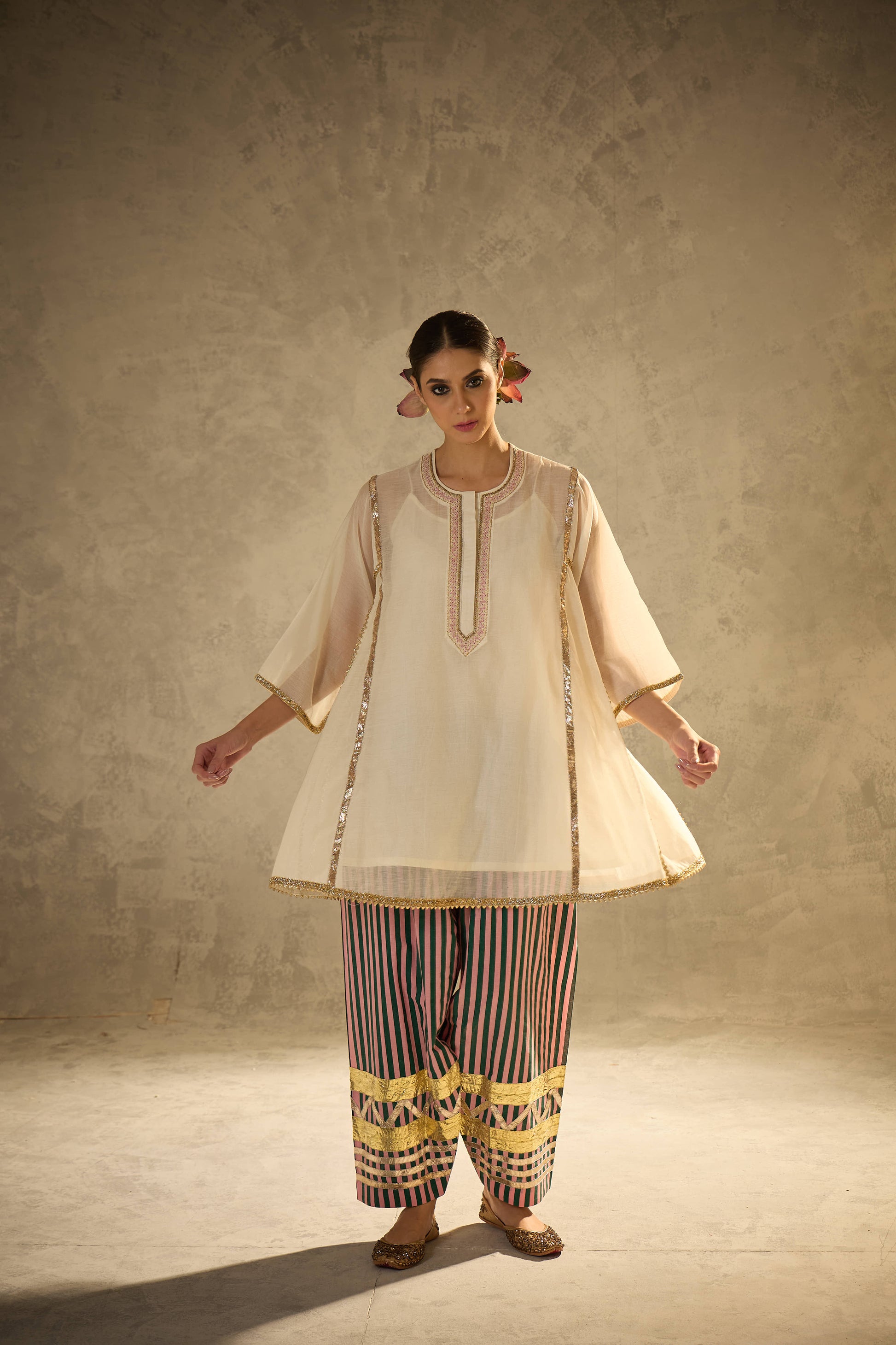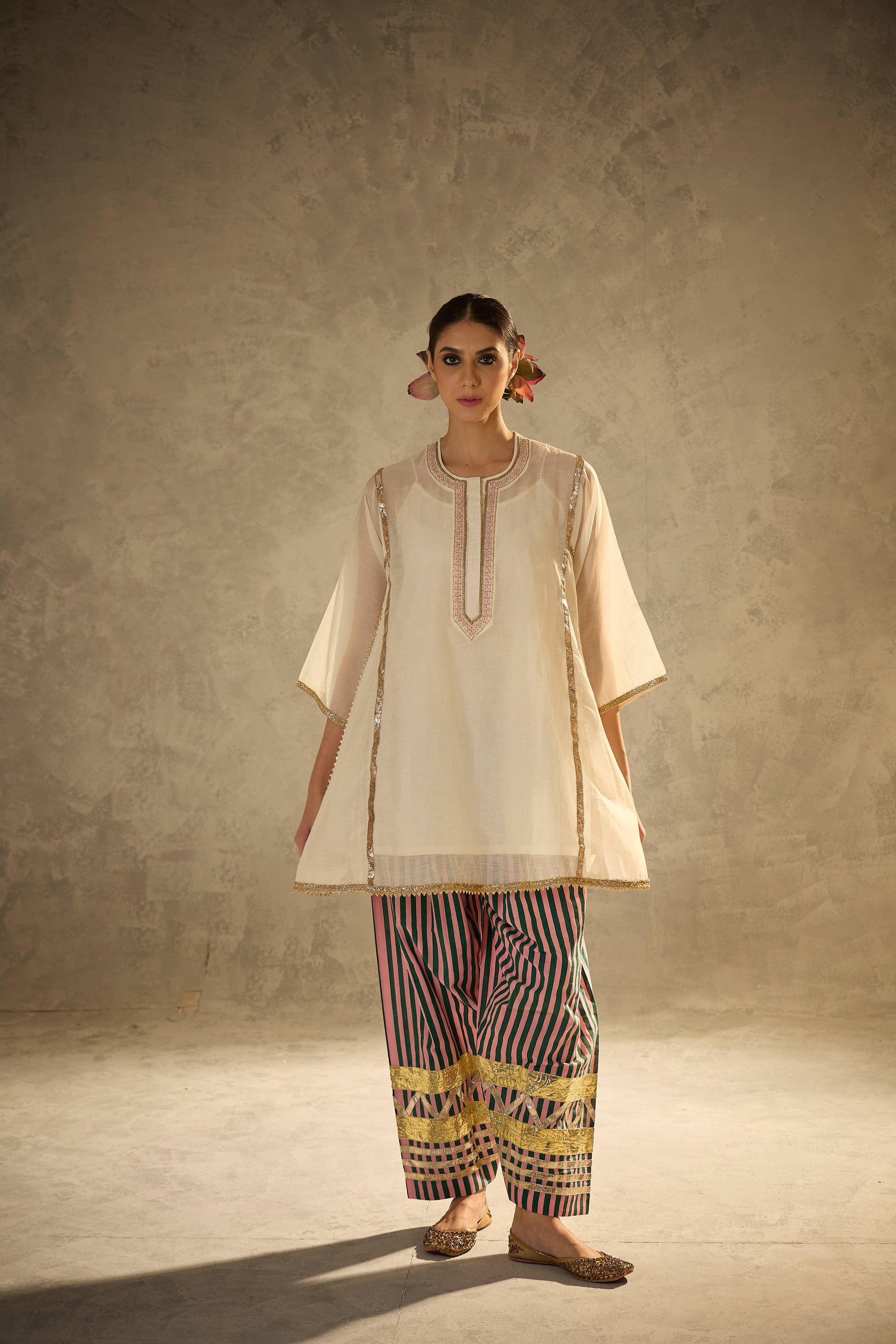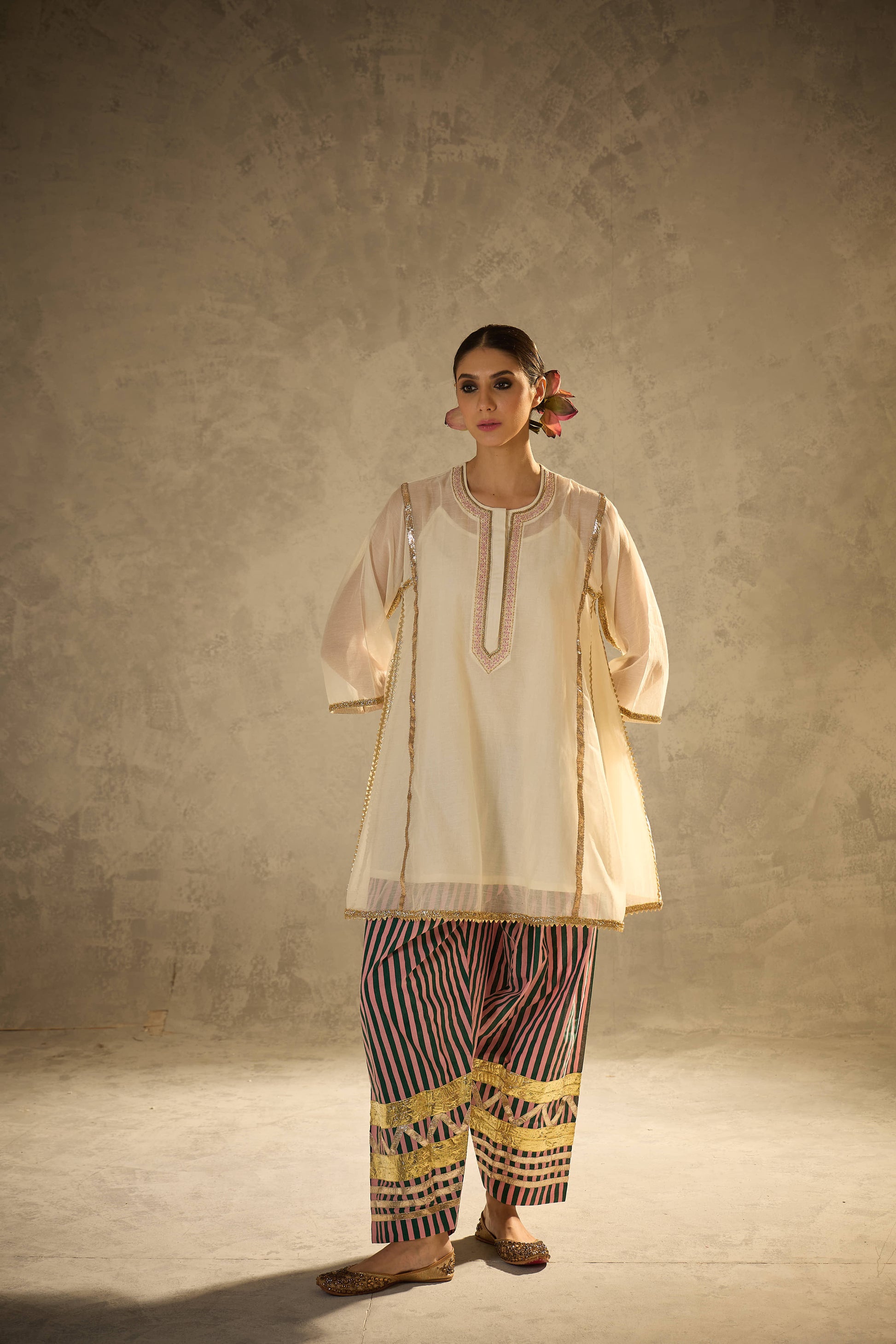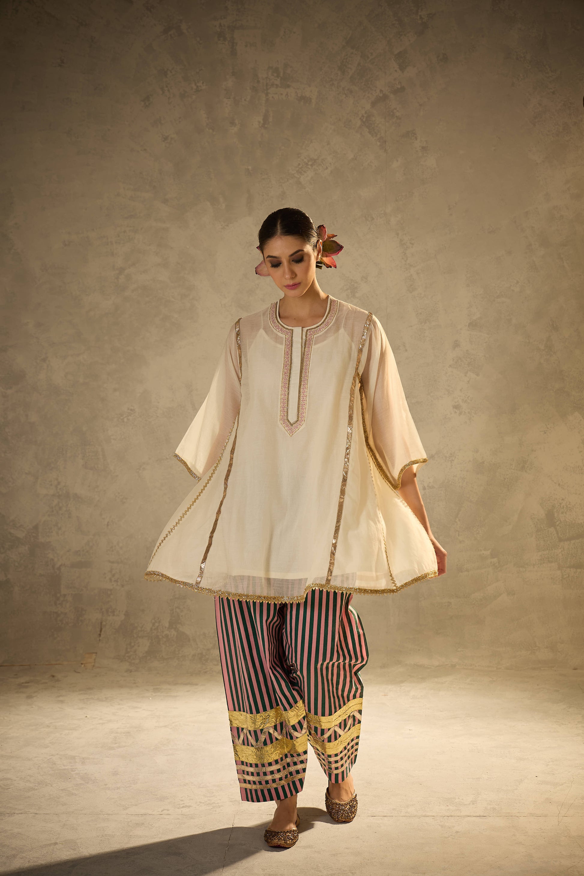 Crafted in lightweight cotton-chanderi, this kalidaar kurta features elegant gota patti embroidery, enhanced by delicate bead and zari work around the neckline for a touch of shimmer. The accompanying striped salwar pants mirror the gota motif with coordinating embellishment