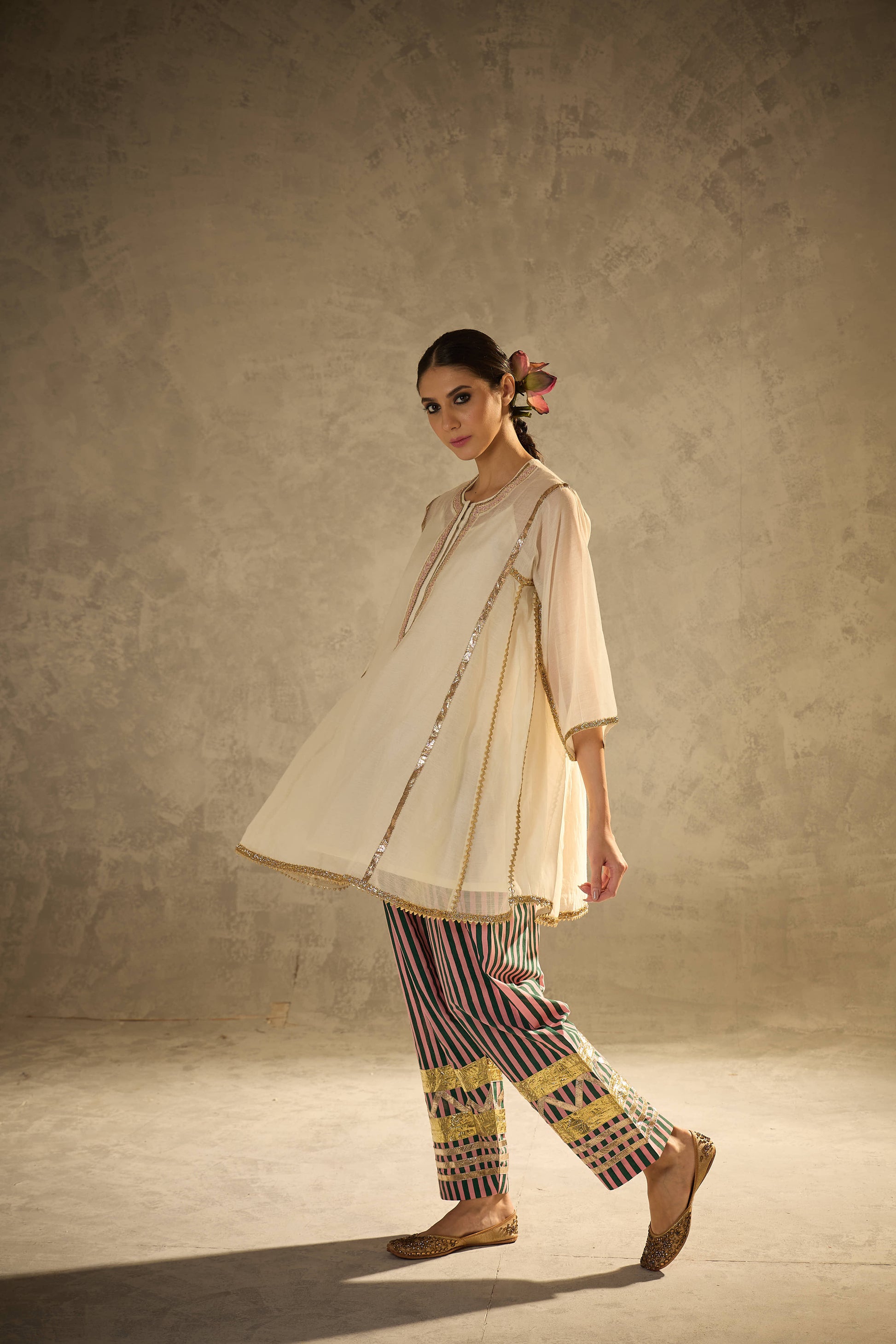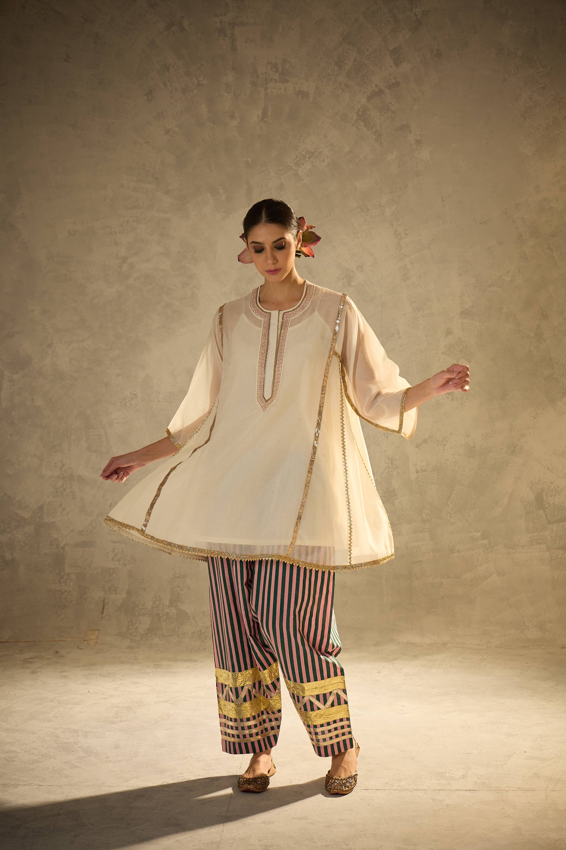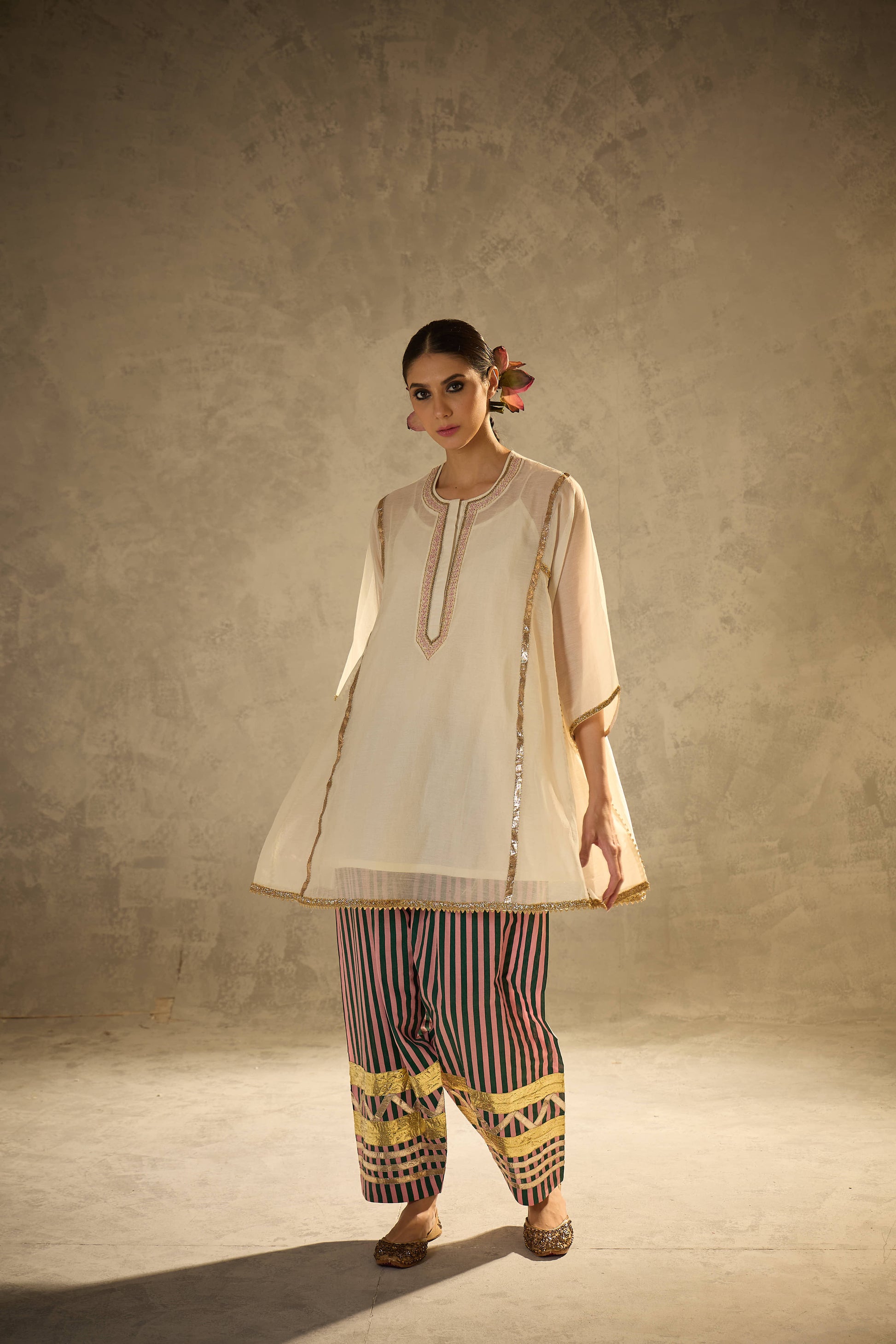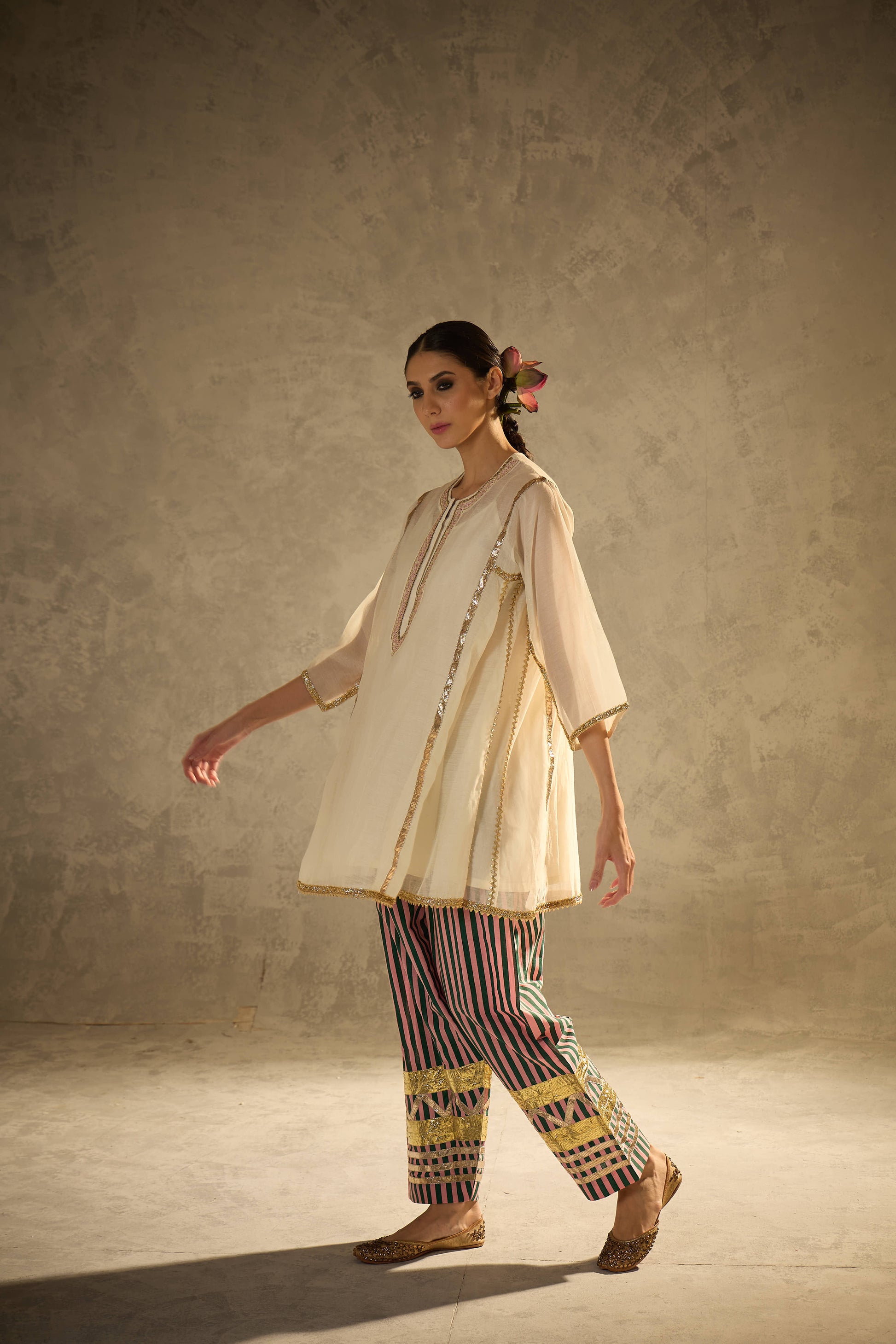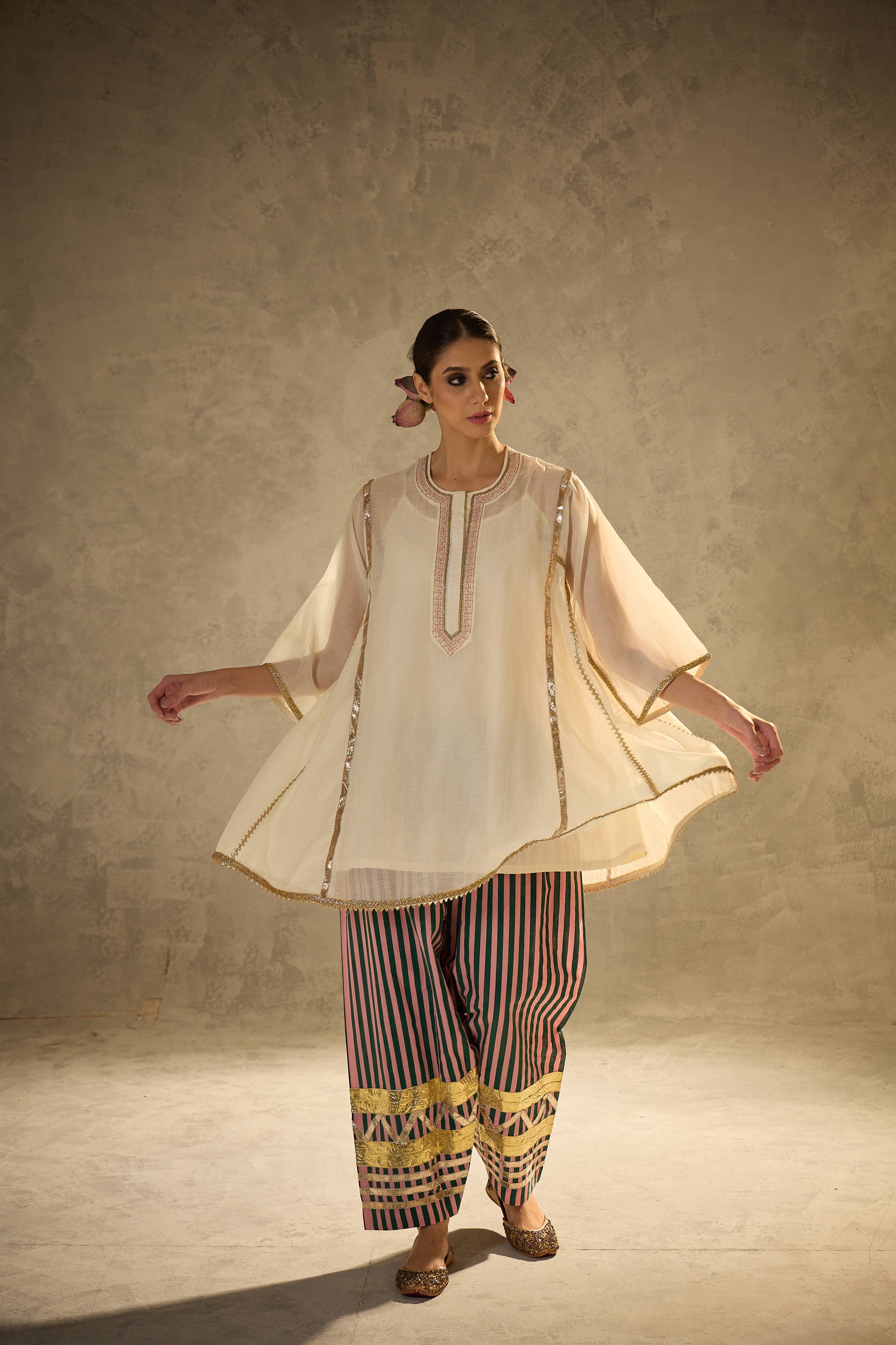 Crafted in lightweight cotton-chanderi, this kalidaar kurta features elegant gota patti embroidery, enhanced by delicate bead and zari work around the neckline for a touch of shimmer. The accompanying striped salwar pants mirror the gota motif with coordinating embellishment