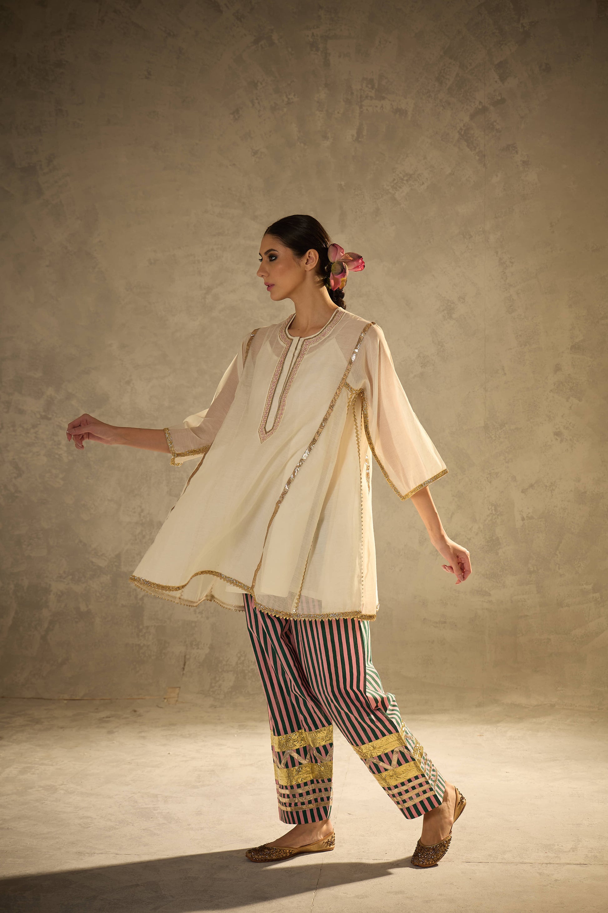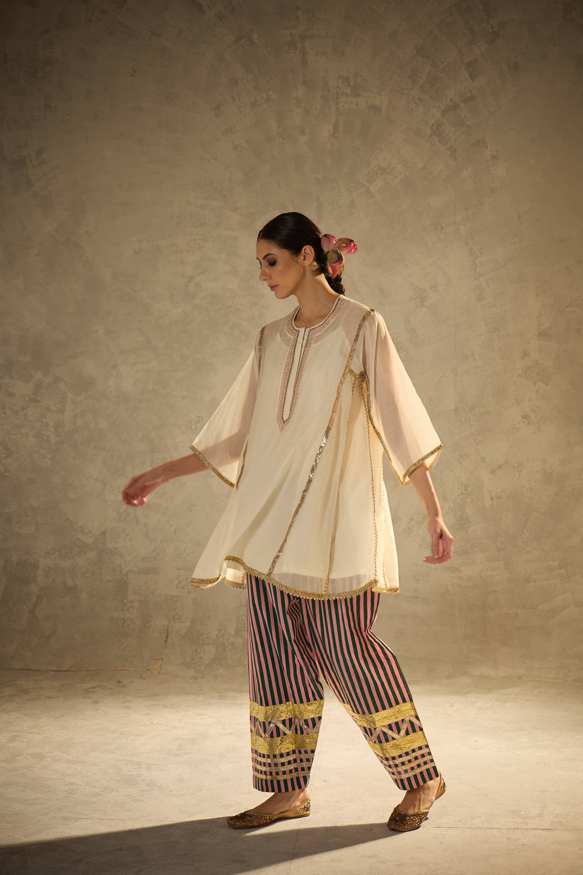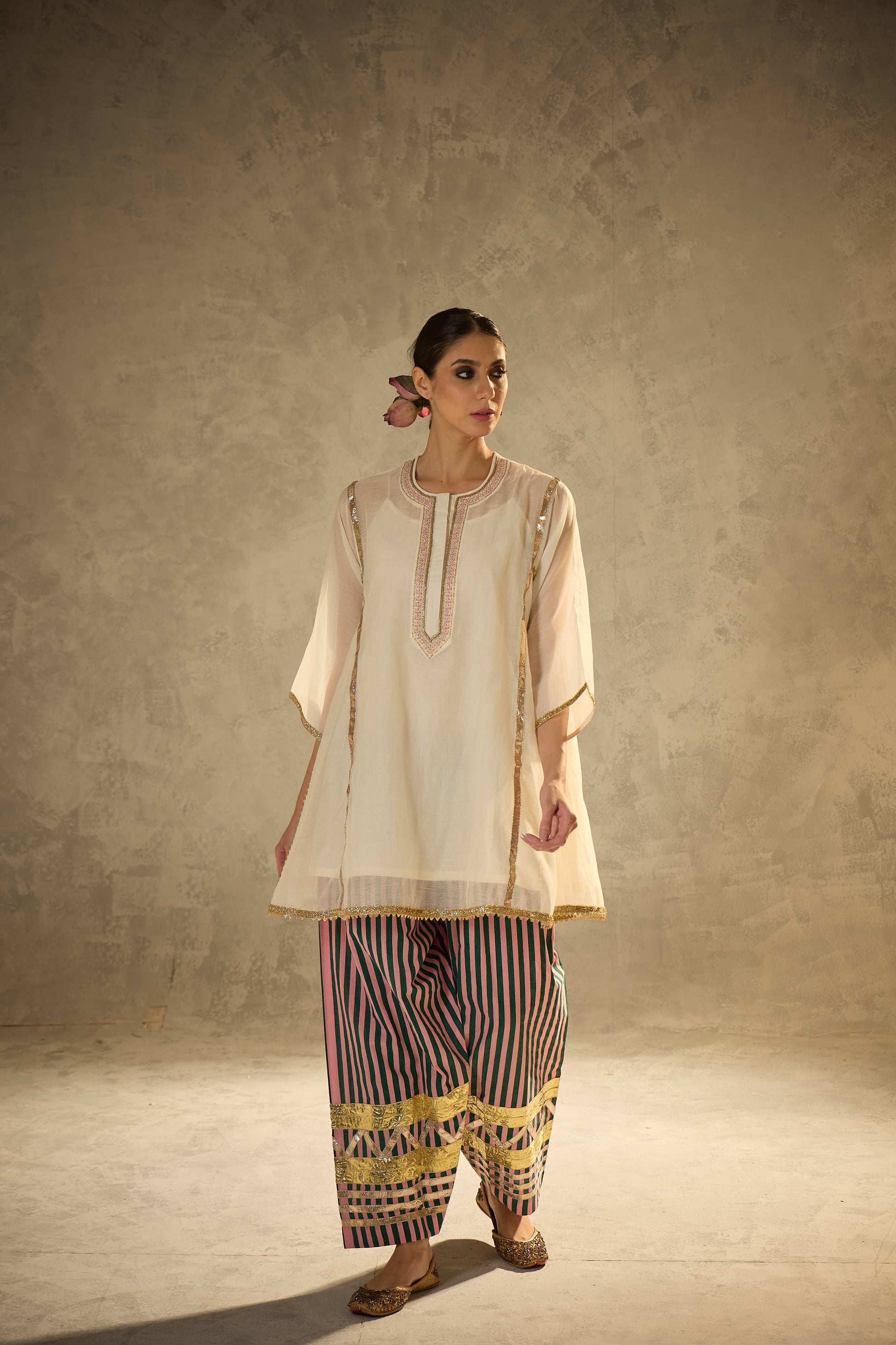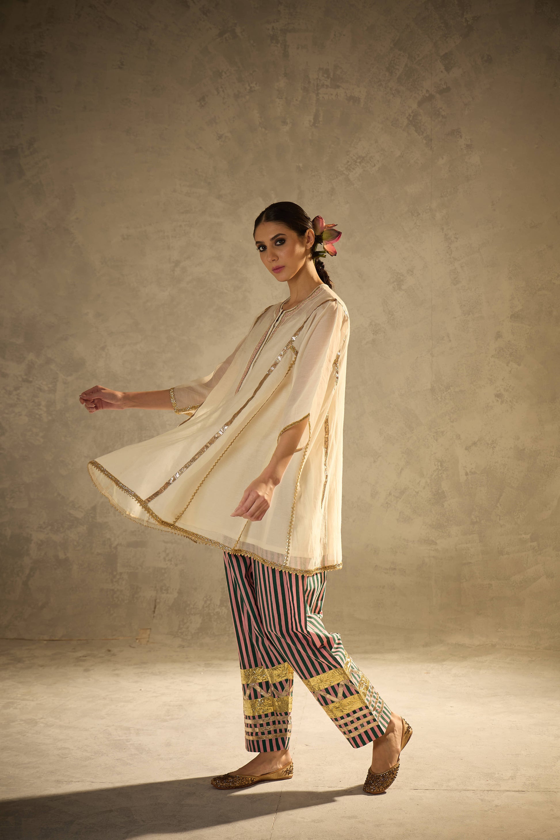 Crafted in lightweight cotton-chanderi, this kalidaar kurta features elegant gota patti embroidery, enhanced by delicate bead and zari work around the neckline for a touch of shimmer. The accompanying striped salwar pants mirror the gota motif with coordinating embellishment