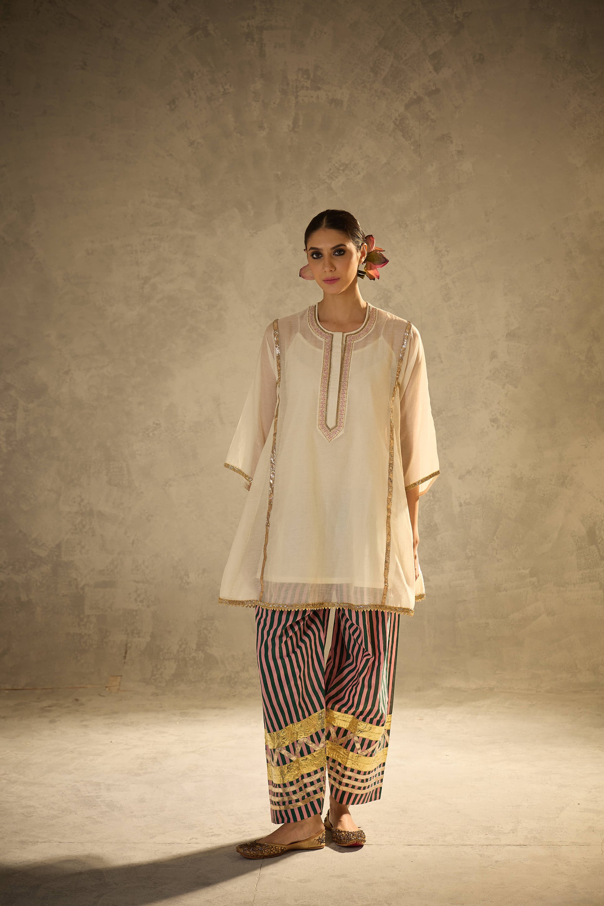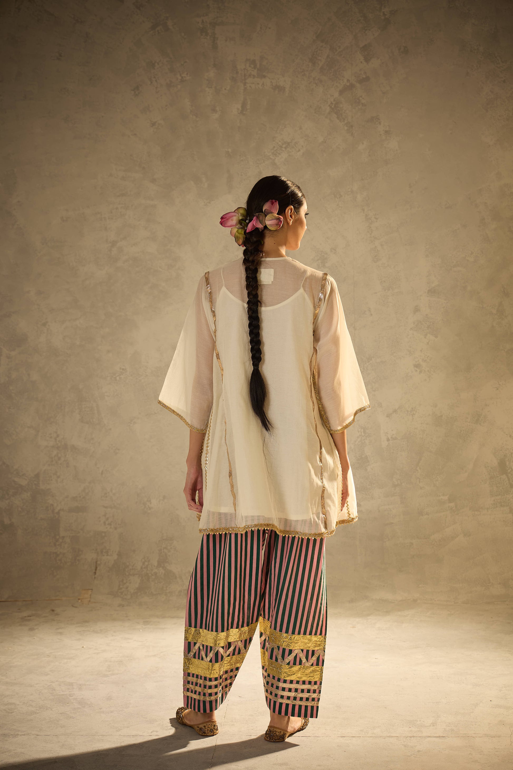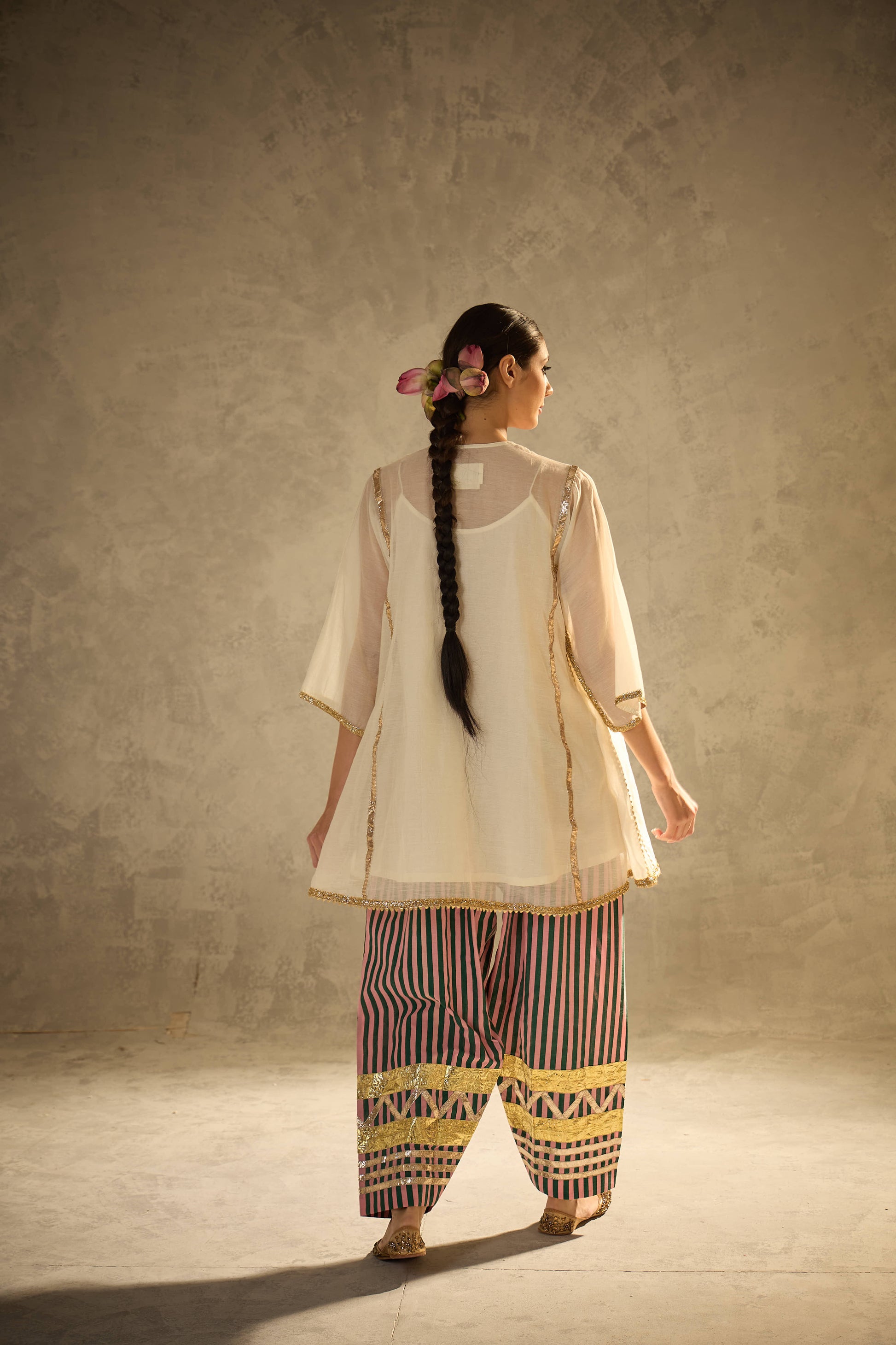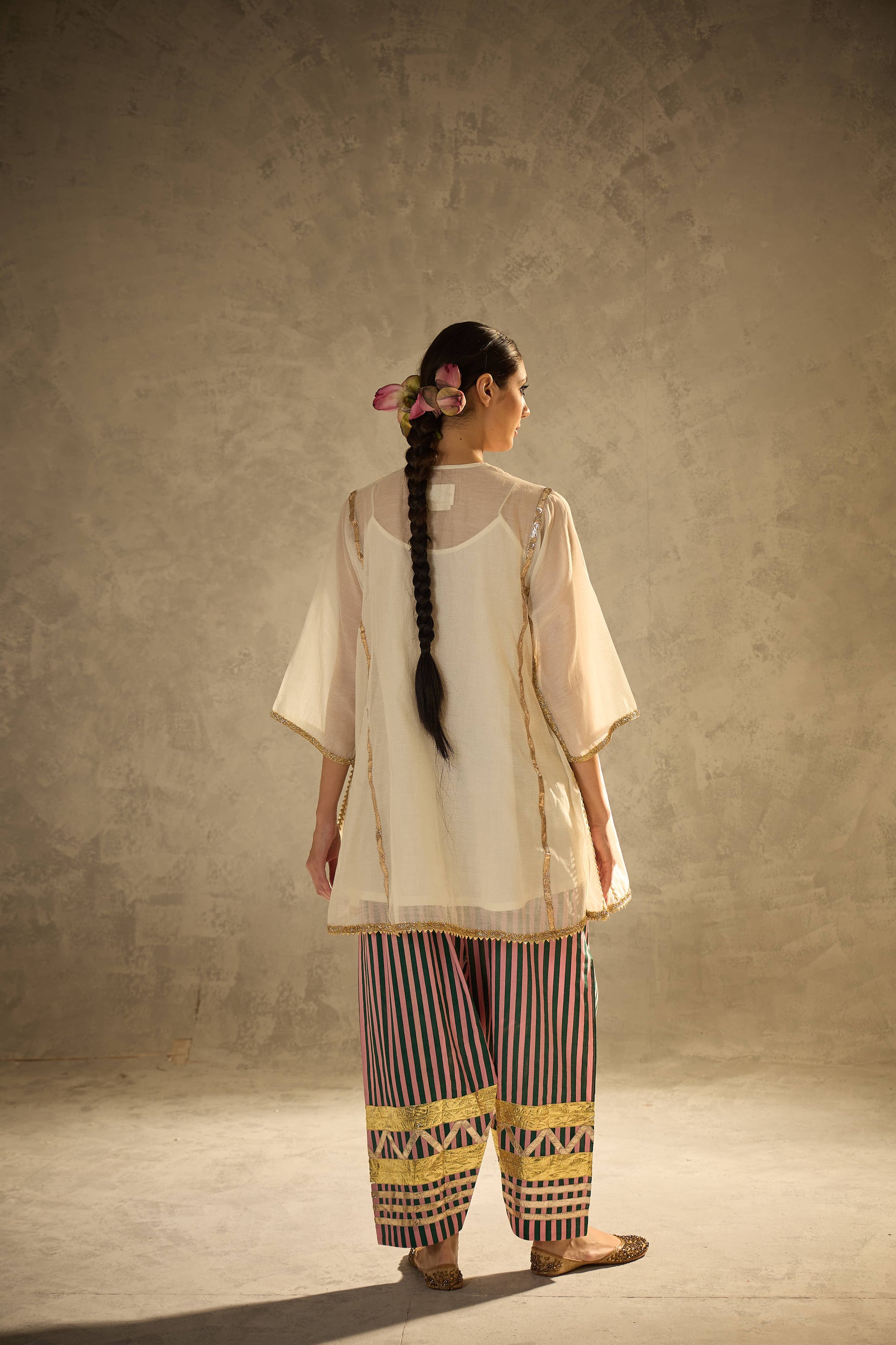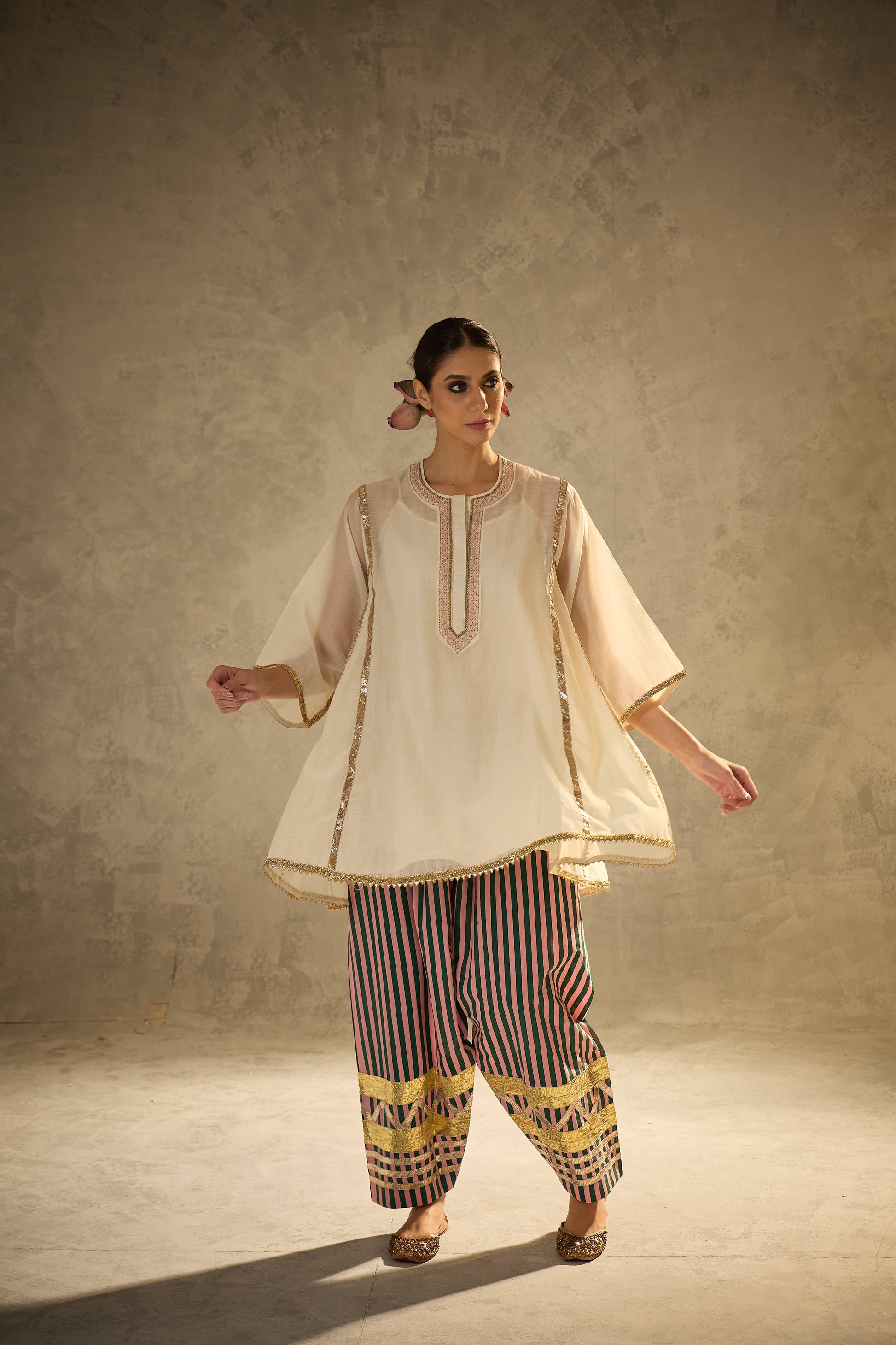 Crafted in lightweight cotton-chanderi, this kalidaar kurta features elegant gota patti embroidery, enhanced by delicate bead and zari work around the neckline for a touch of shimmer. The accompanying striped salwar pants mirror the gota motif with coordinating embellishment