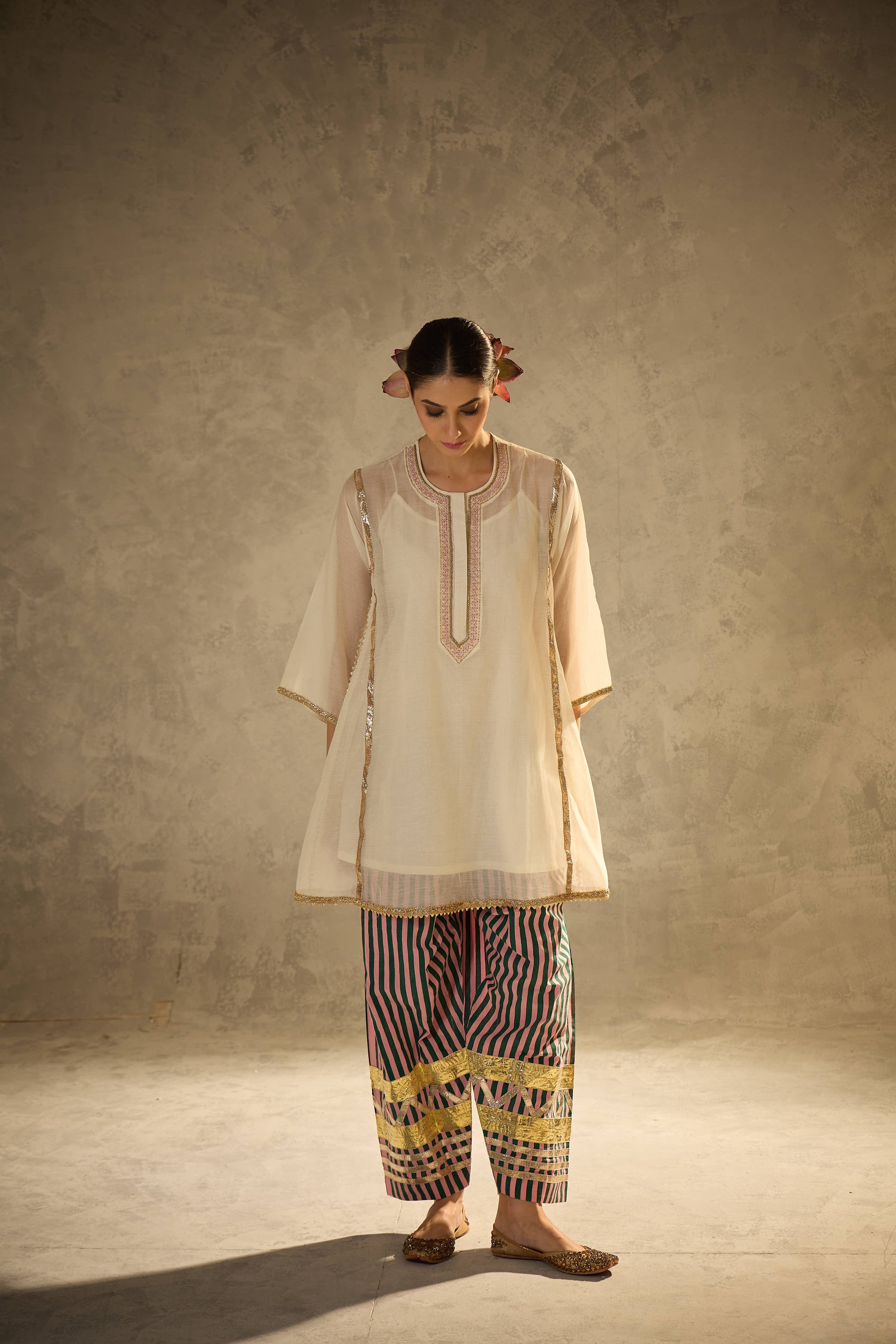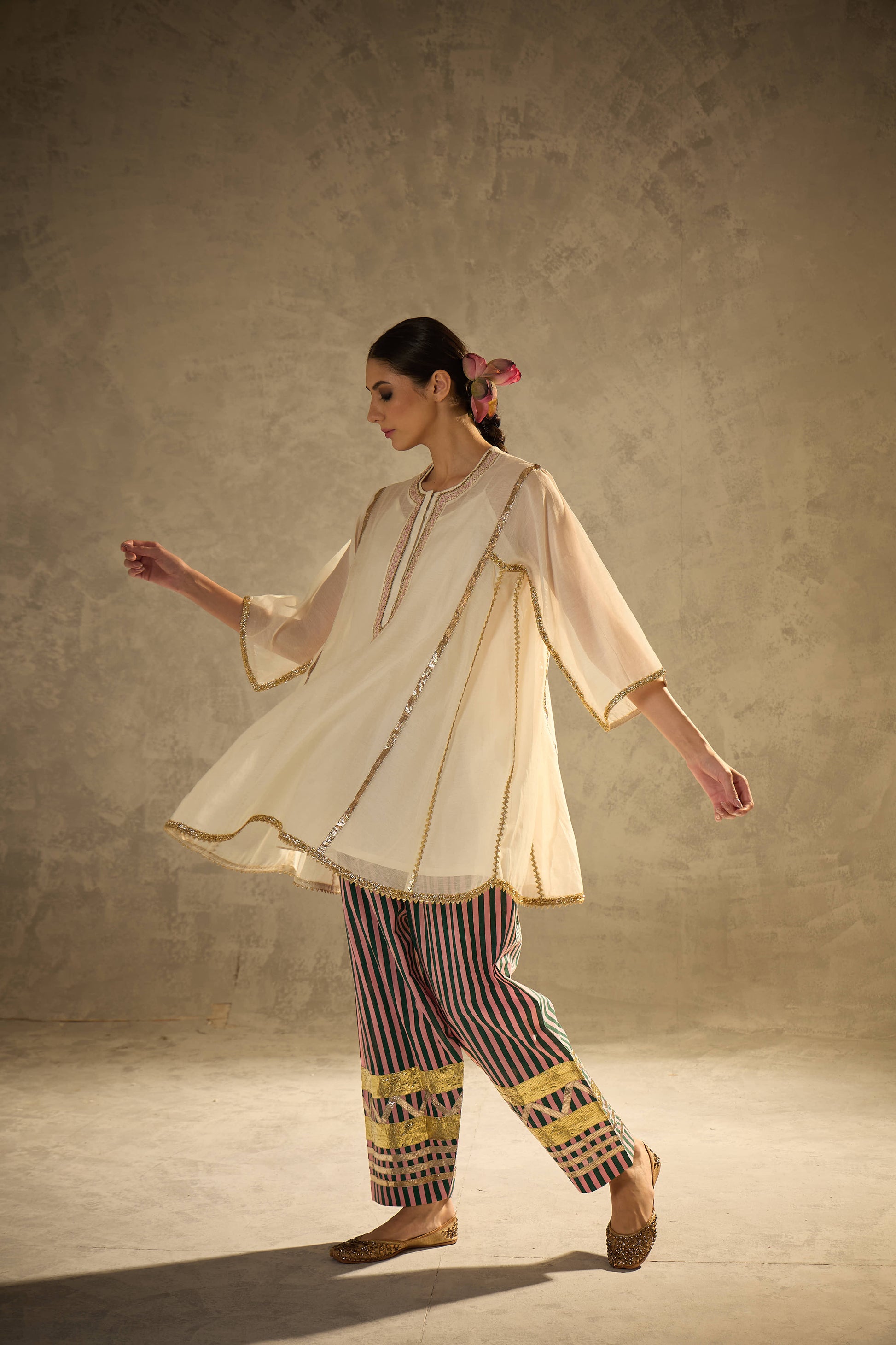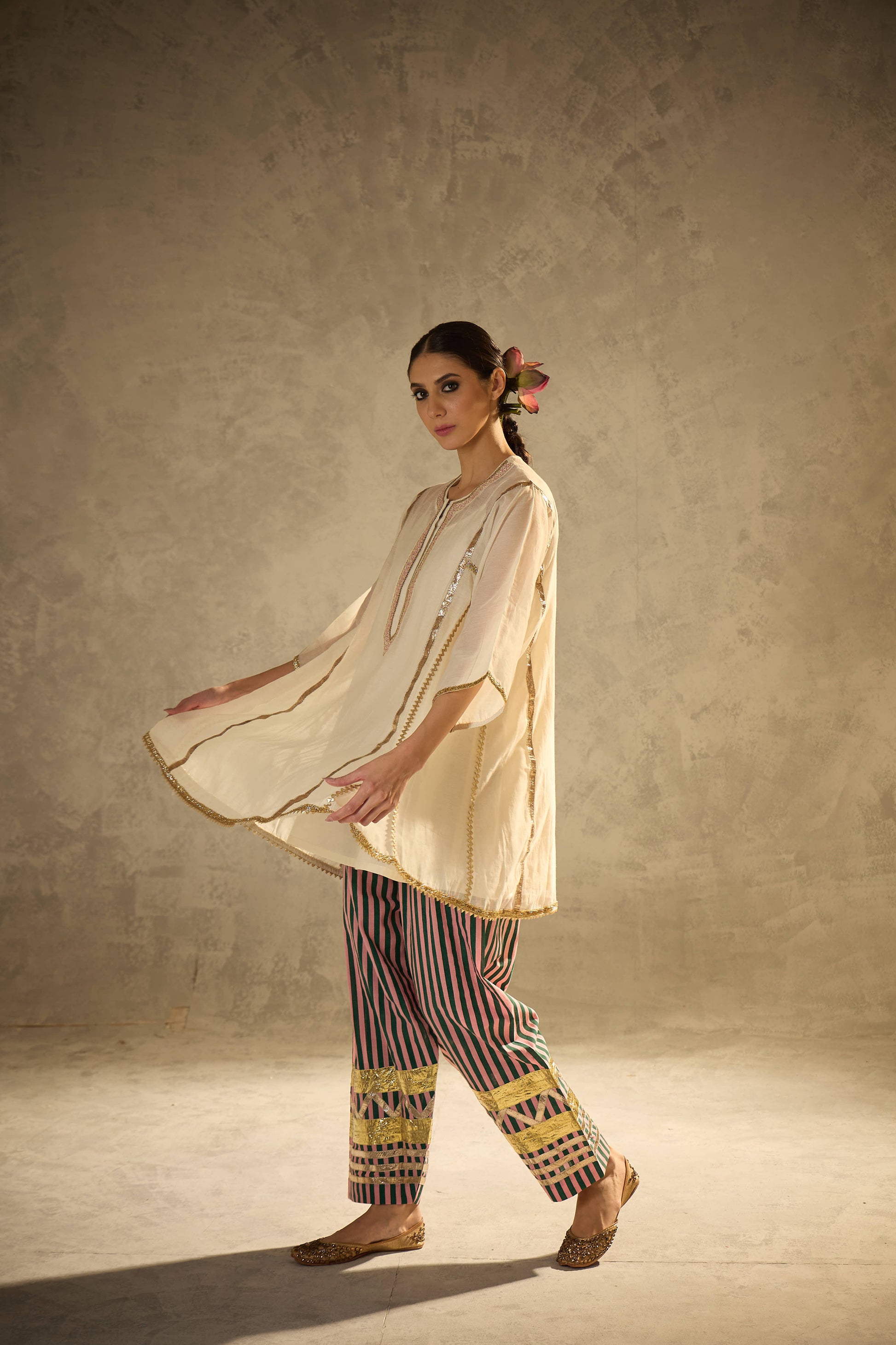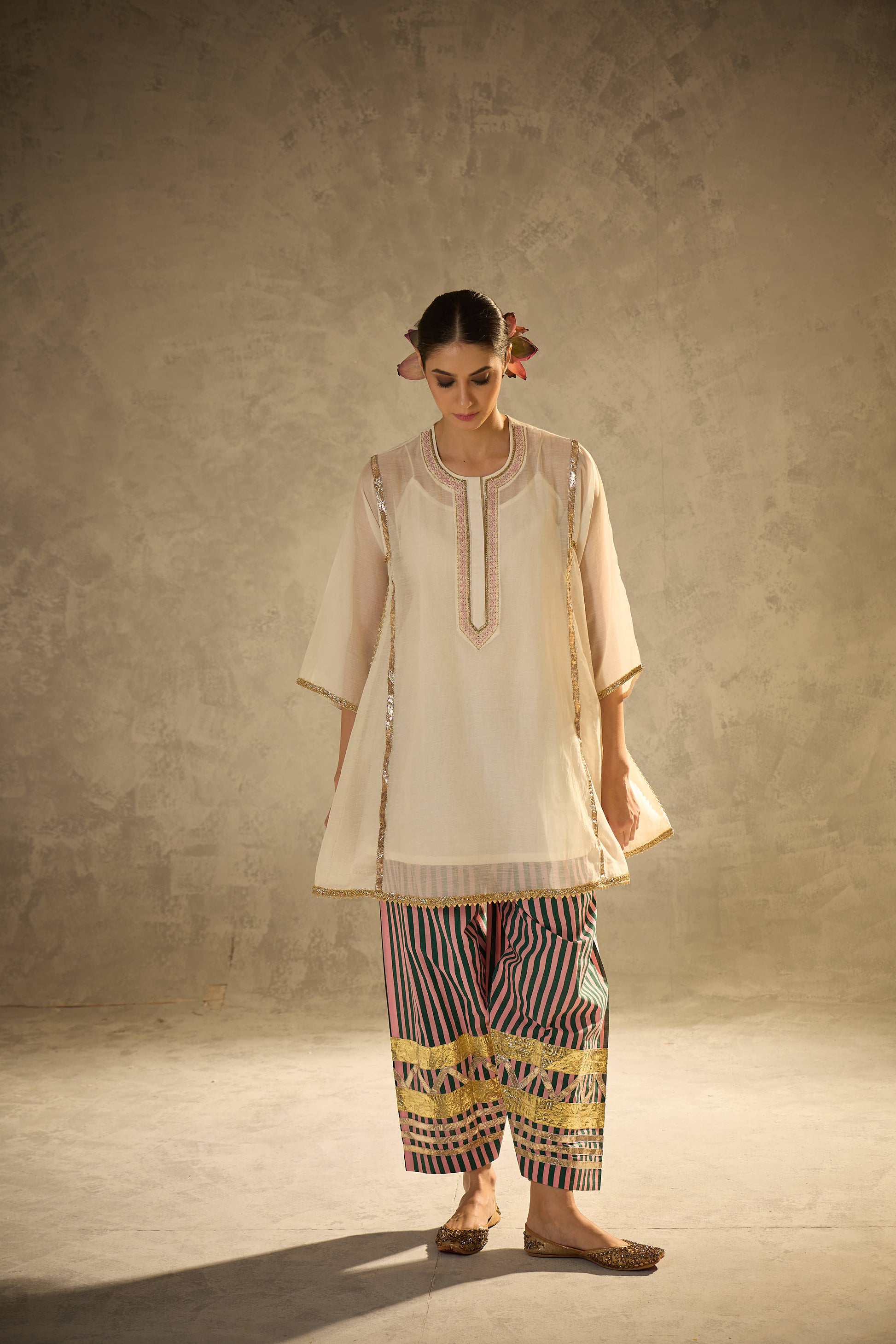 Crafted in lightweight cotton-chanderi, this kalidaar kurta features elegant gota patti embroidery, enhanced by delicate bead and zari work around the neckline for a touch of shimmer. The accompanying striped salwar pants mirror the gota motif with coordinating embellishment