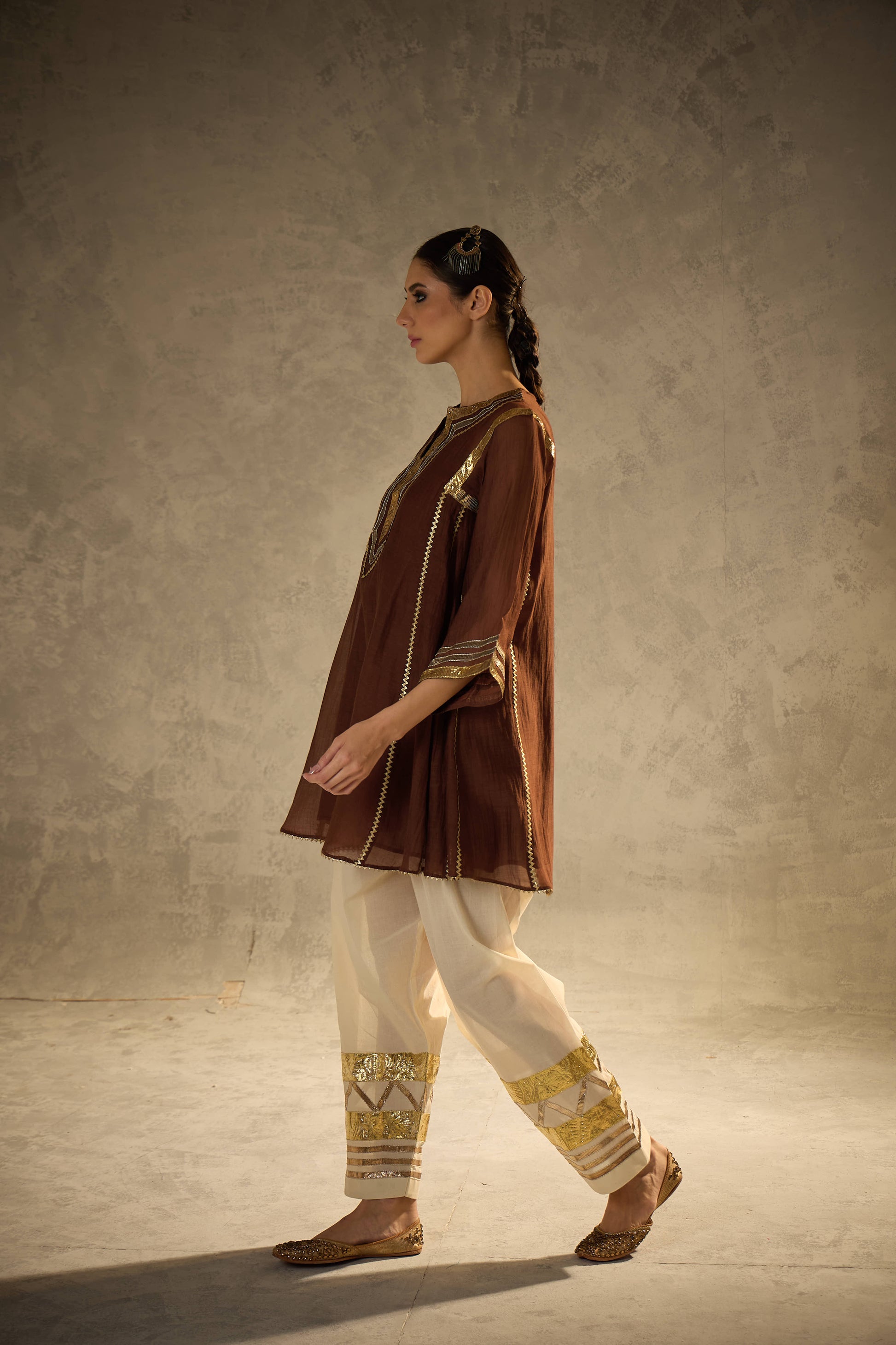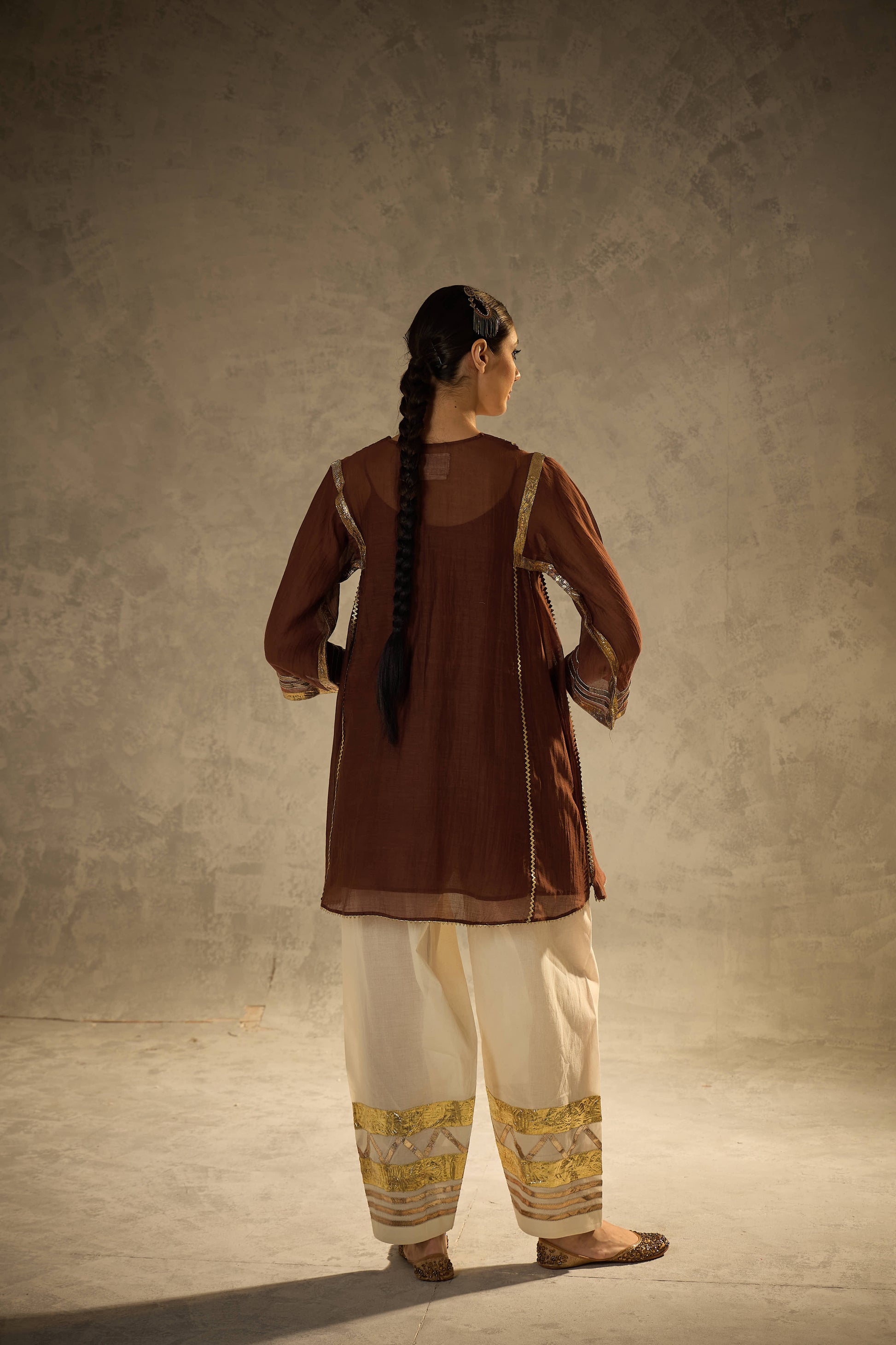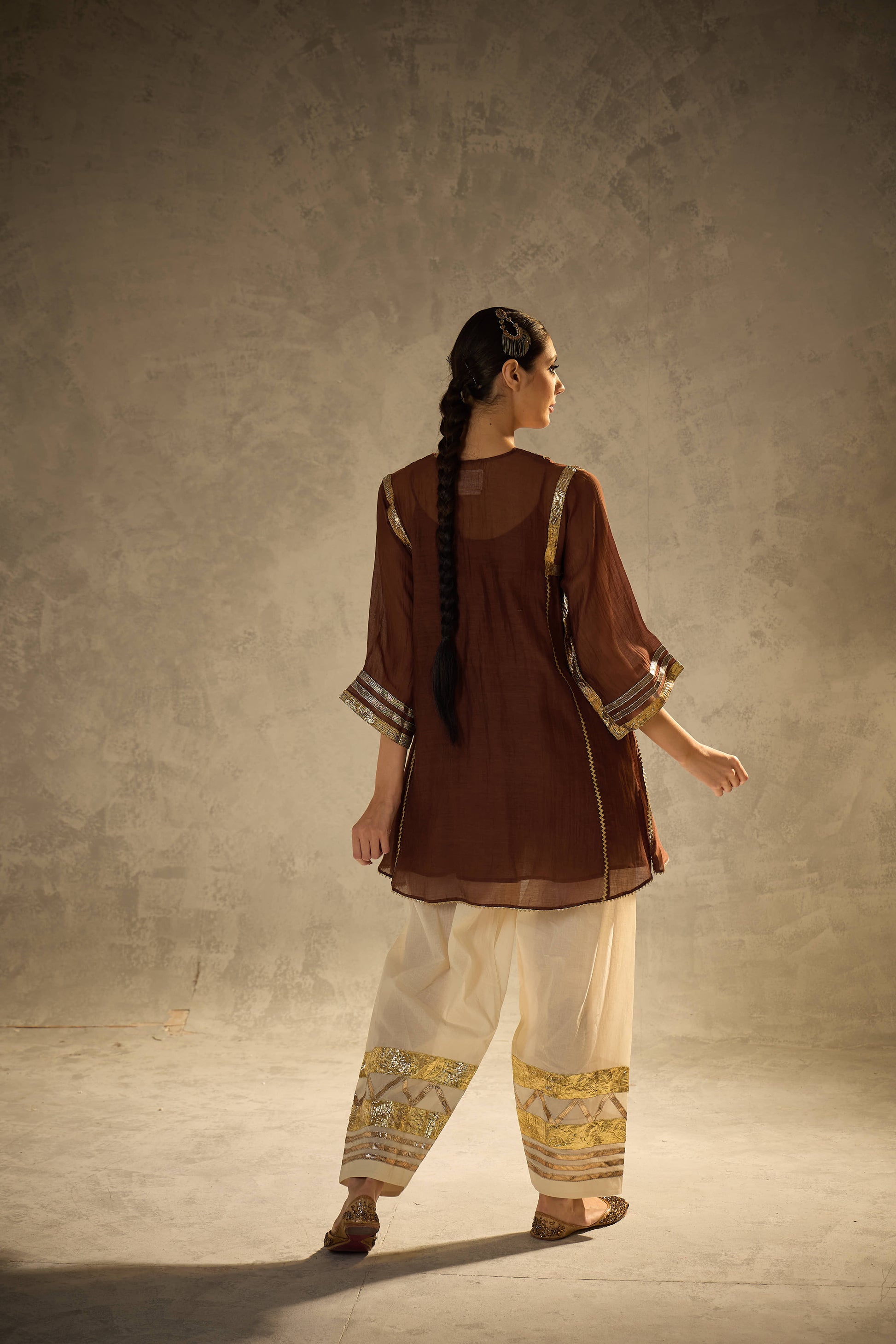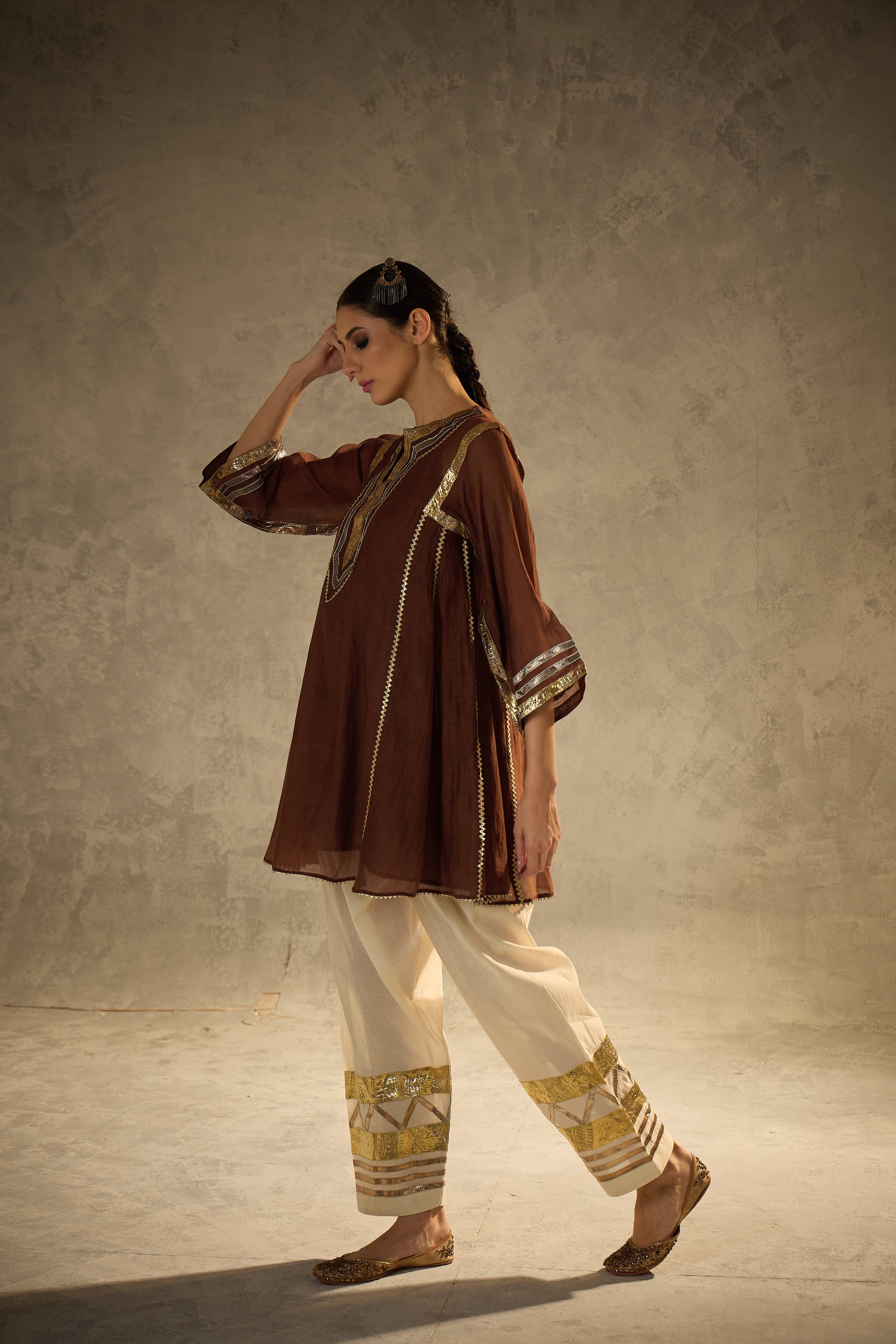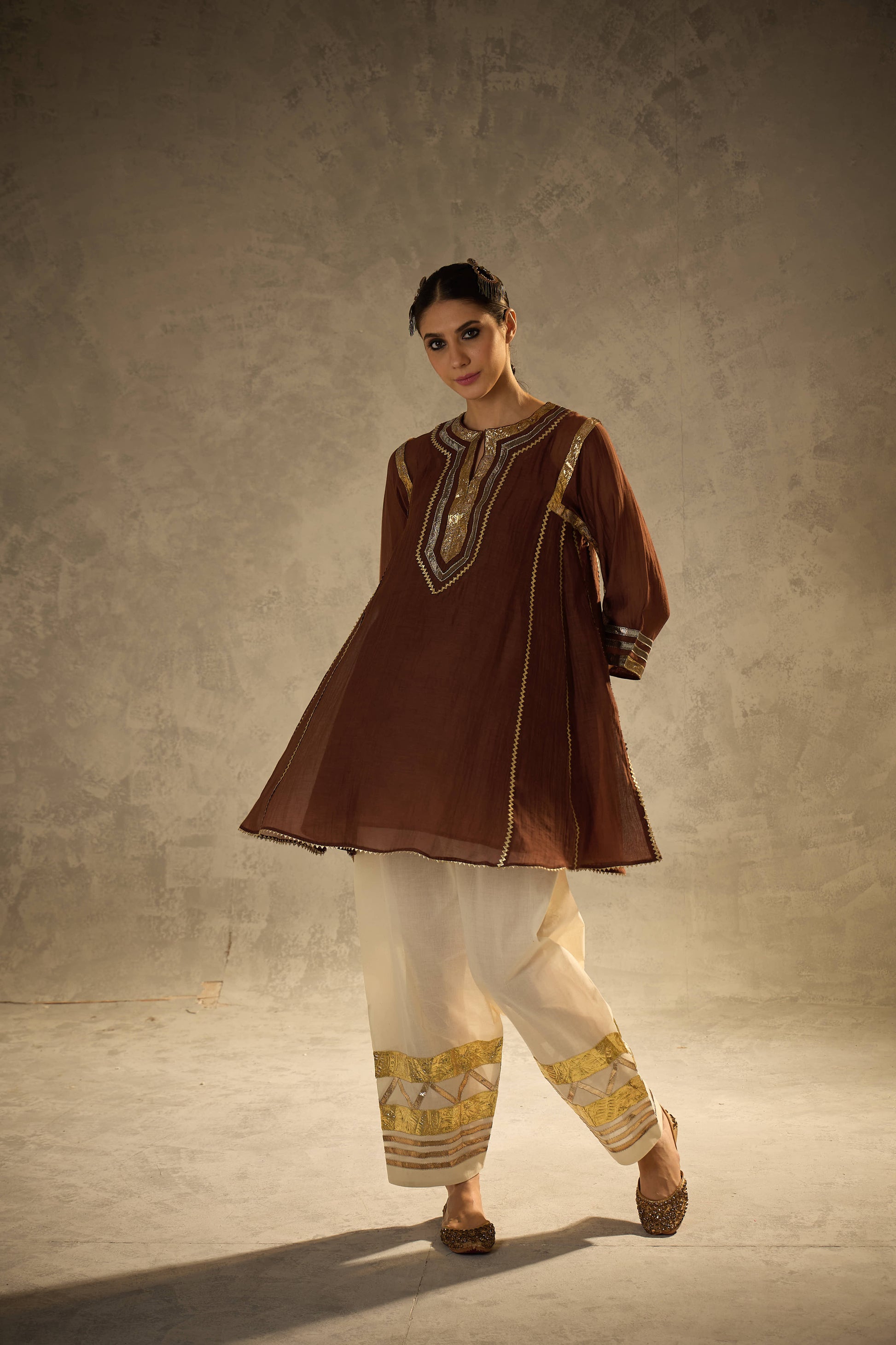 A beautiful brown kalidaar kurta crafted with delicate sucha gota work, blending classic cuts with modern refinement. The kurta features clean lines and thoughtful detailing, paired with our timeless gota salwar highlighted with artistic gota patterns.