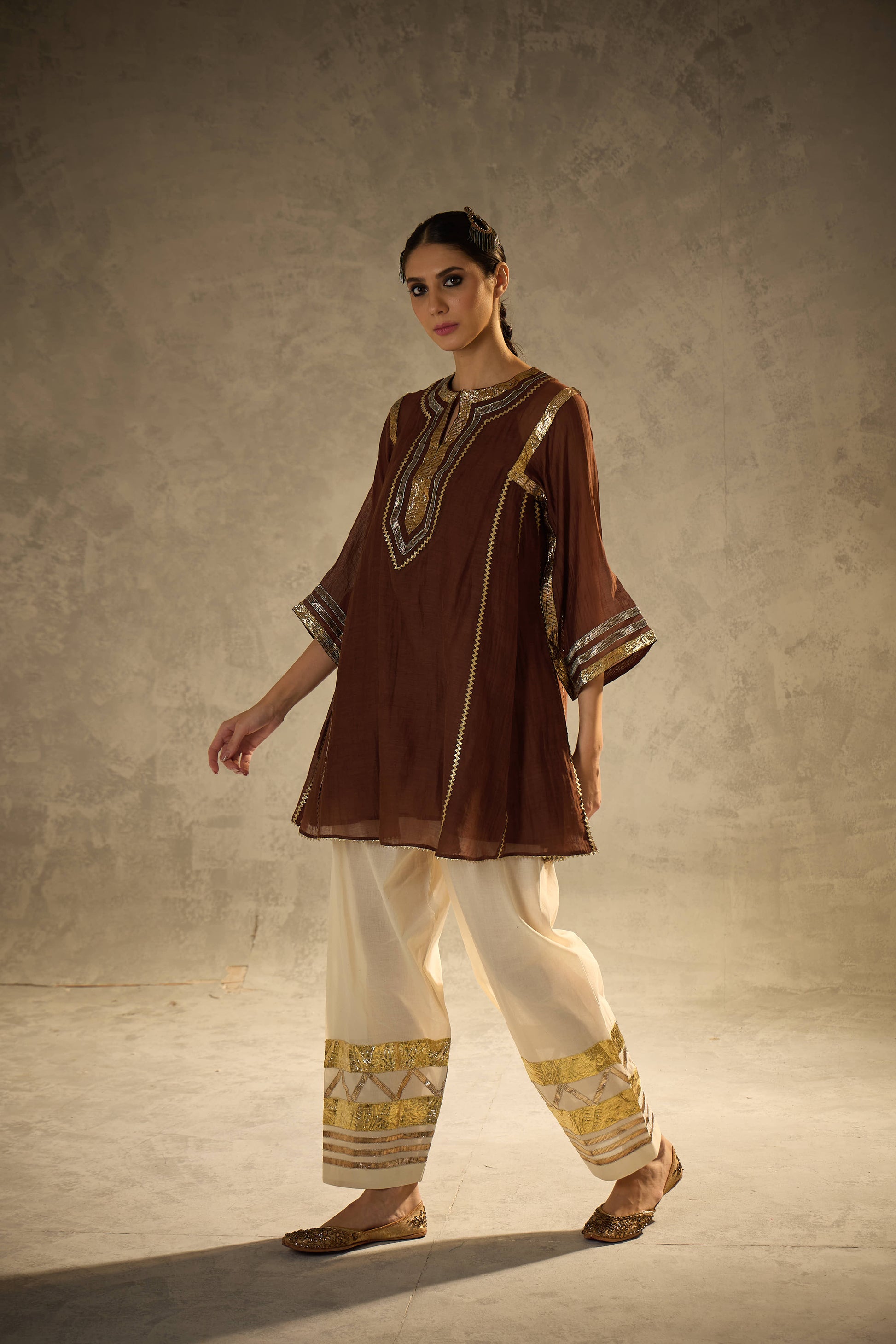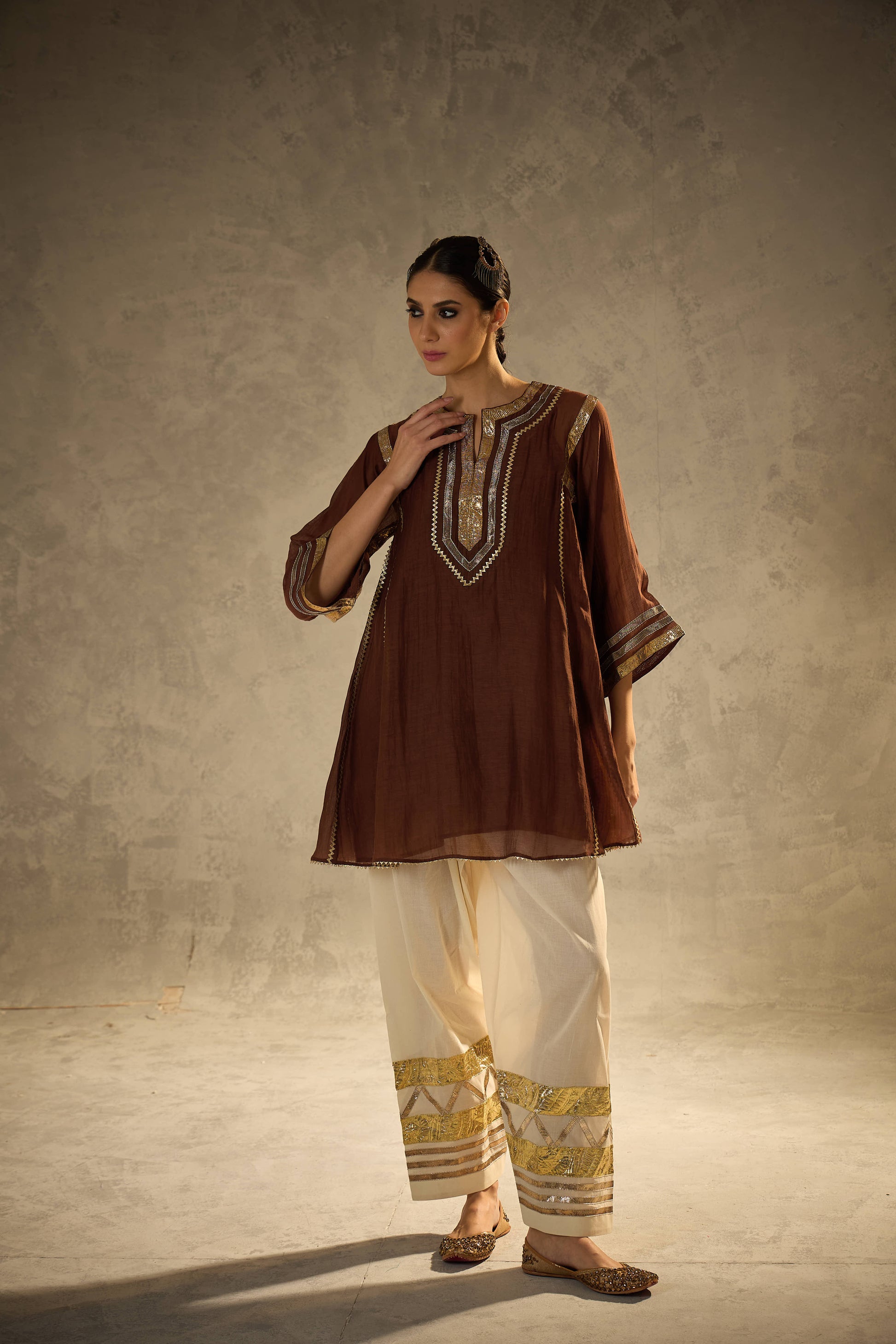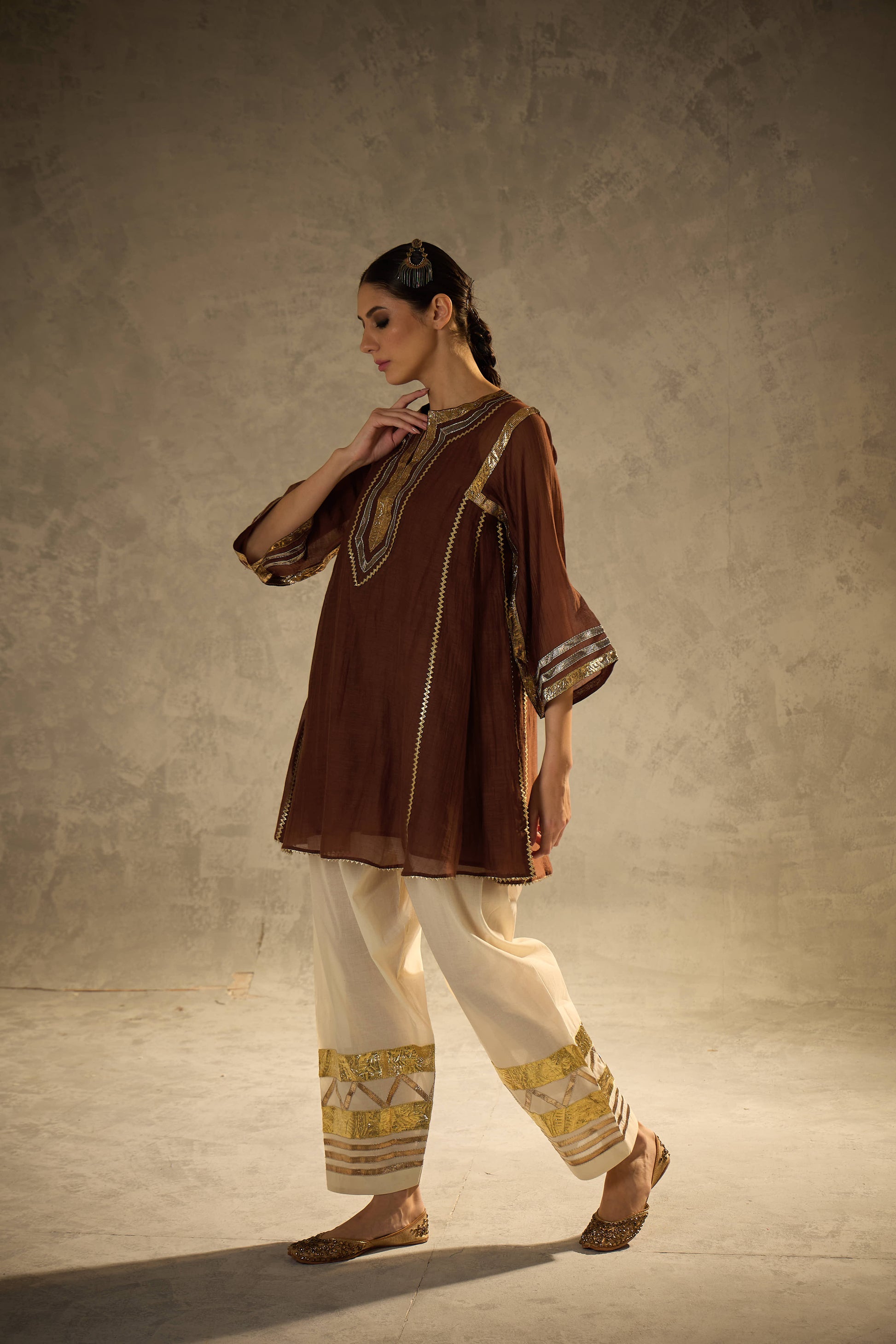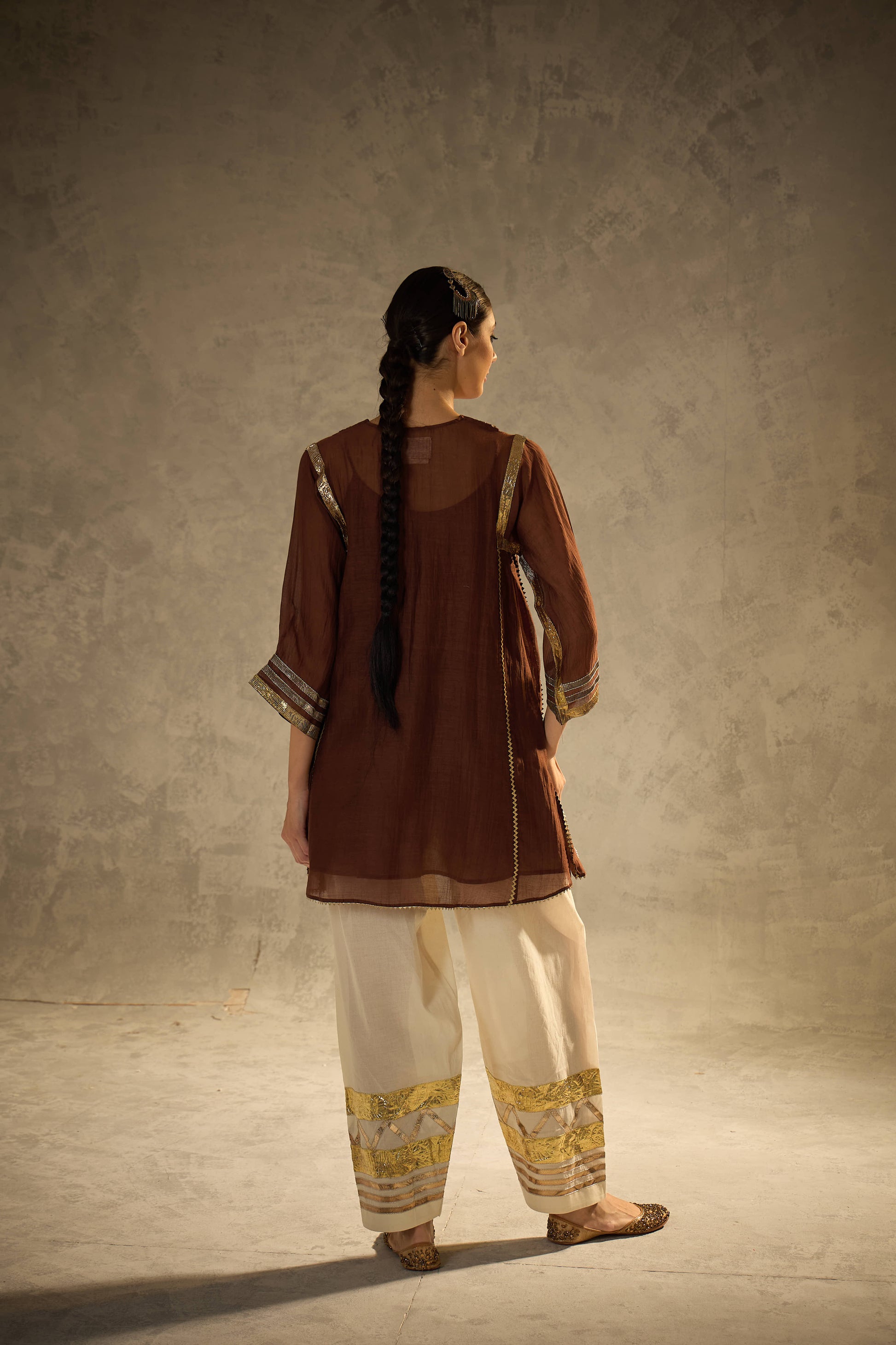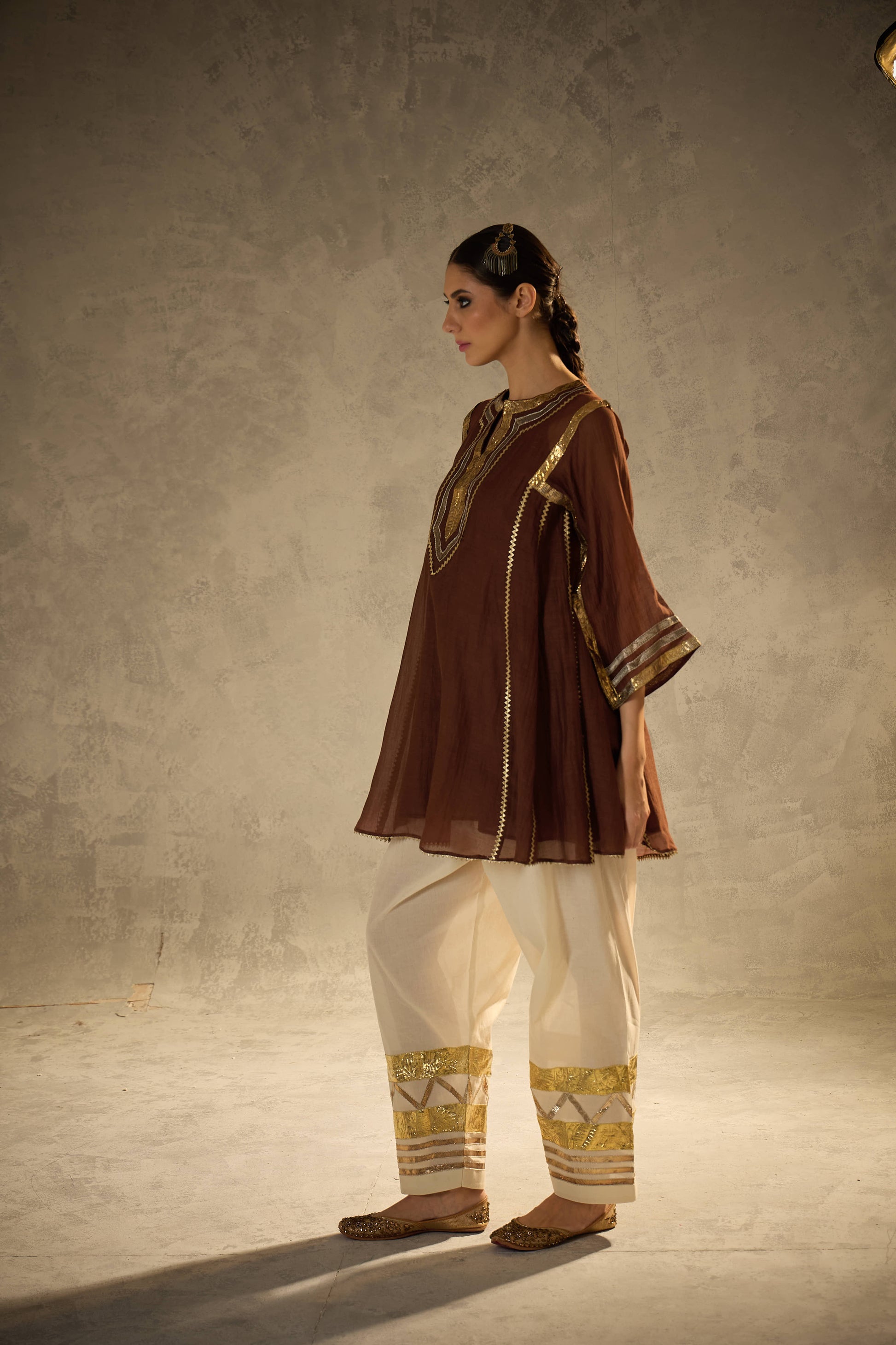 A beautiful brown kalidaar kurta crafted with delicate sucha gota work, blending classic cuts with modern refinement. The kurta features clean lines and thoughtful detailing, paired with our timeless gota salwar highlighted with artistic gota patterns.