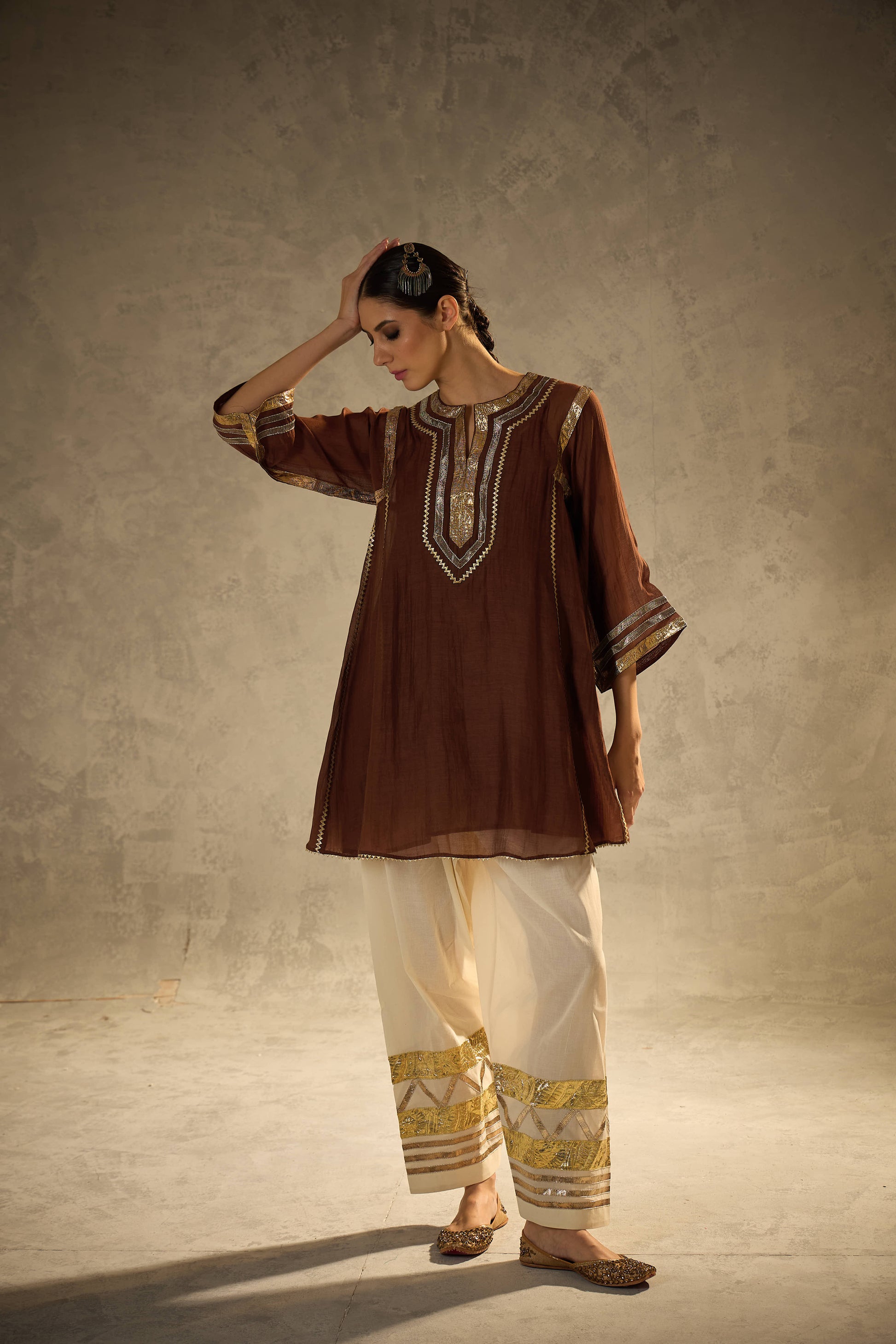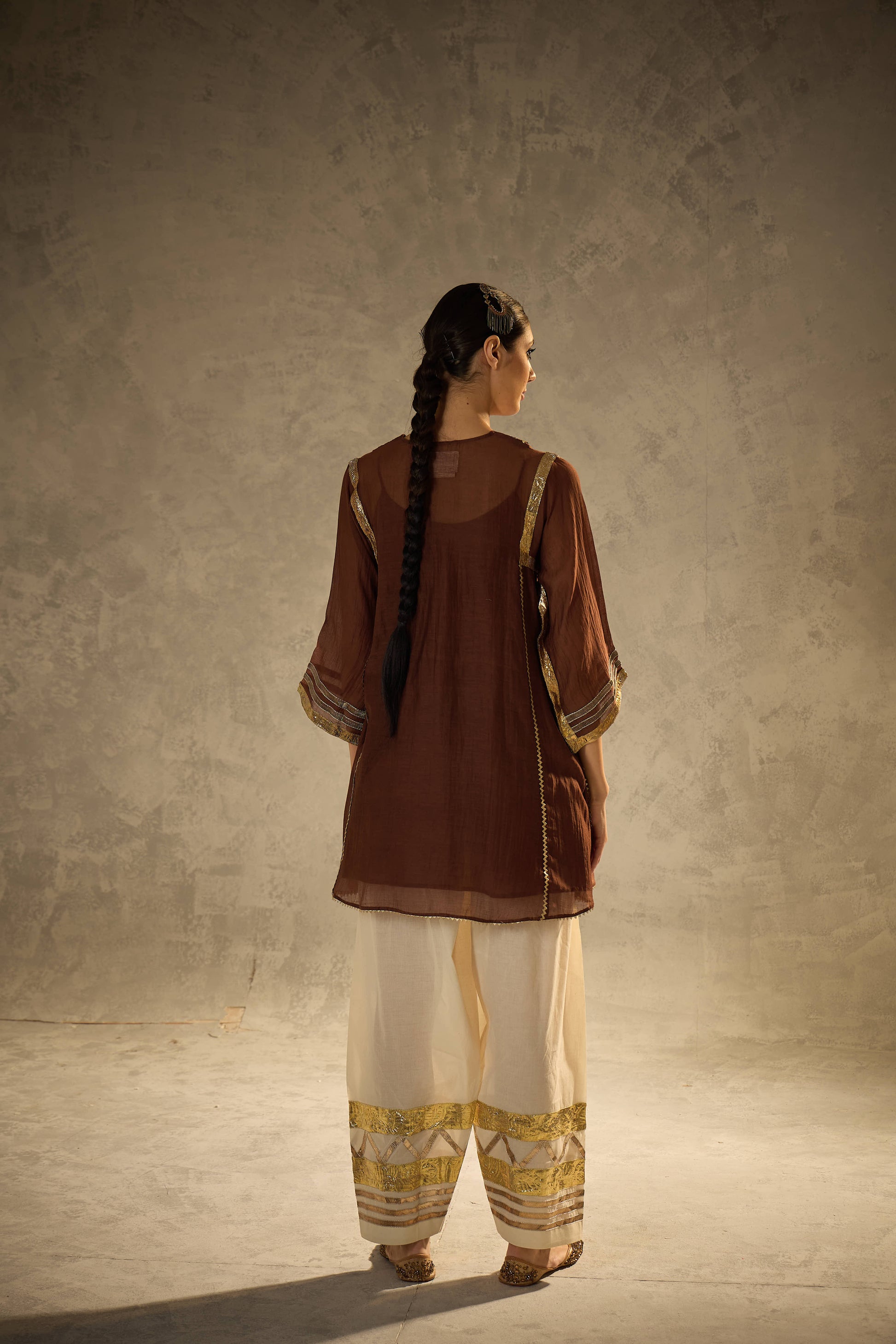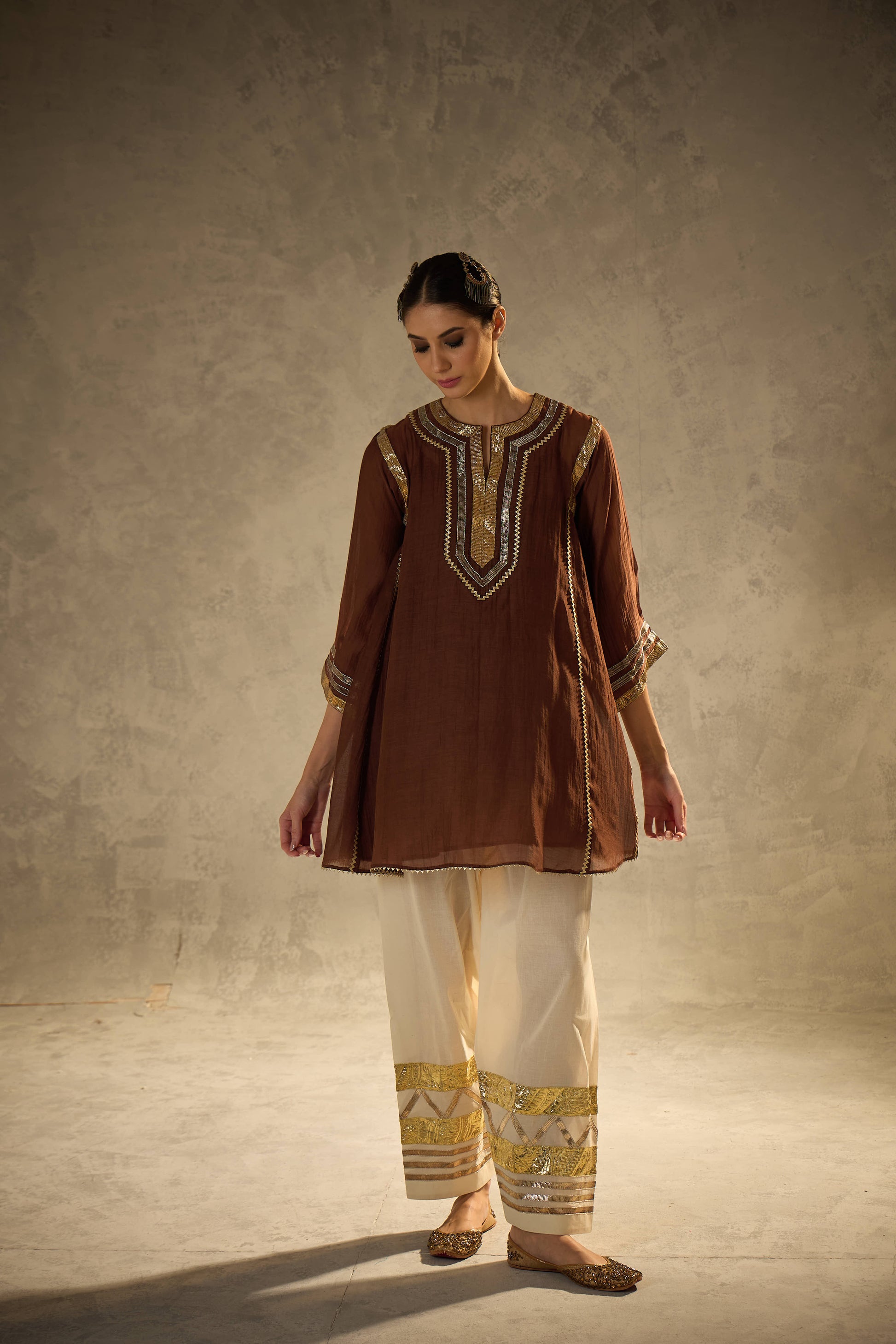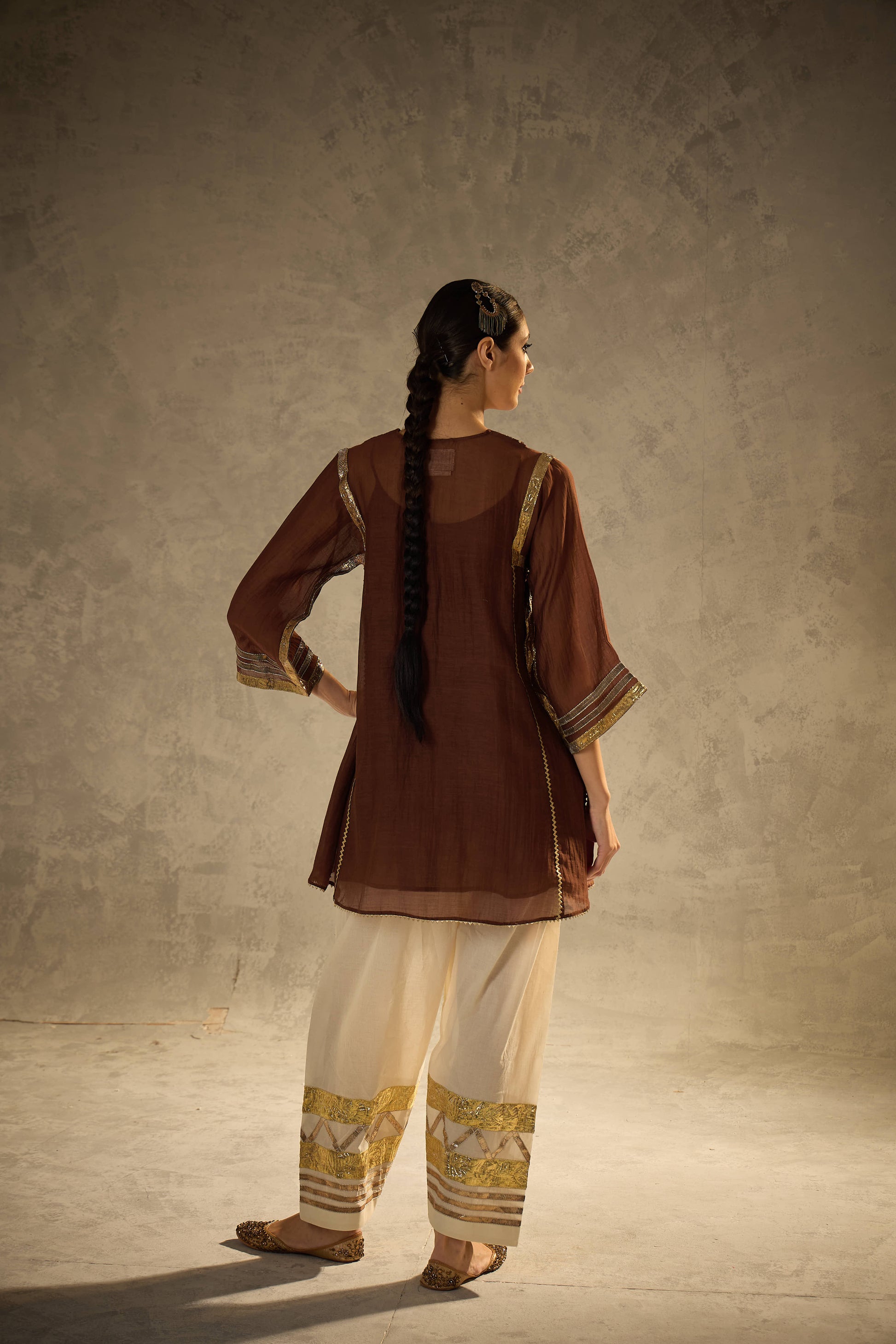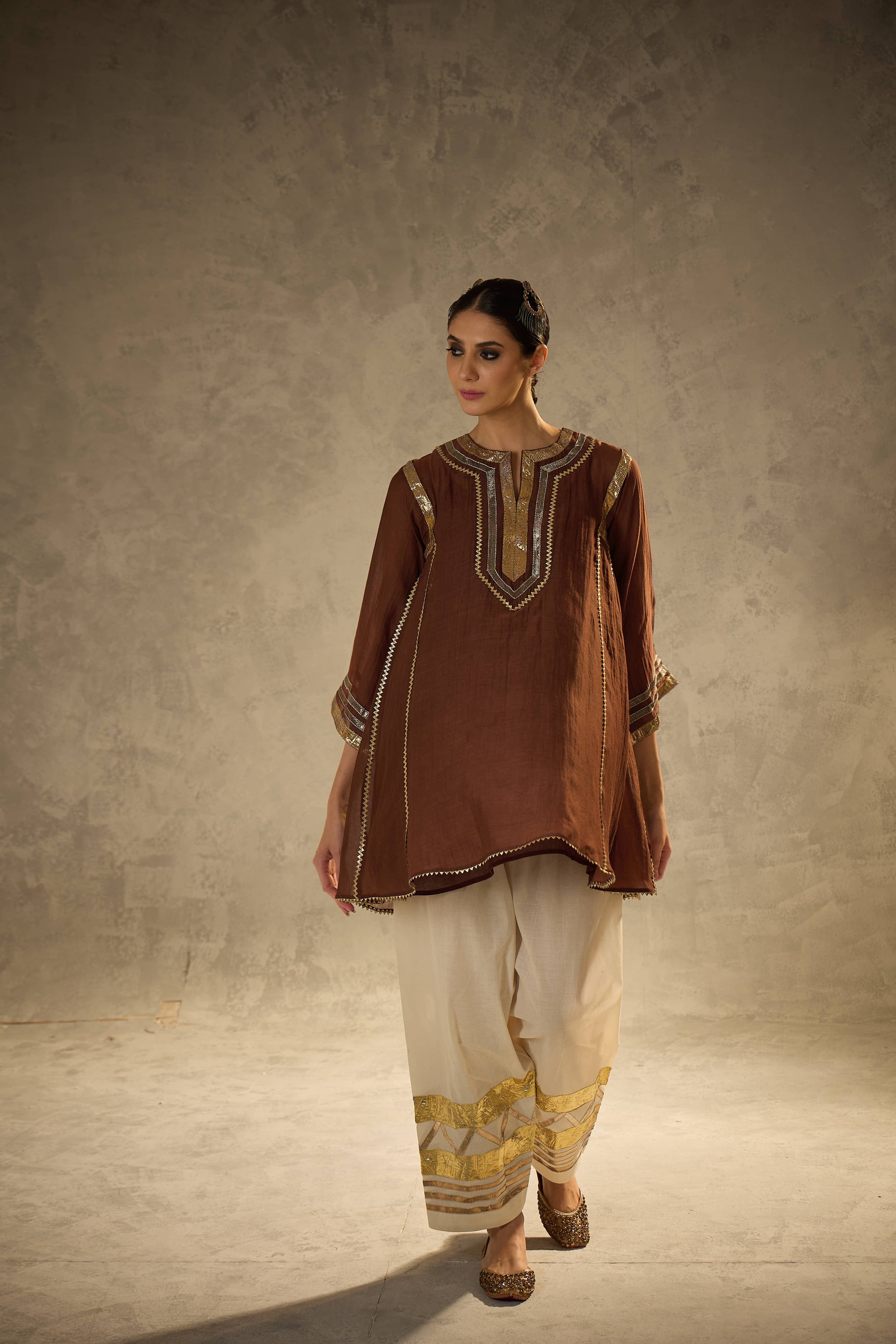 A beautiful brown kalidaar kurta crafted with delicate sucha gota work, blending classic cuts with modern refinement. The kurta features clean lines and thoughtful detailing, paired with our timeless gota salwar highlighted with artistic gota patterns.