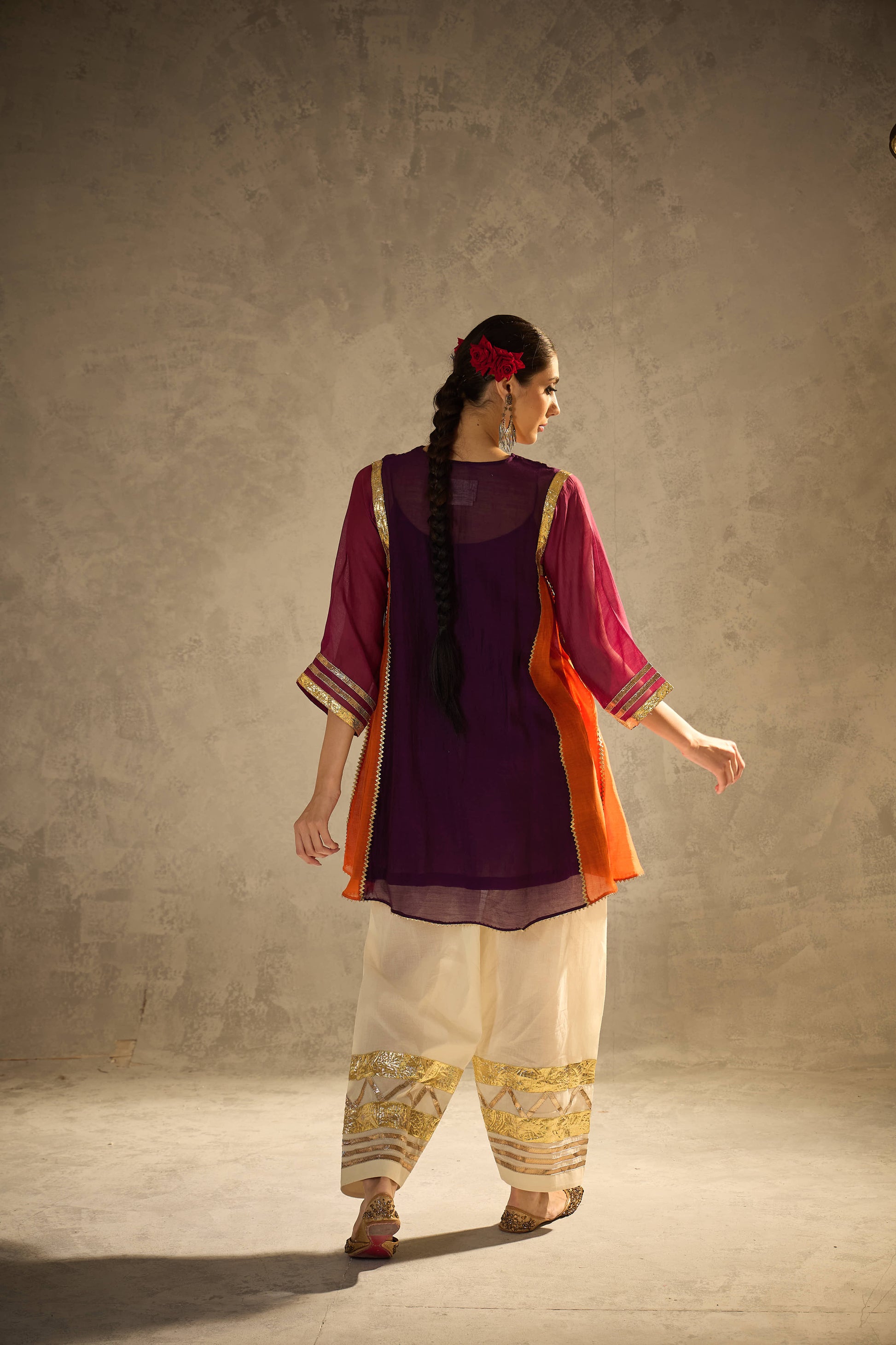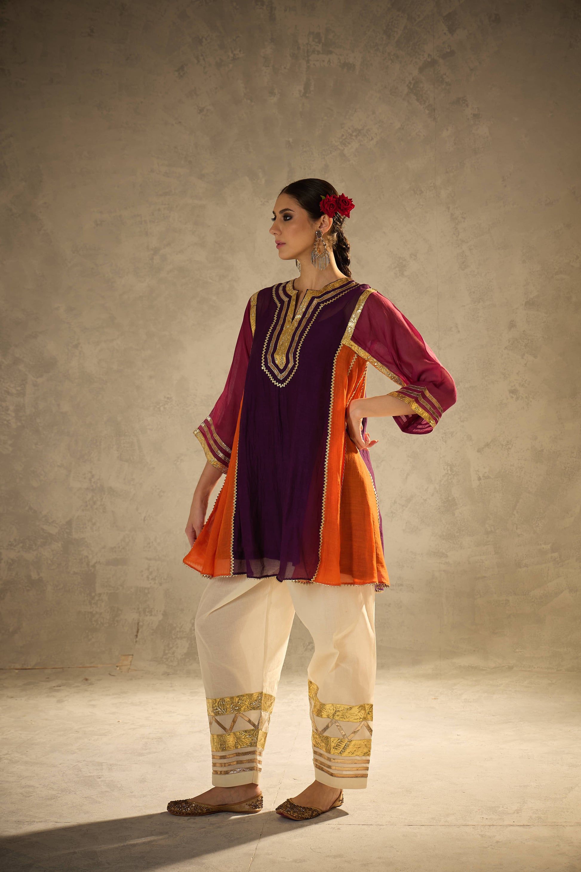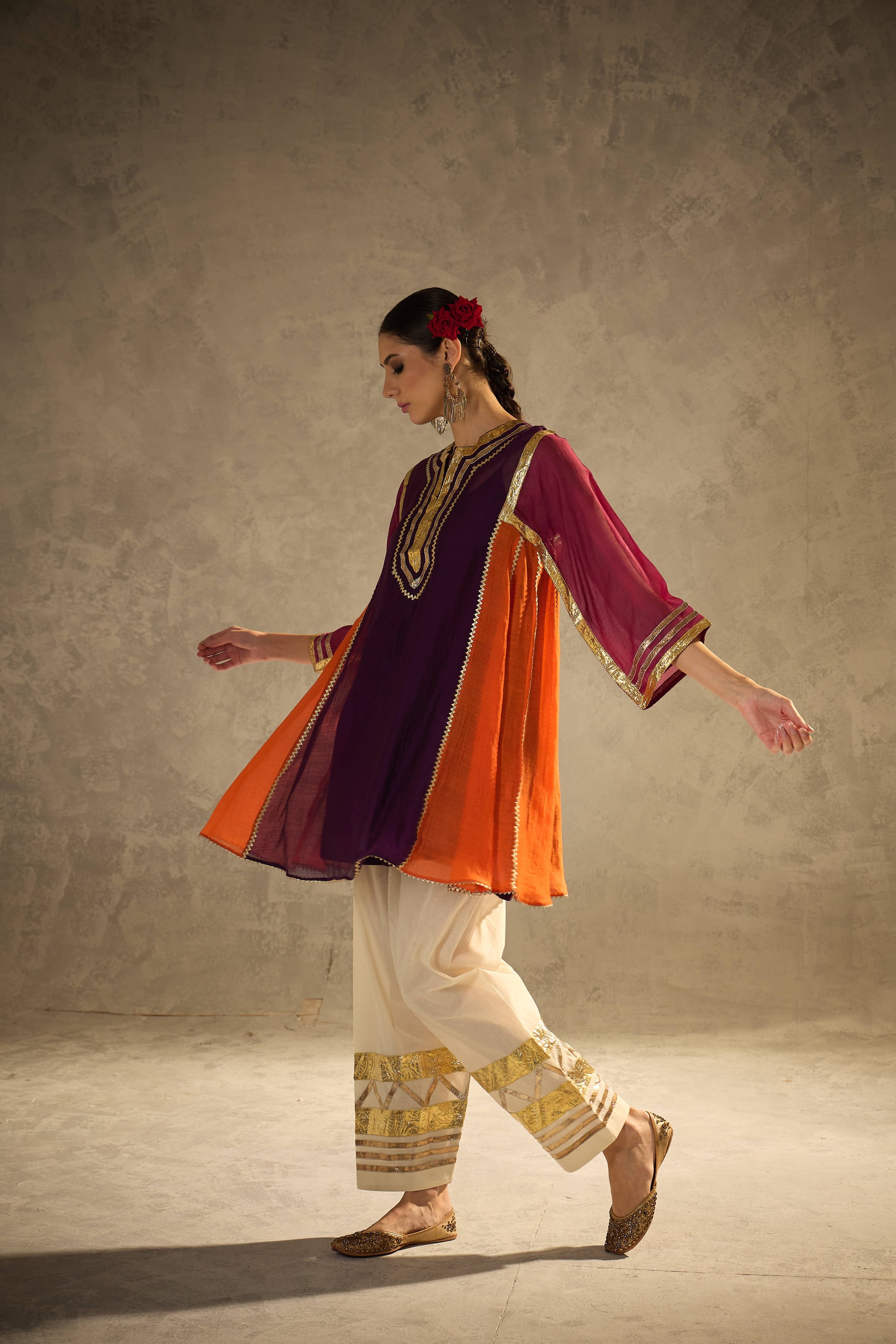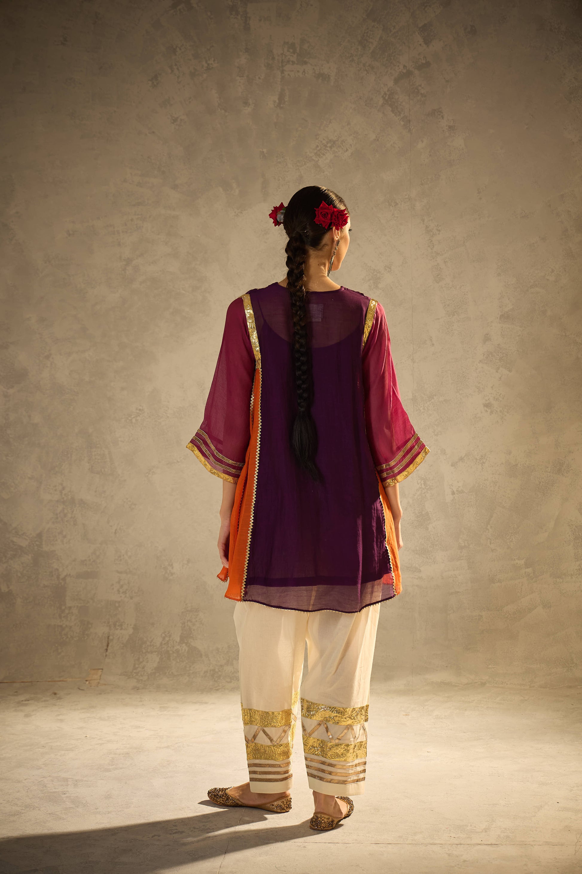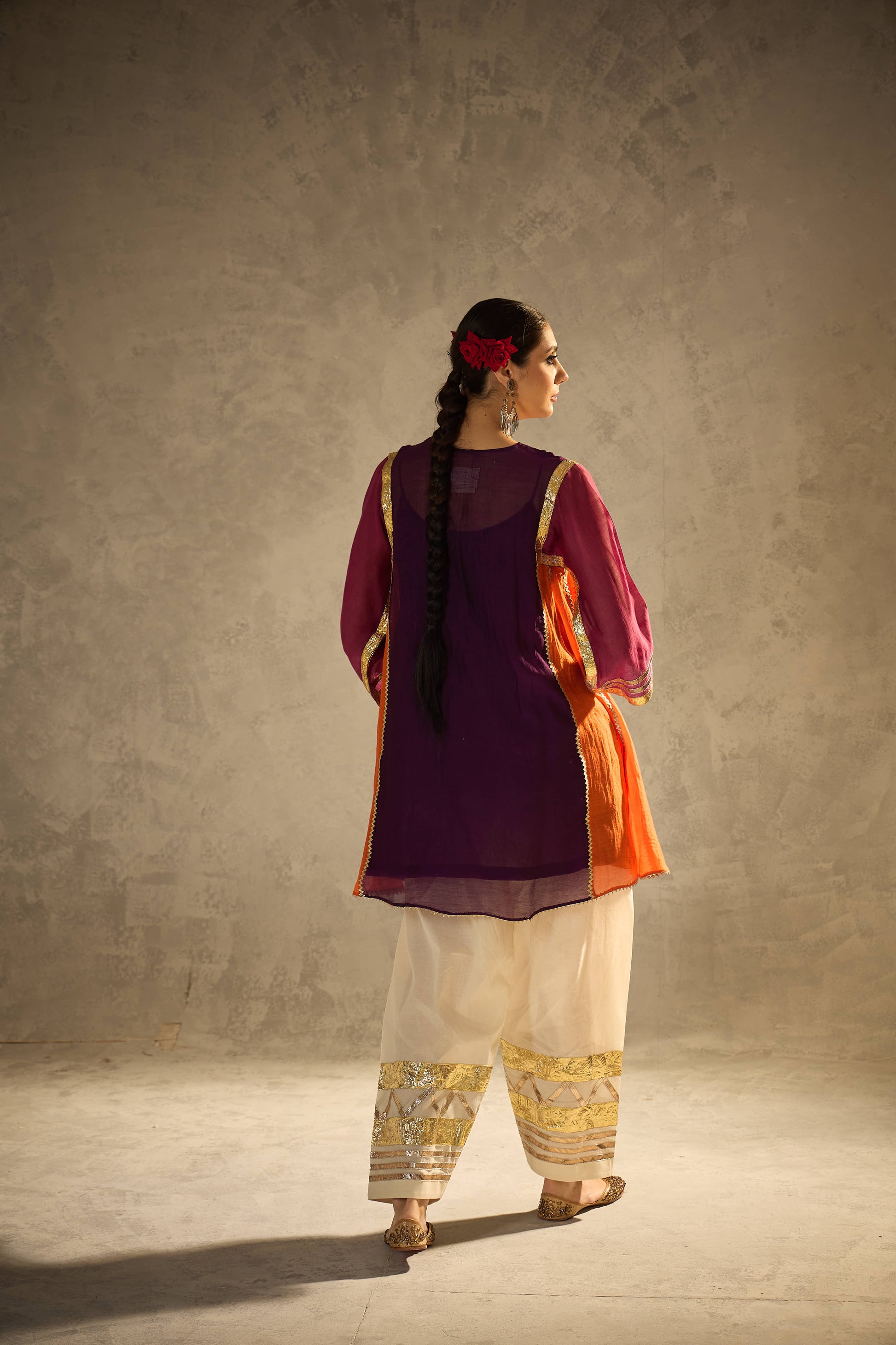 A Vibrant maroon N red kalidaar kurta crafted with delicate sucha gota work, blending classic cuts with modern refinement. The kurta features clean lines and thoughtful detailing, paired with our timeless gota salwar highlighted with artistic gota patterns.