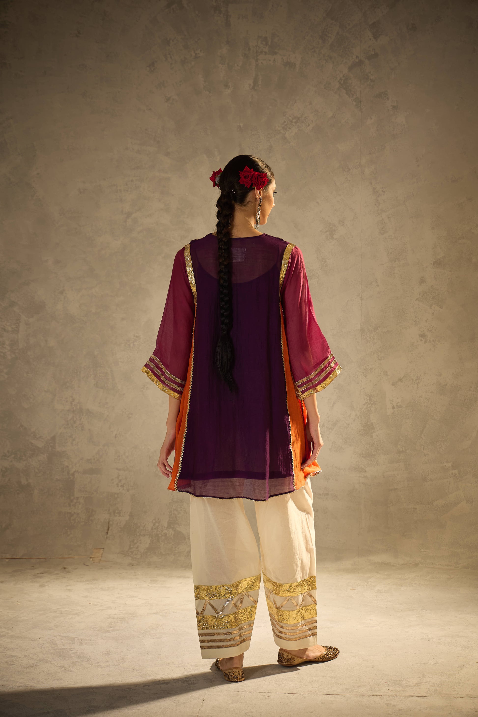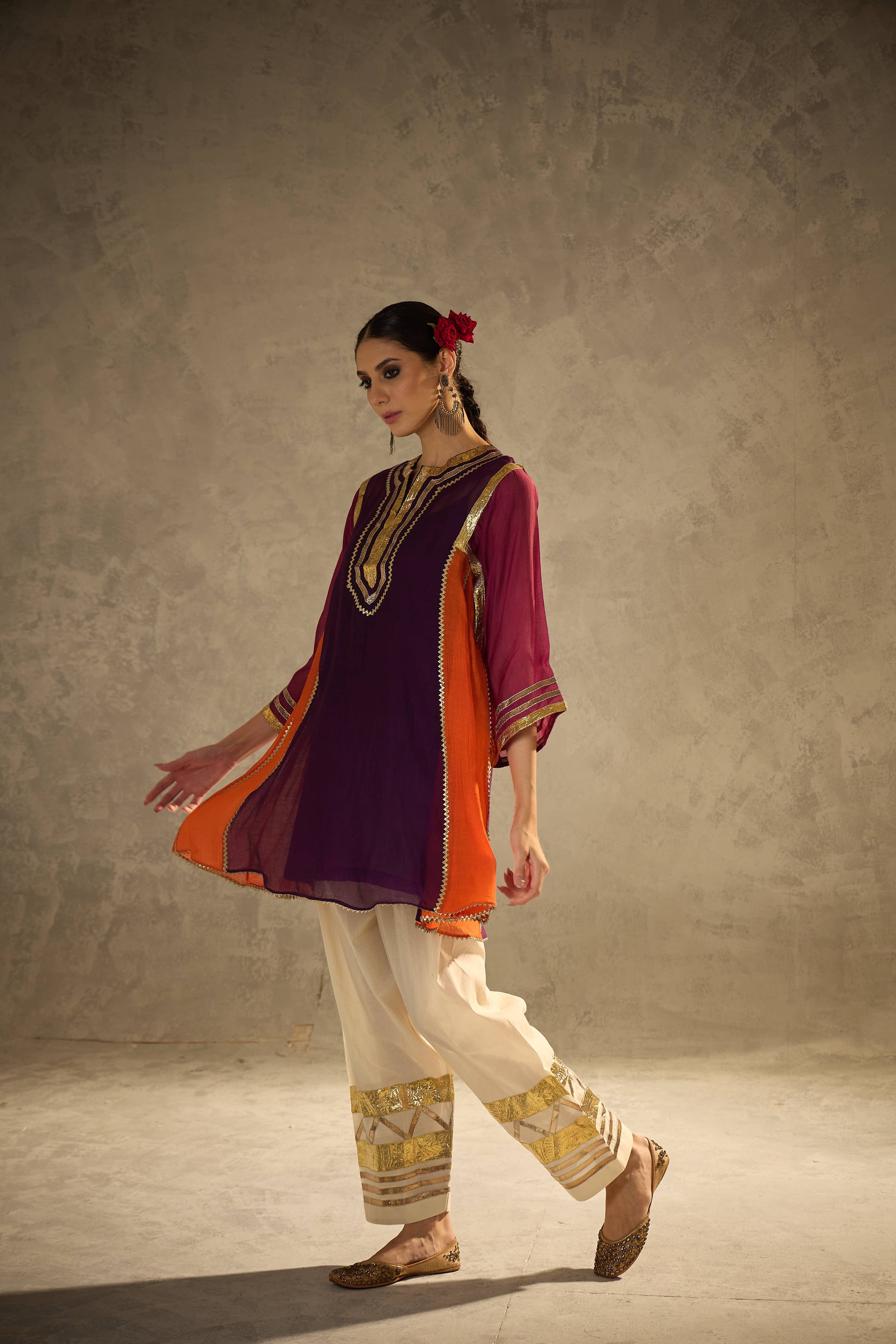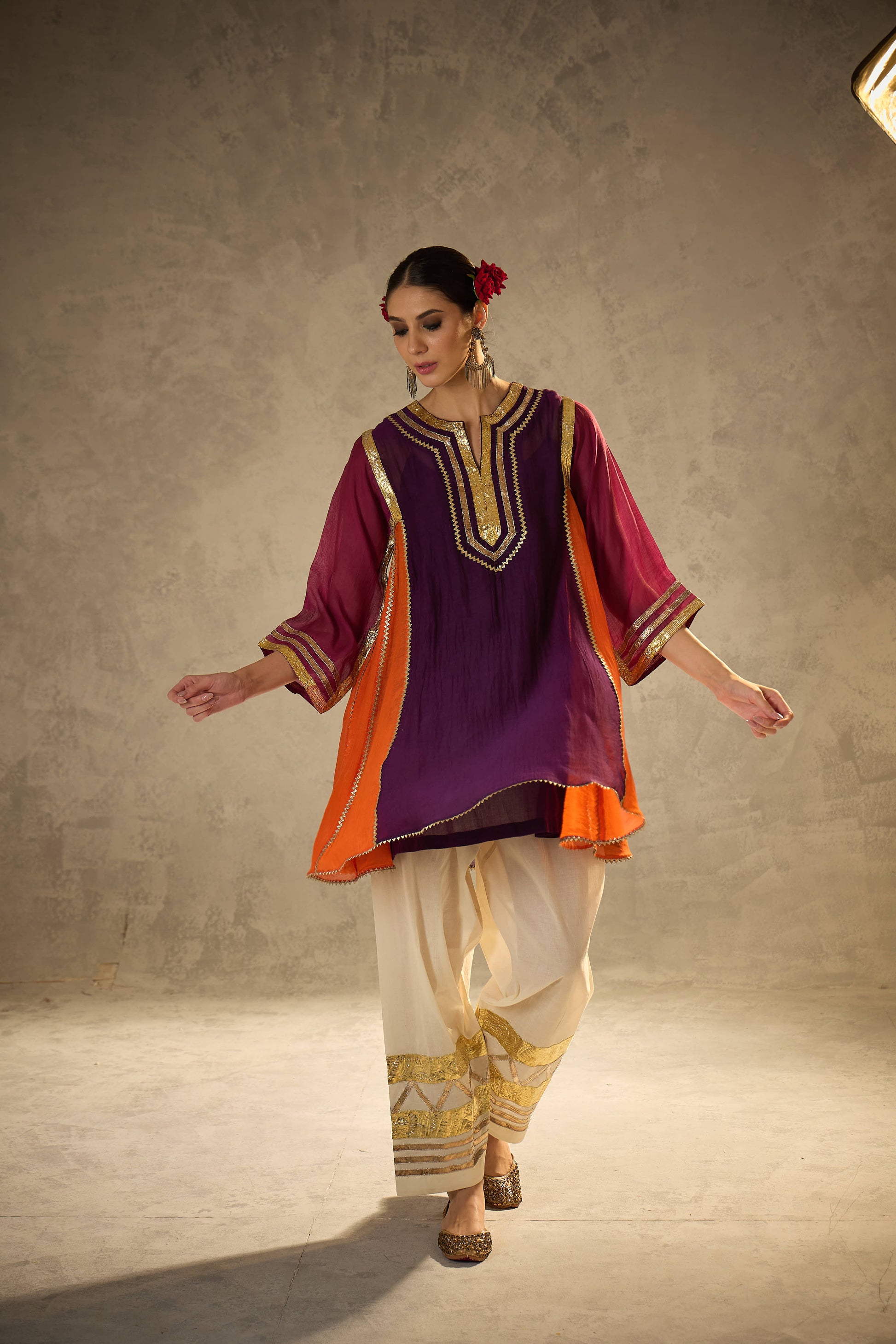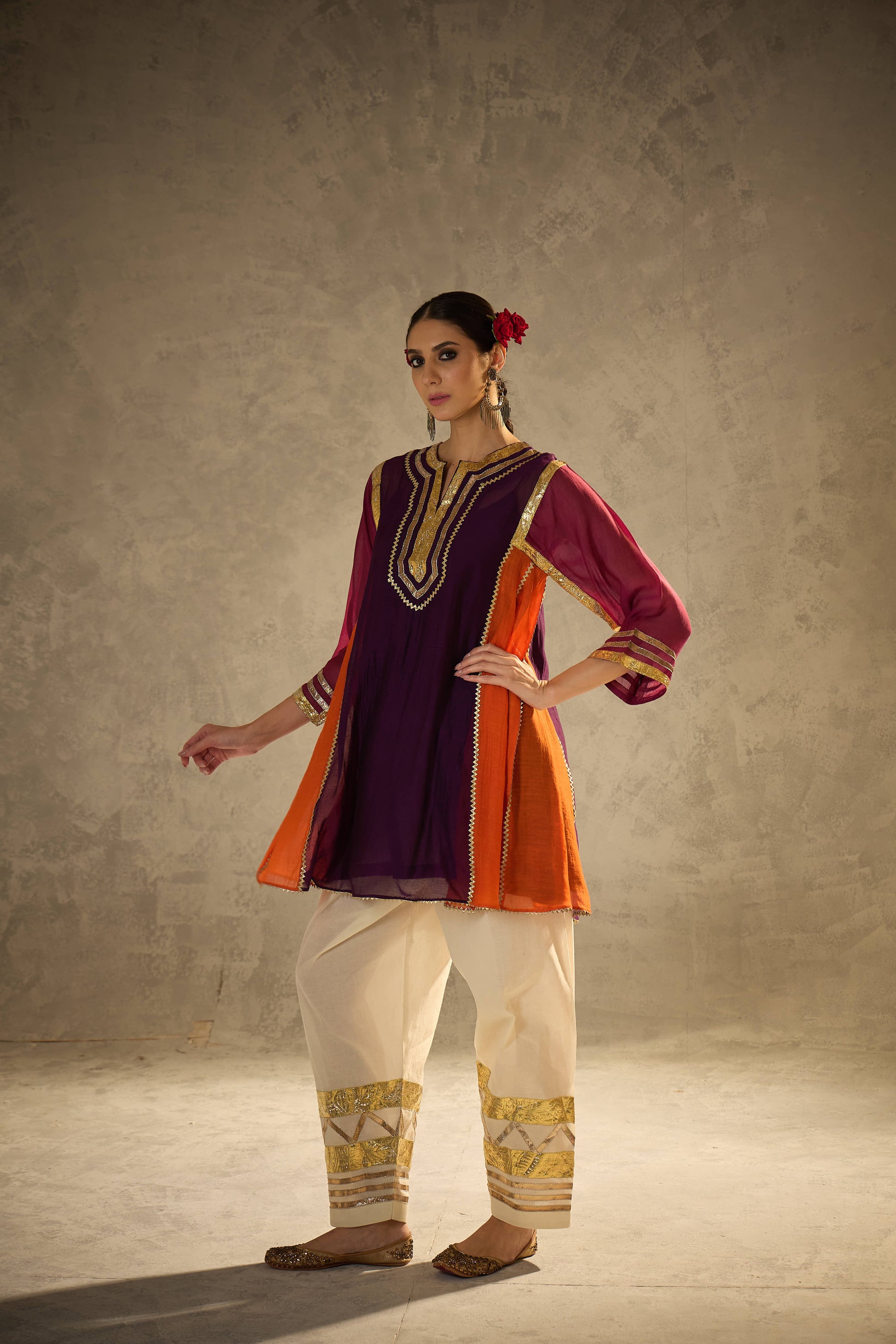 A Vibrant maroon N red kalidaar kurta crafted with delicate sucha gota work, blending classic cuts with modern refinement. The kurta features clean lines and thoughtful detailing, paired with our timeless gota salwar highlighted with artistic gota patterns.