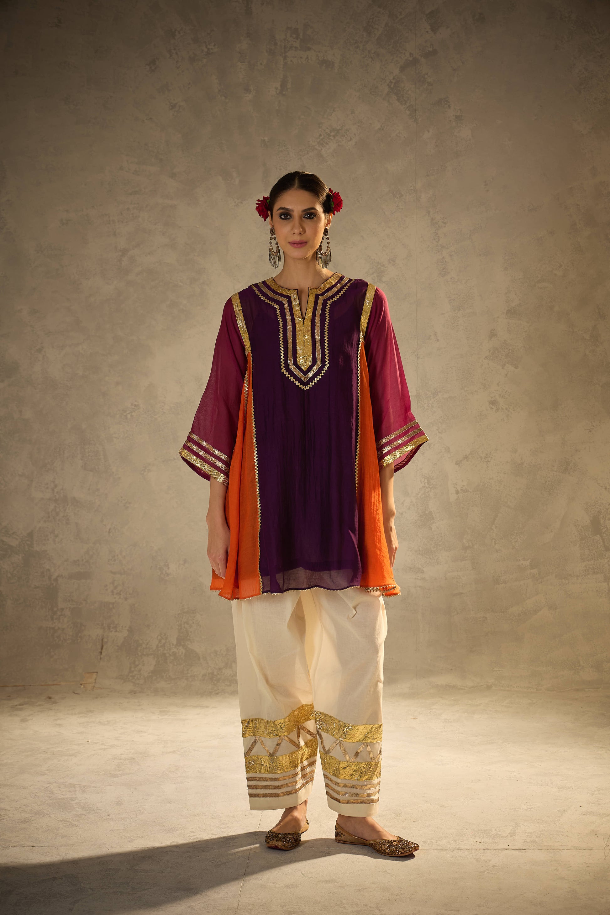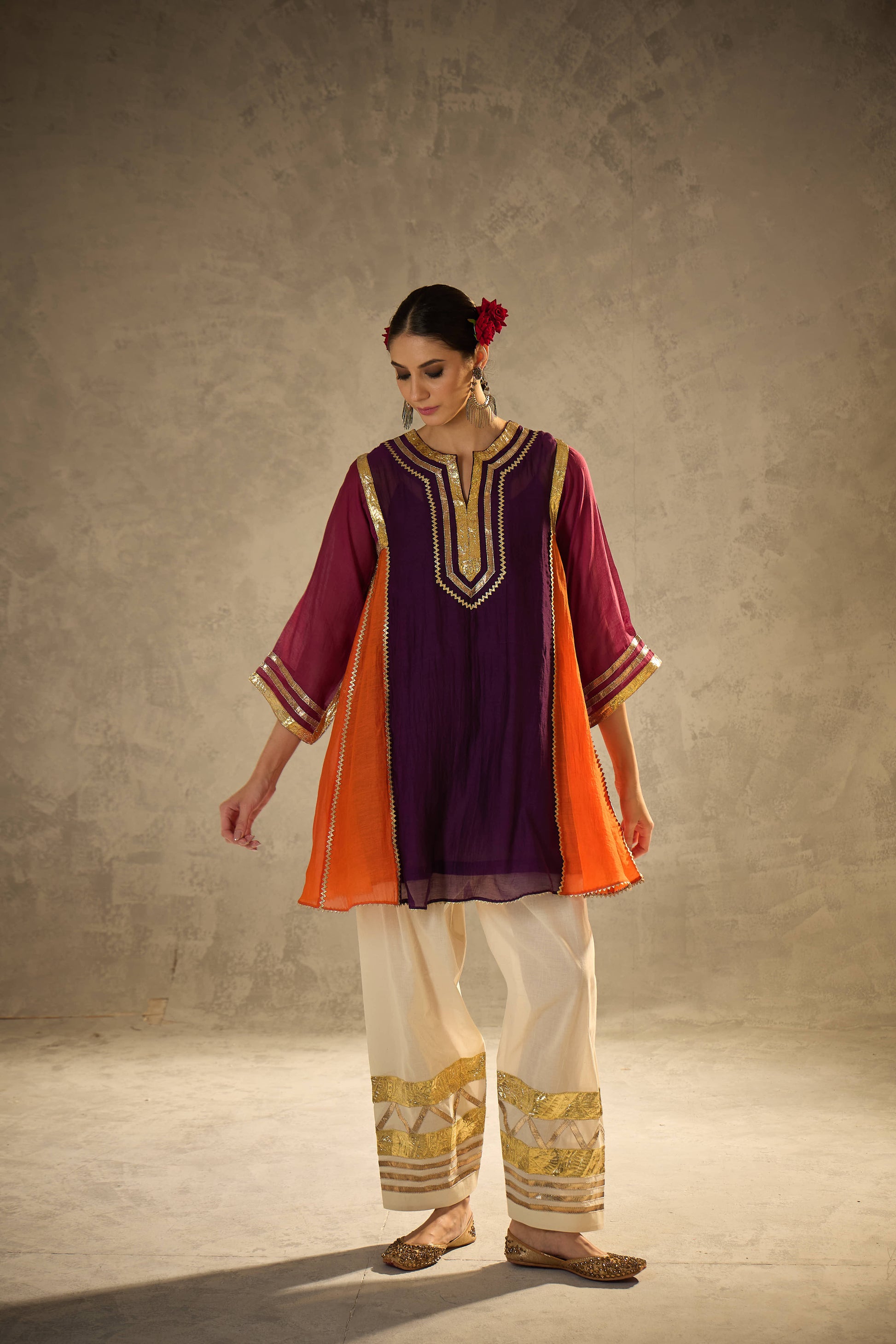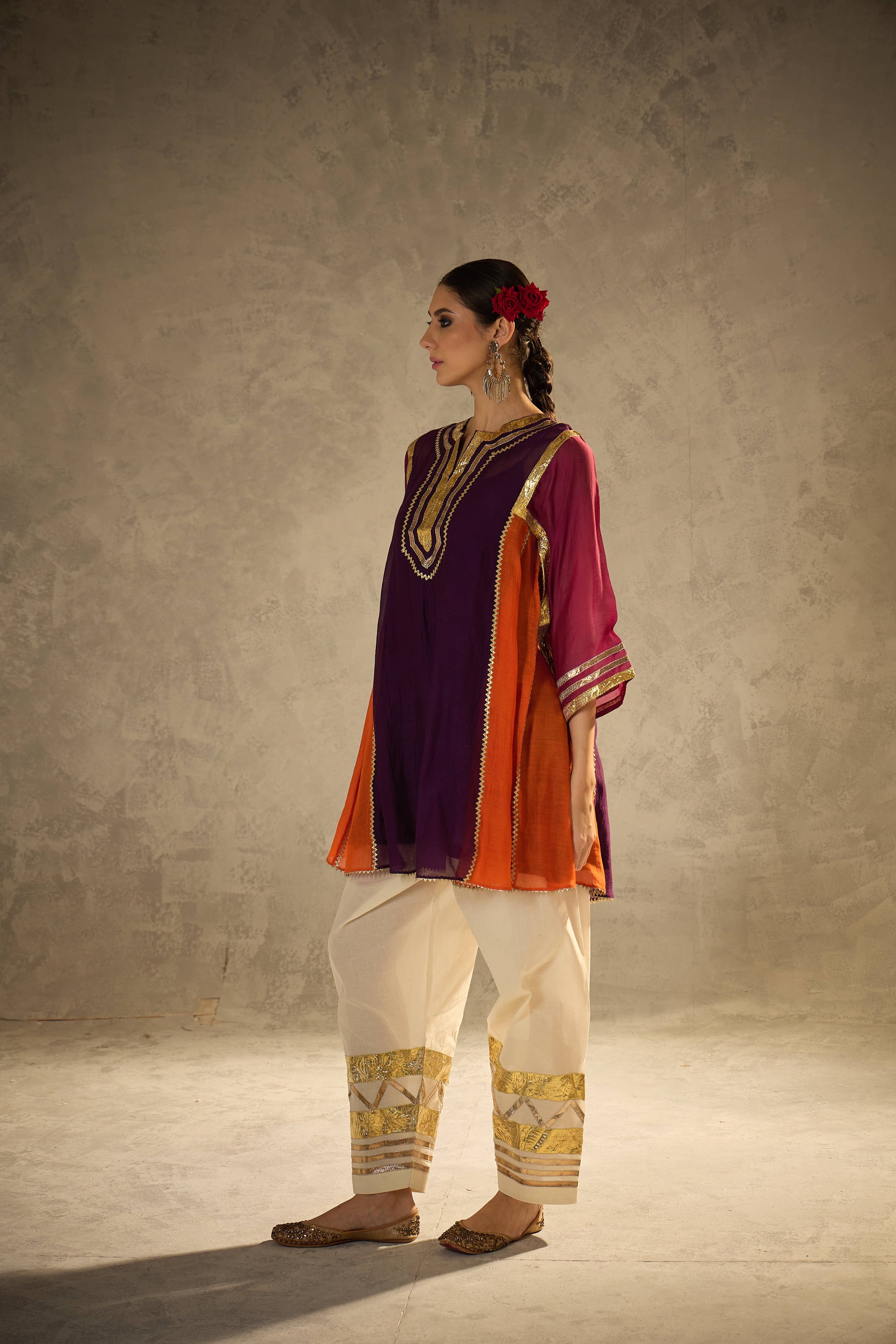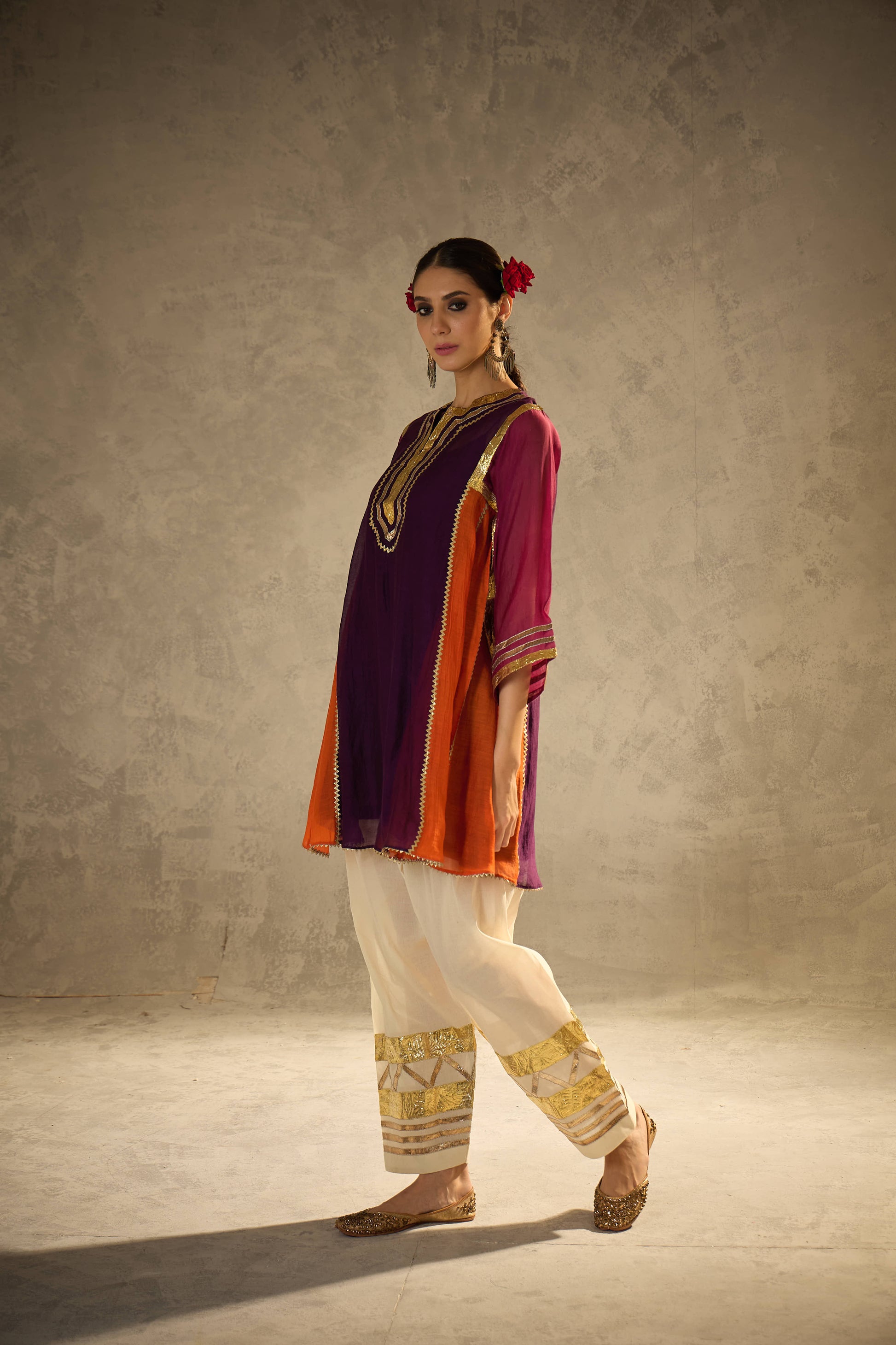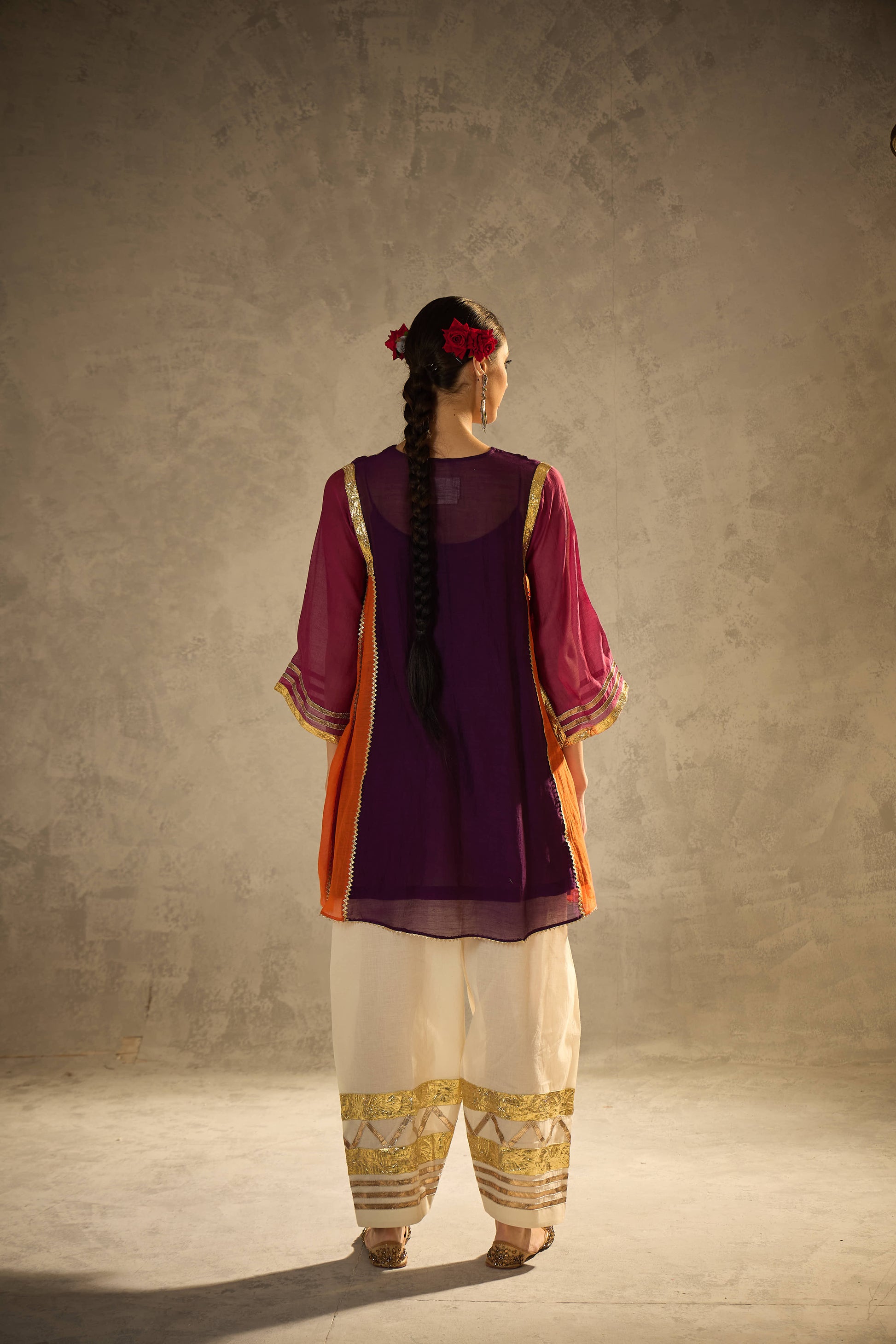 A Vibrant maroon N red kalidaar kurta crafted with delicate sucha gota work, blending classic cuts with modern refinement. The kurta features clean lines and thoughtful detailing, paired with our timeless gota salwar highlighted with artistic gota patterns.