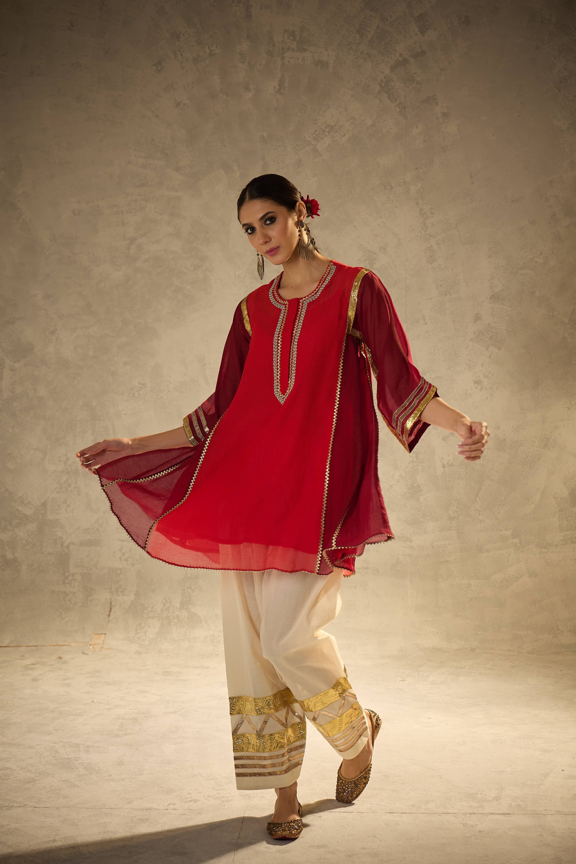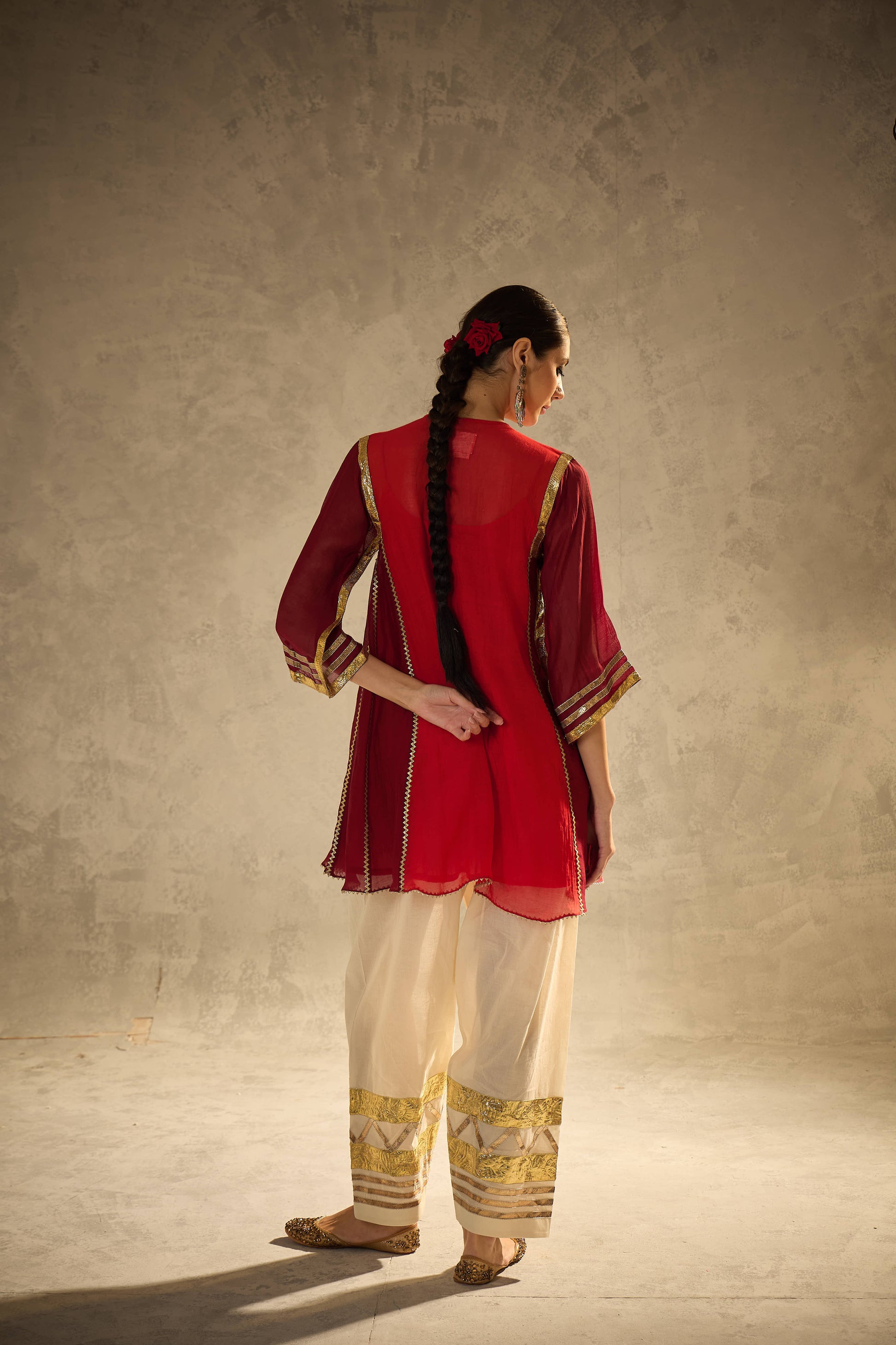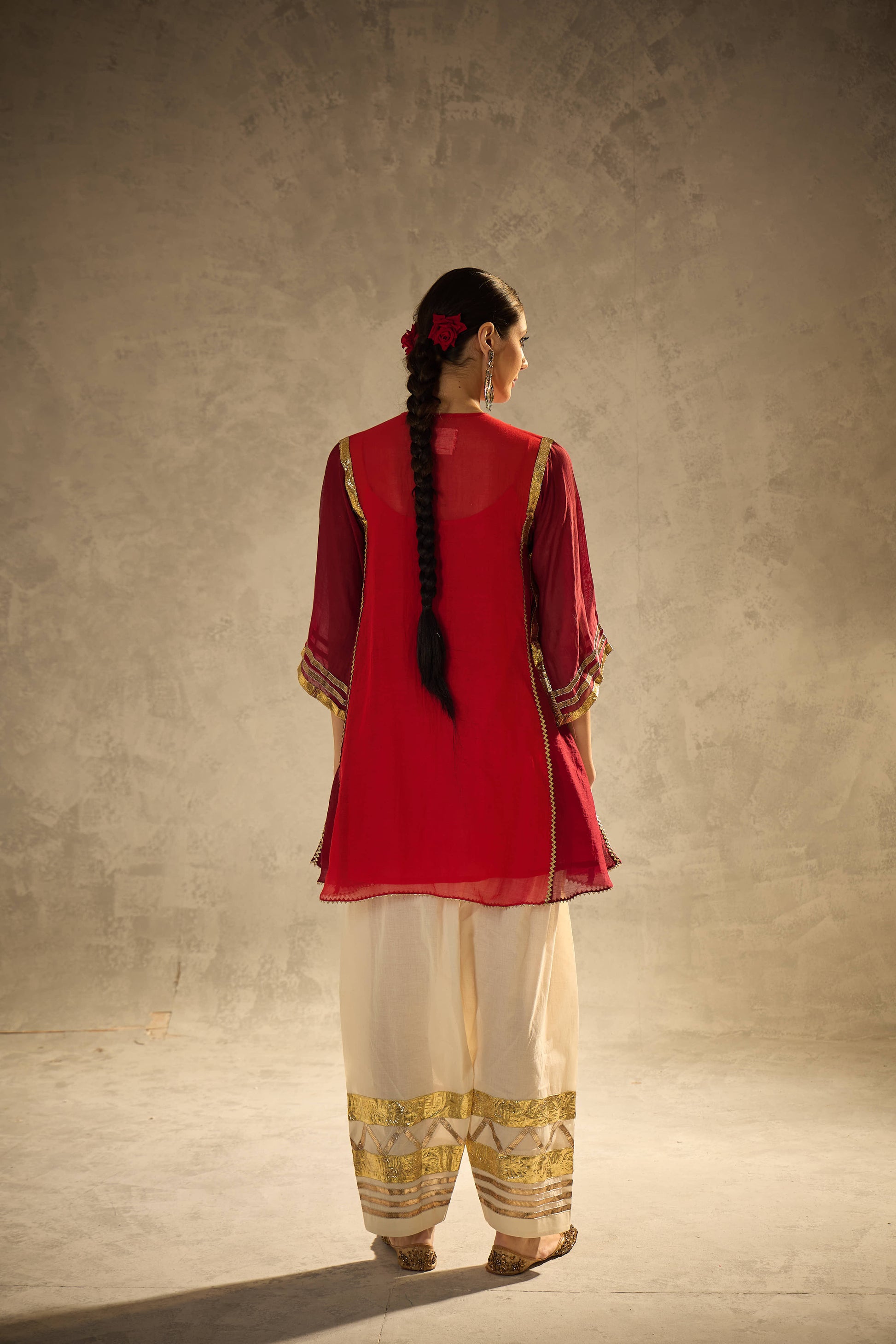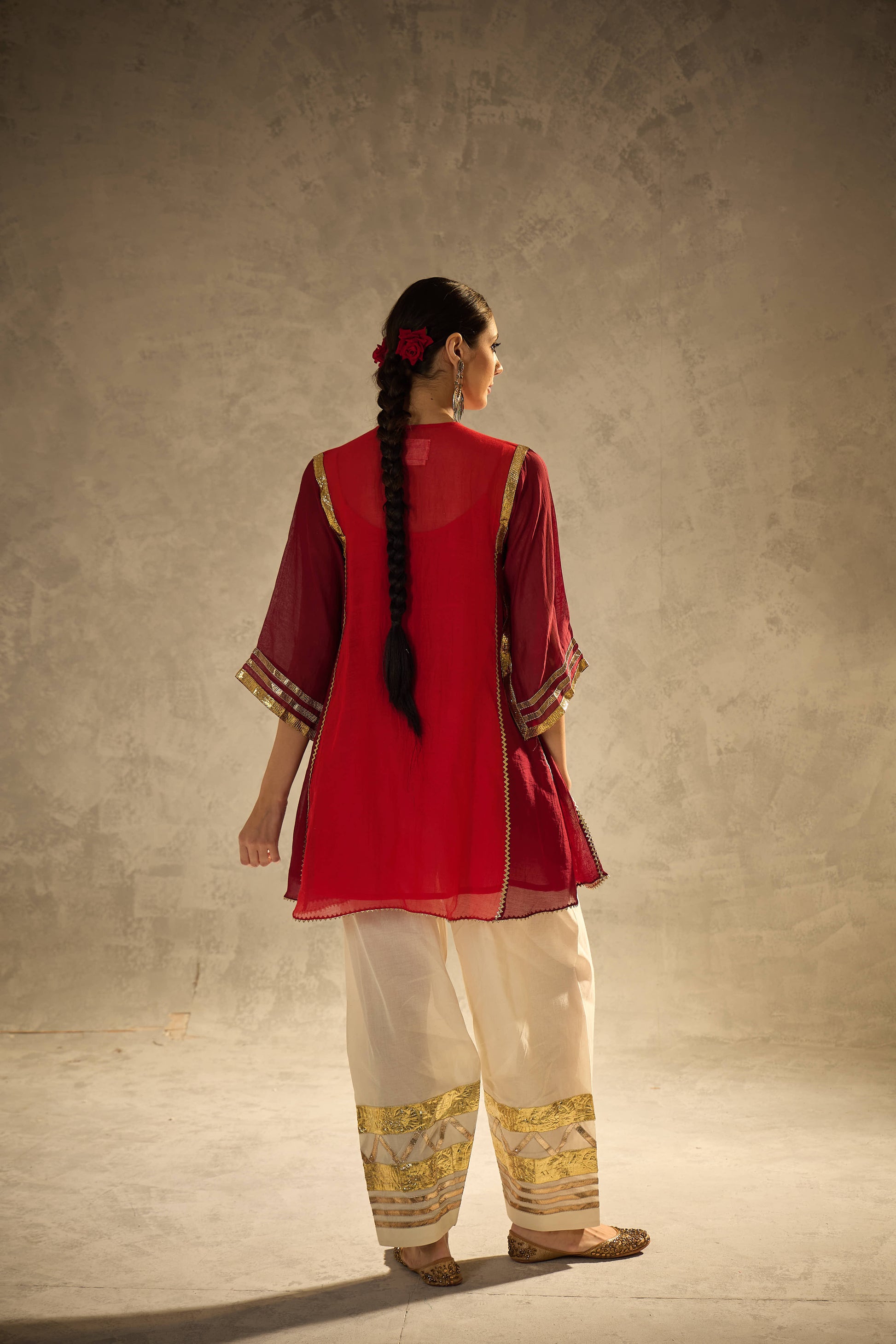 A vibrant red kalidaar kurta crafted with delicate sucha gota work, blending classic cuts with modern refinement. The kurta features clean lines and thoughtful detailing, paired with our timeless gota salwar highlighted with artistic gota patterns.