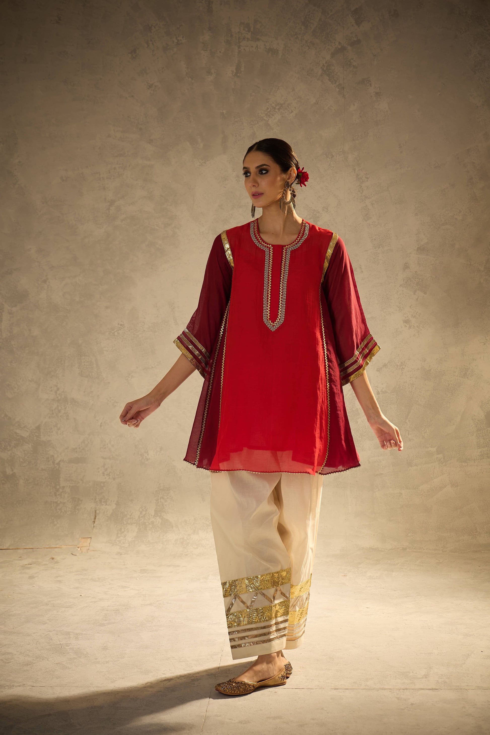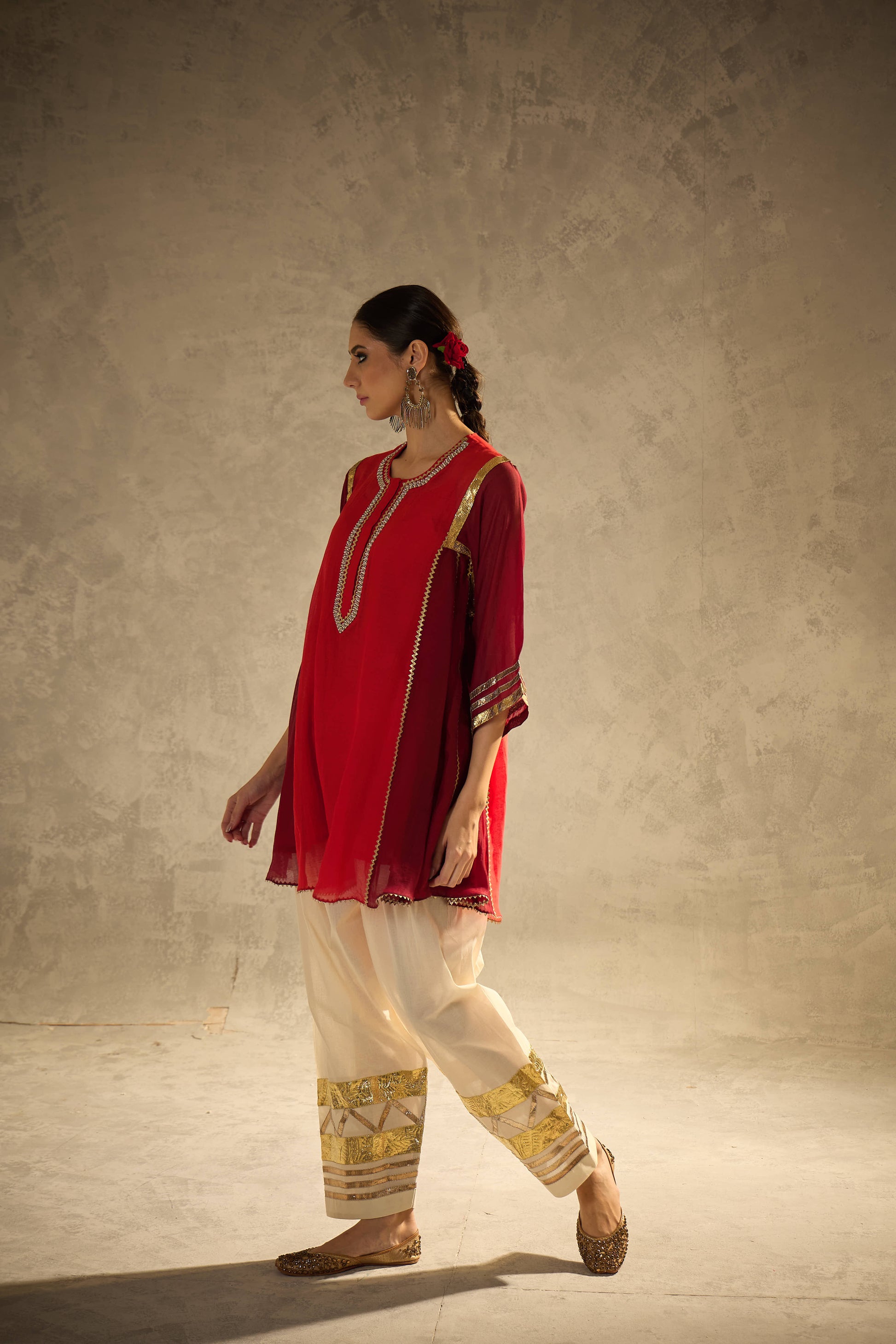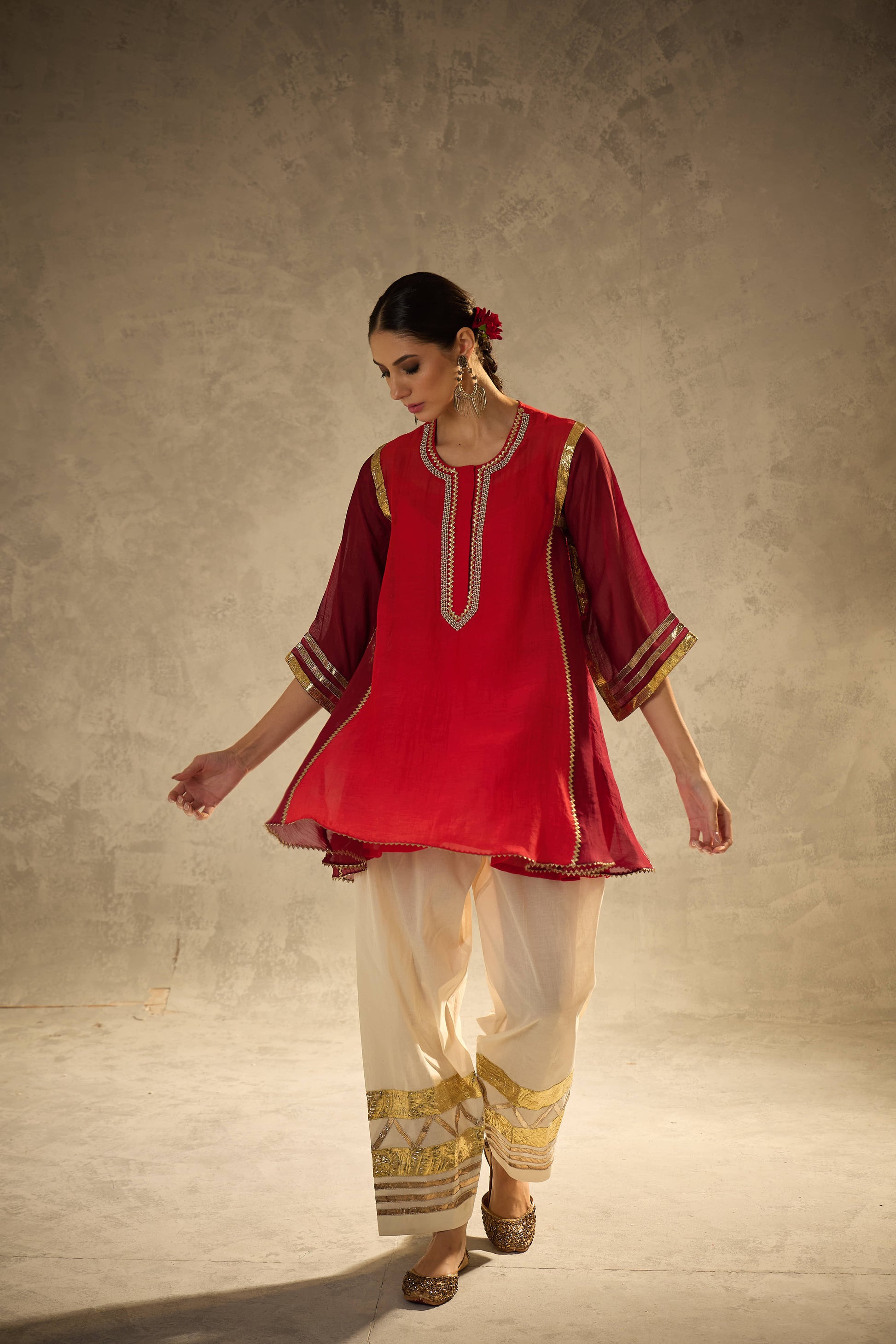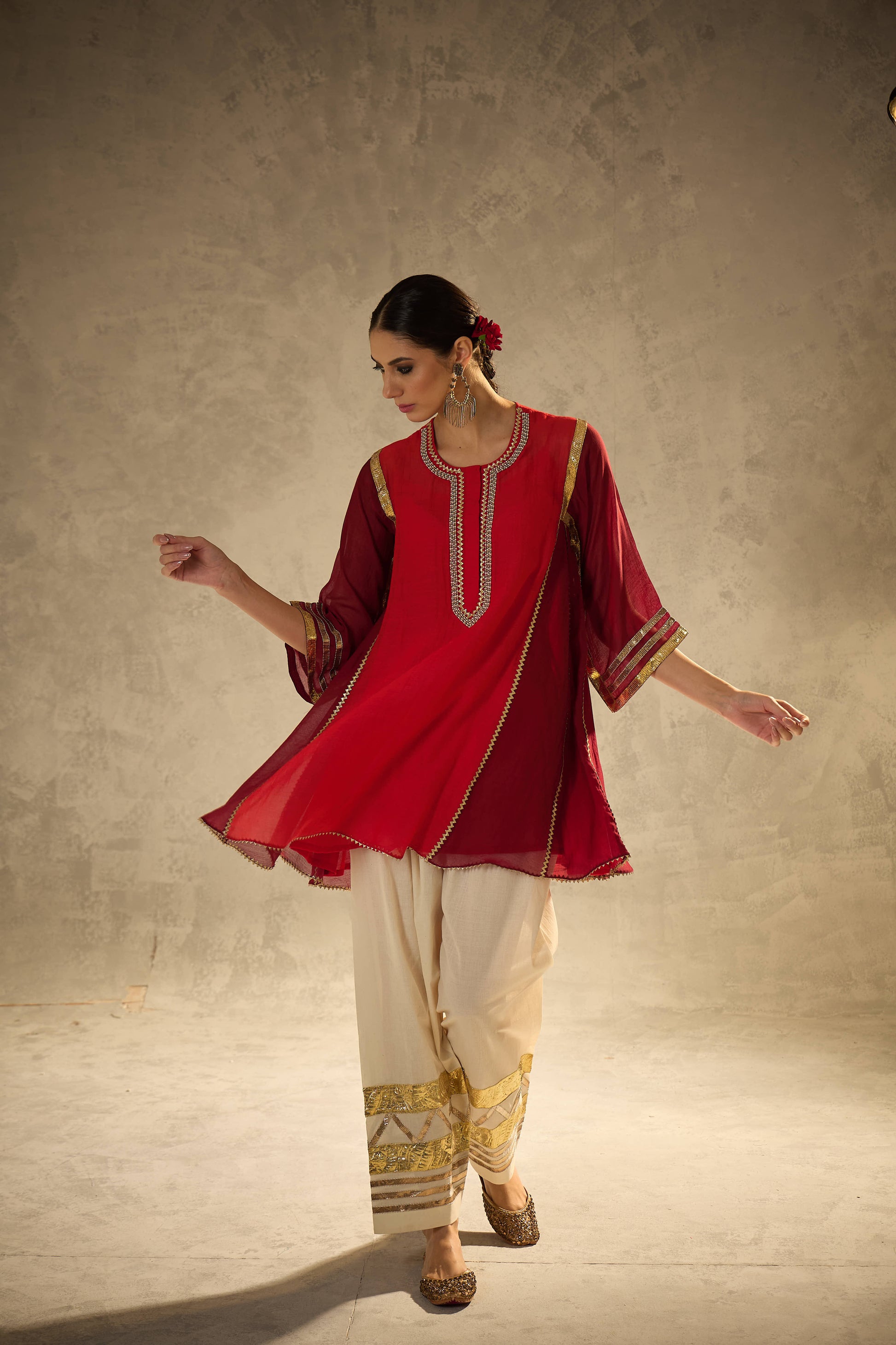 A vibrant red kalidaar kurta crafted with delicate sucha gota work, blending classic cuts with modern refinement. The kurta features clean lines and thoughtful detailing, paired with our timeless gota salwar highlighted with artistic gota patterns.