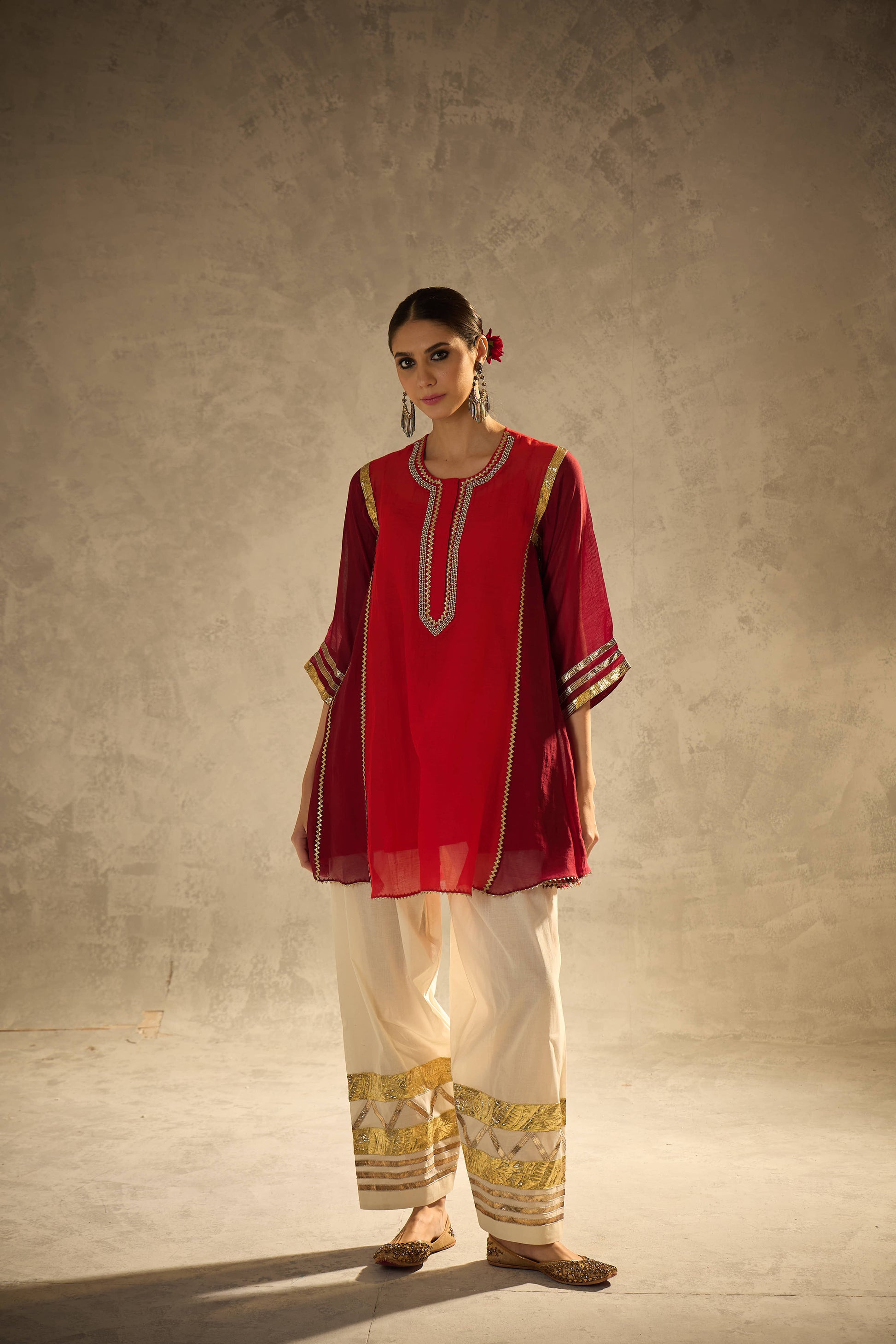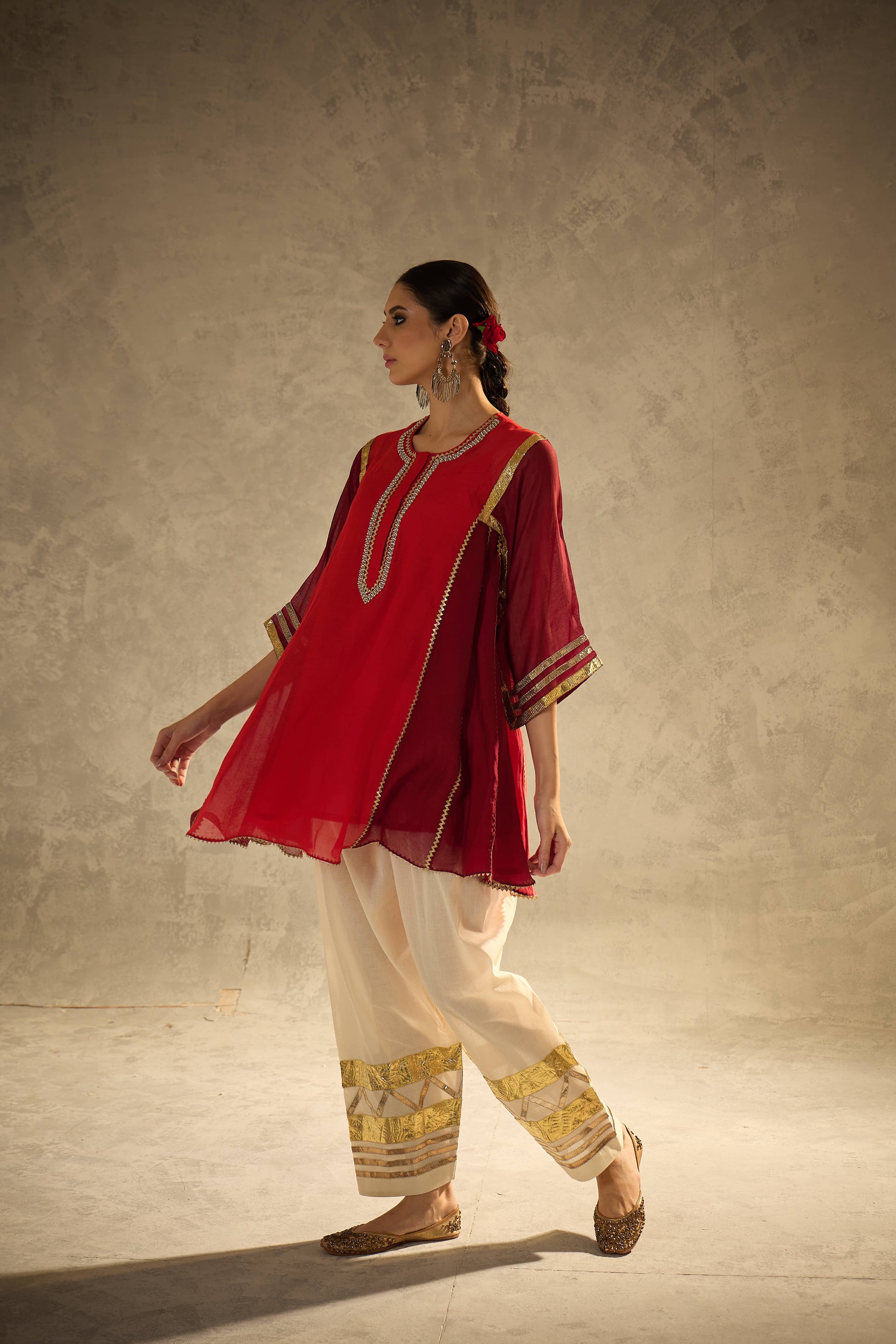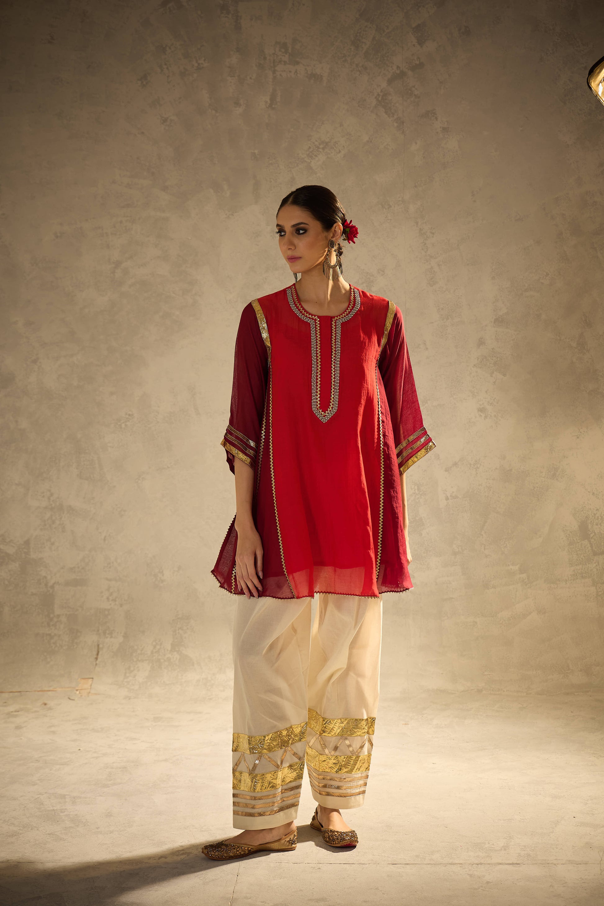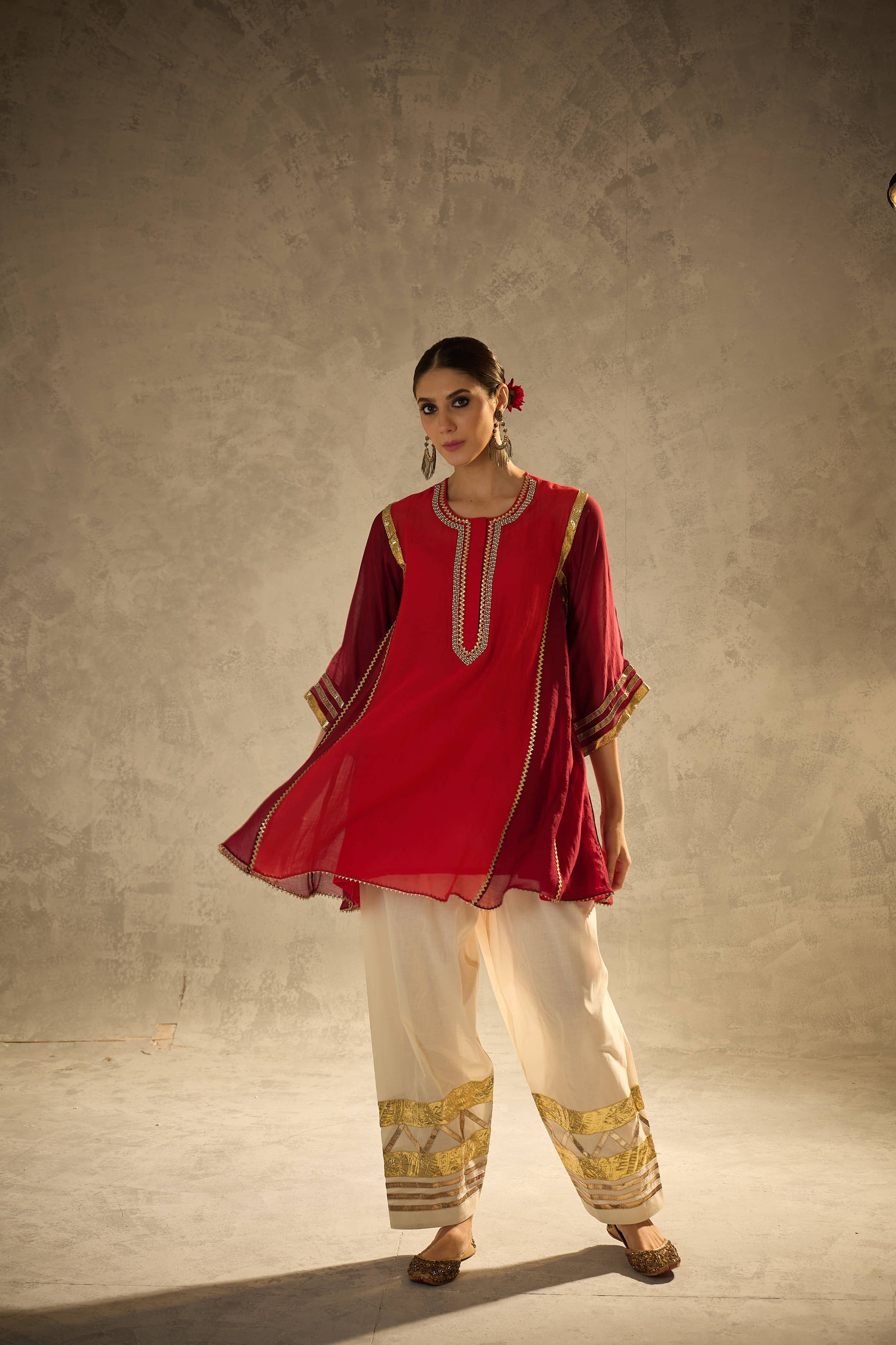 A vibrant red kalidaar kurta crafted with delicate sucha gota work, blending classic cuts with modern refinement. The kurta features clean lines and thoughtful detailing, paired with our timeless gota salwar highlighted with artistic gota patterns.