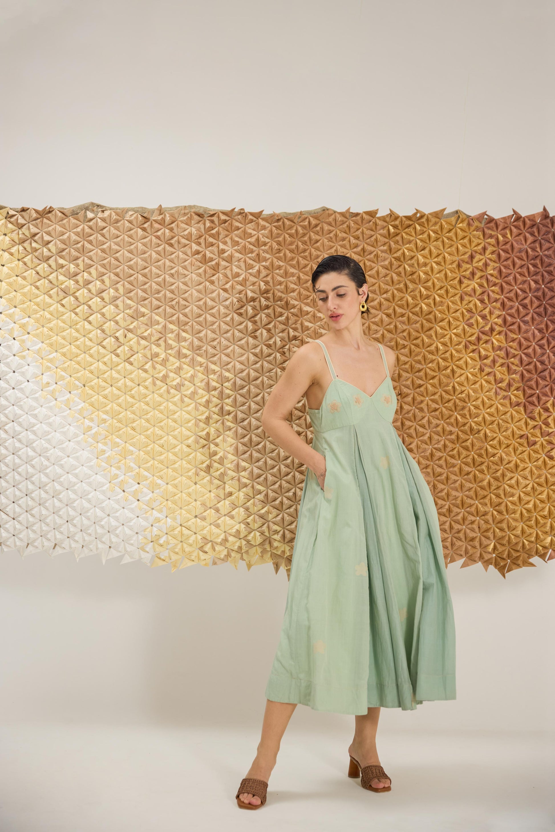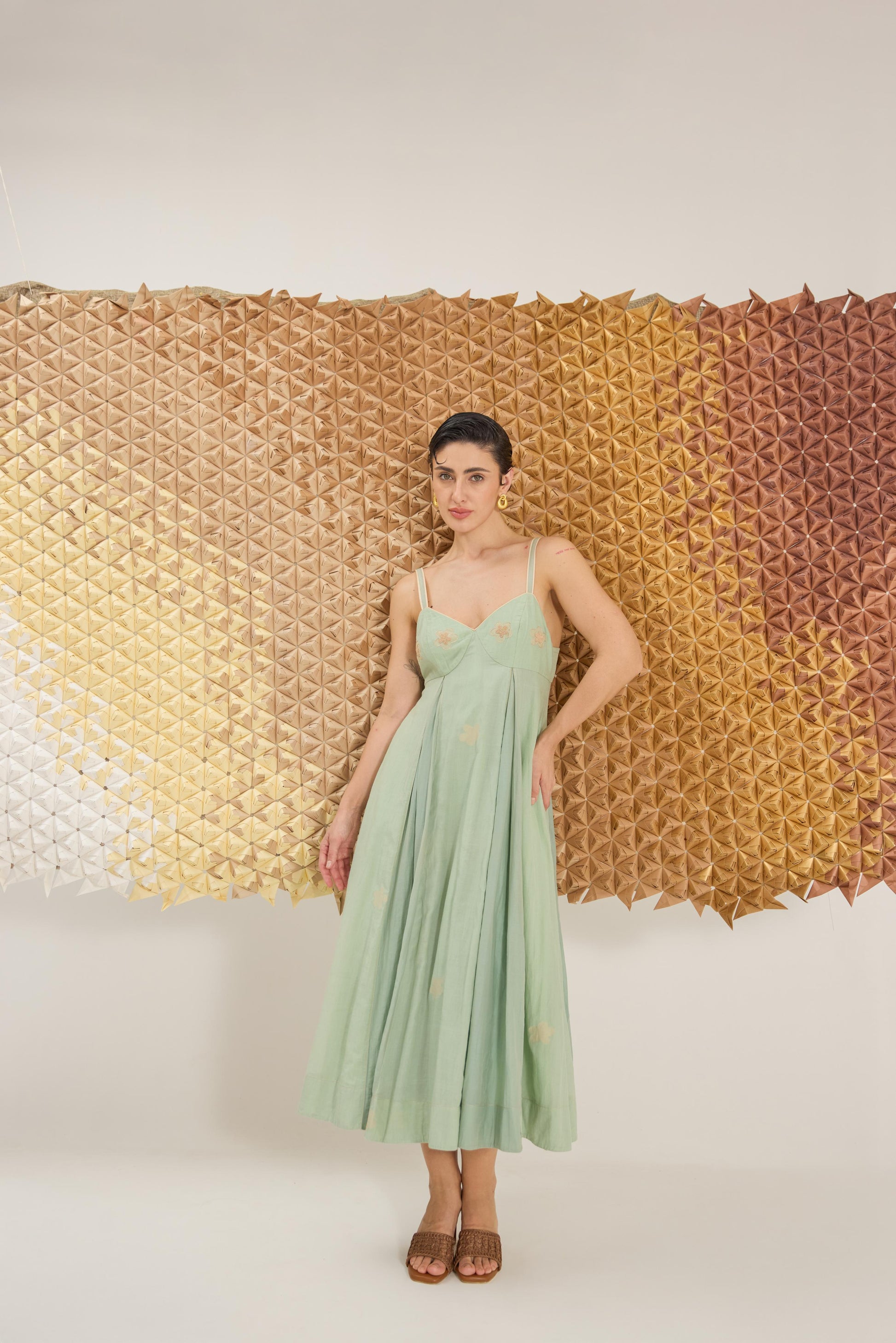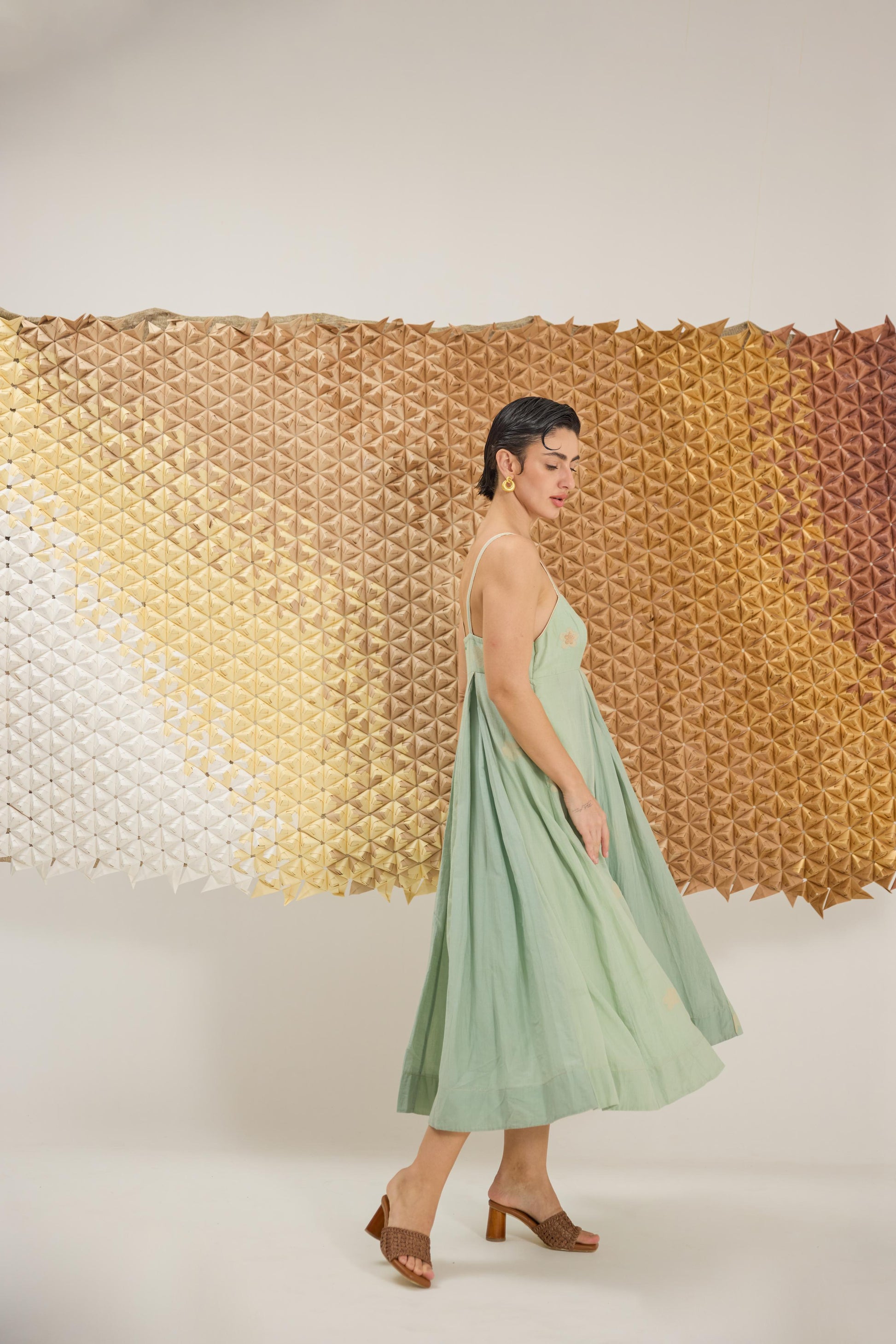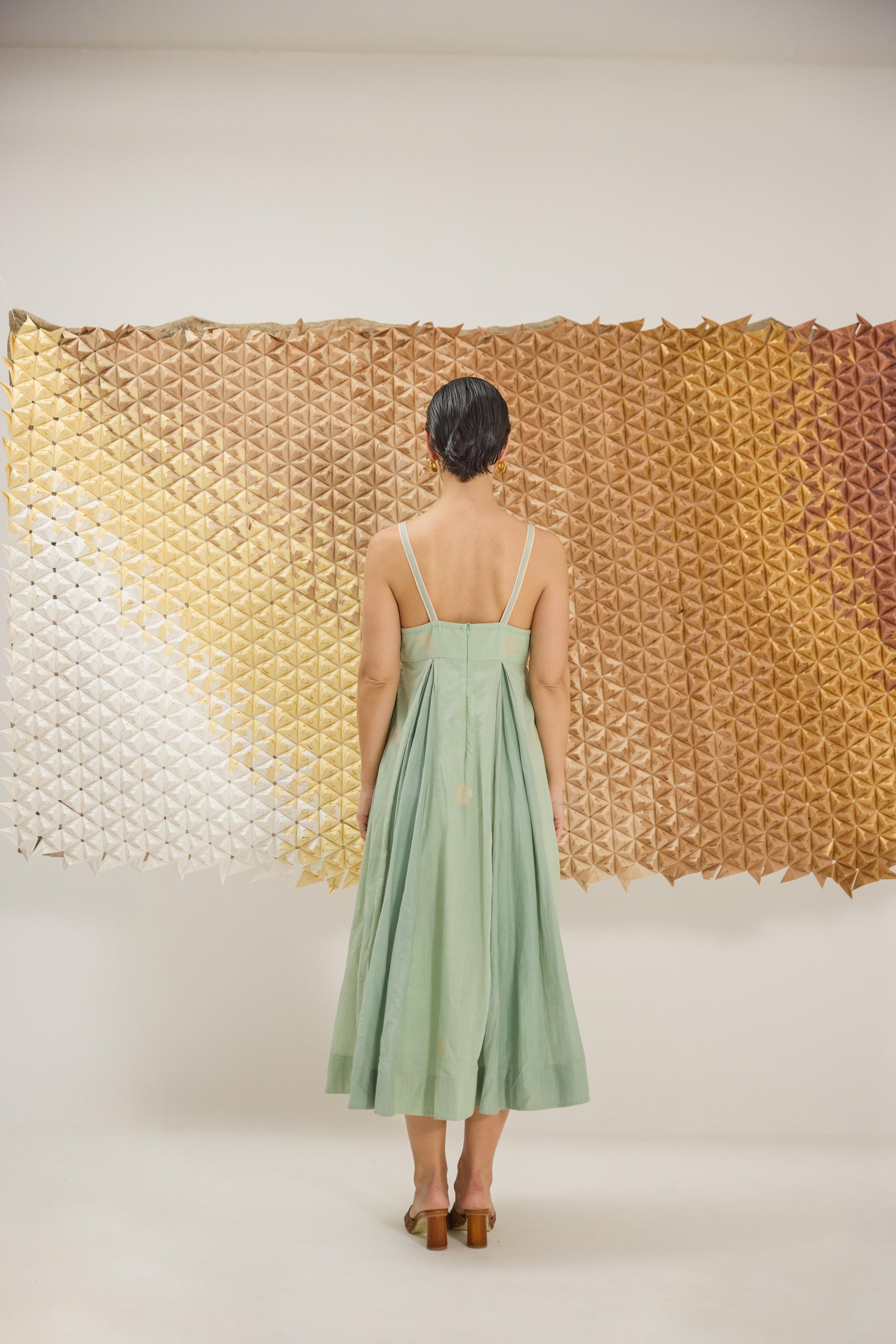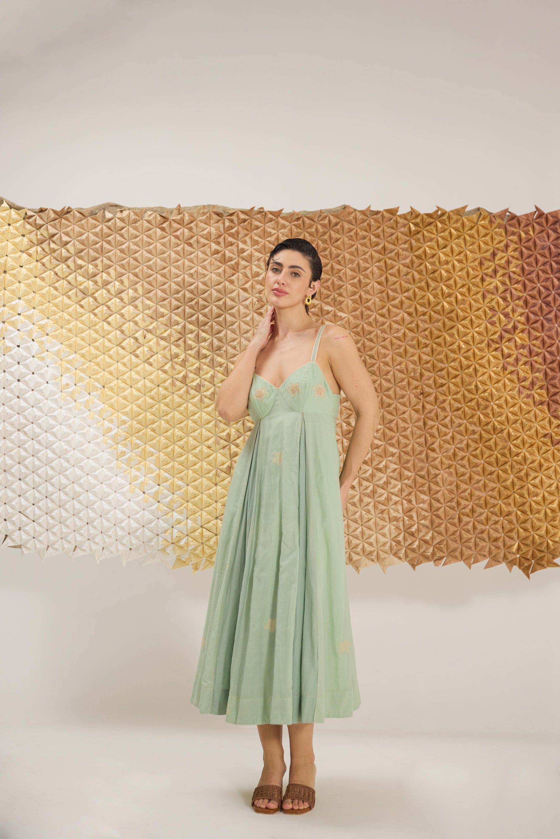 Featuring a strappy easy fit dress crafted from handwoven cotton silk fabric in floral Jamdani weave technique, this dress is a statement for minimal and chic style with a strategic box pleat and hand embroidery adding the touch of elegance to it.