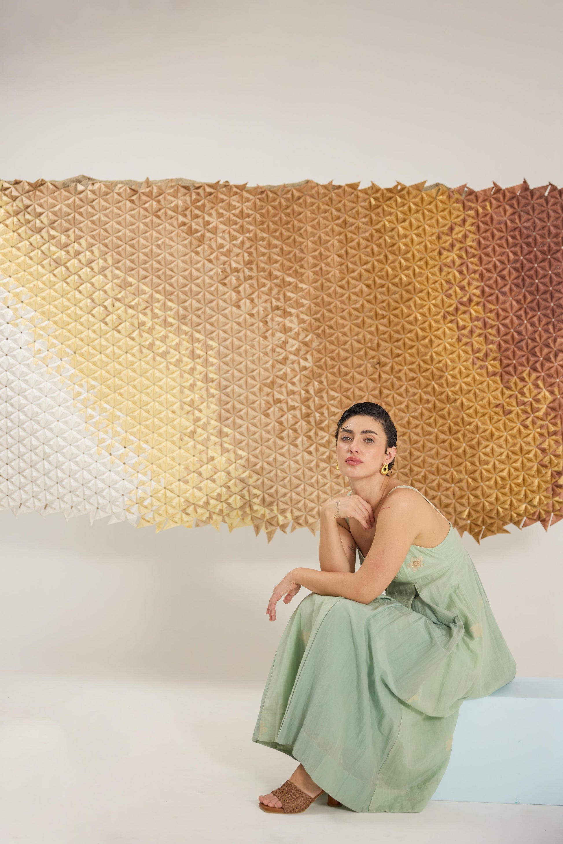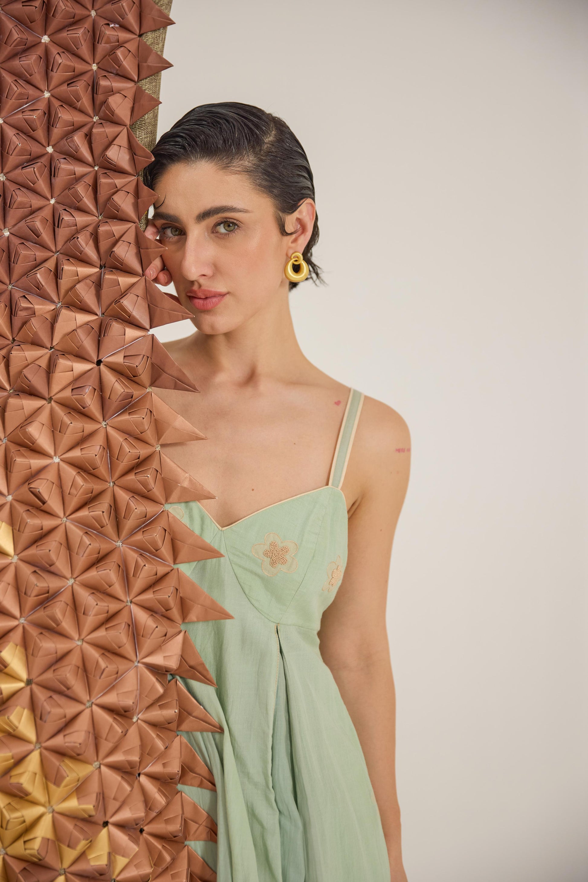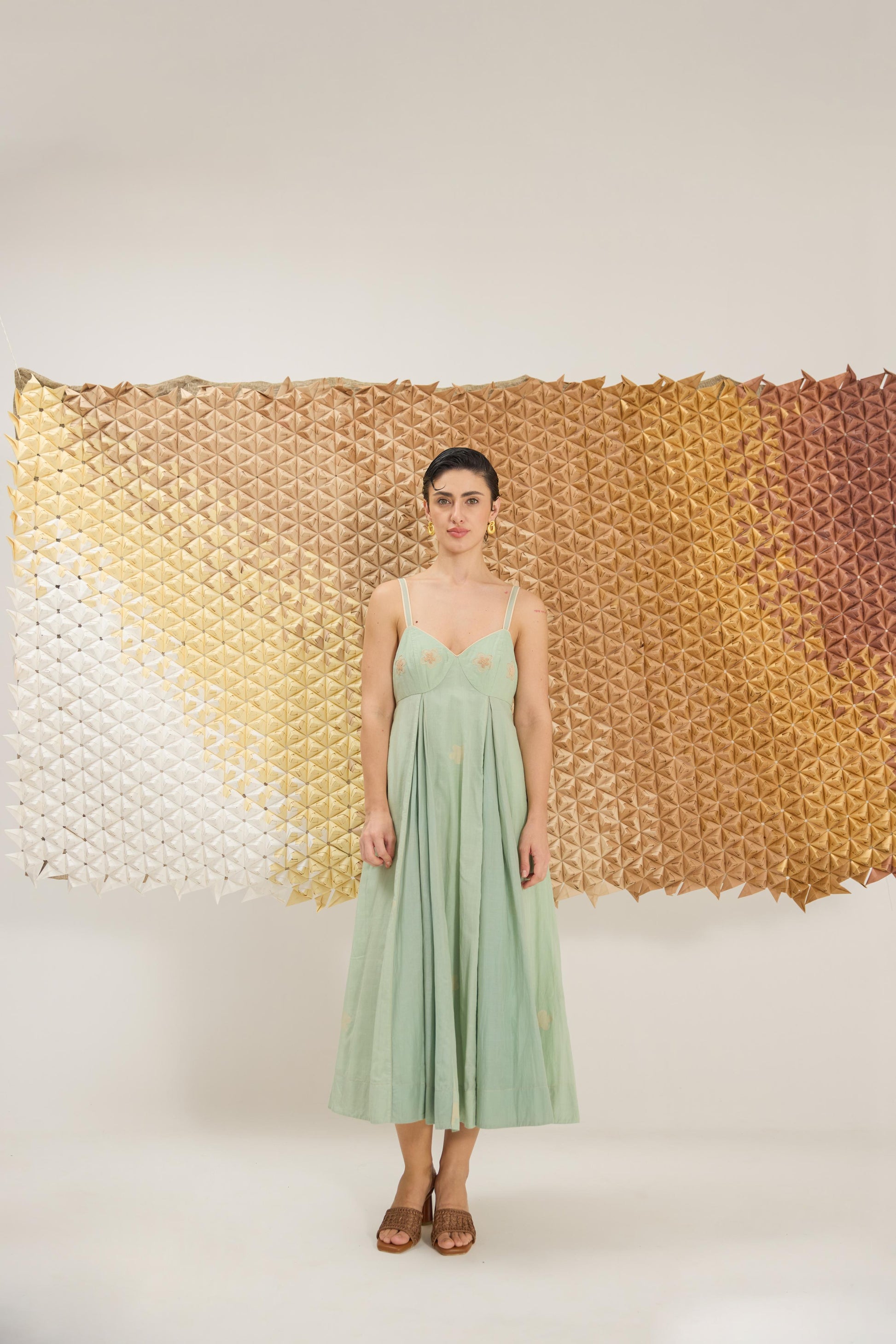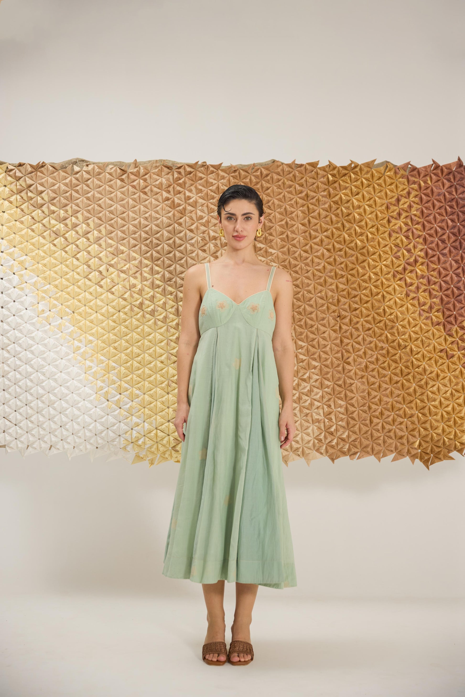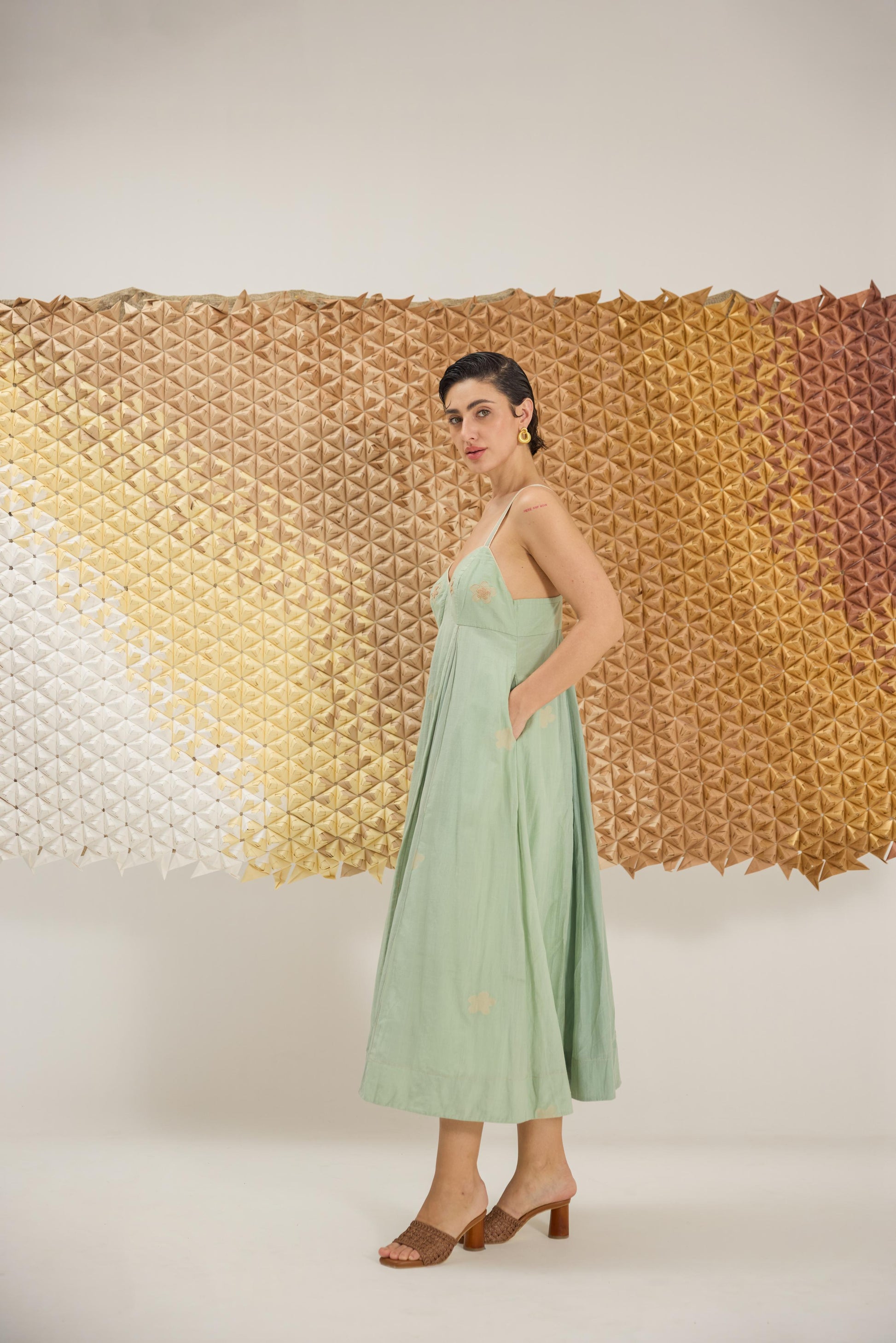 Featuring a strappy easy fit dress crafted from handwoven cotton silk fabric in floral Jamdani weave technique, this dress is a statement for minimal and chic style with a strategic box pleat and hand embroidery adding the touch of elegance to it.