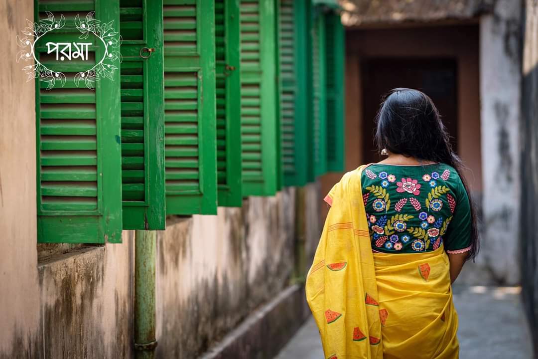 On green cotton, a wide range of wall flowers are hand embroidered delicately all over the back. Little lace details add to the design.