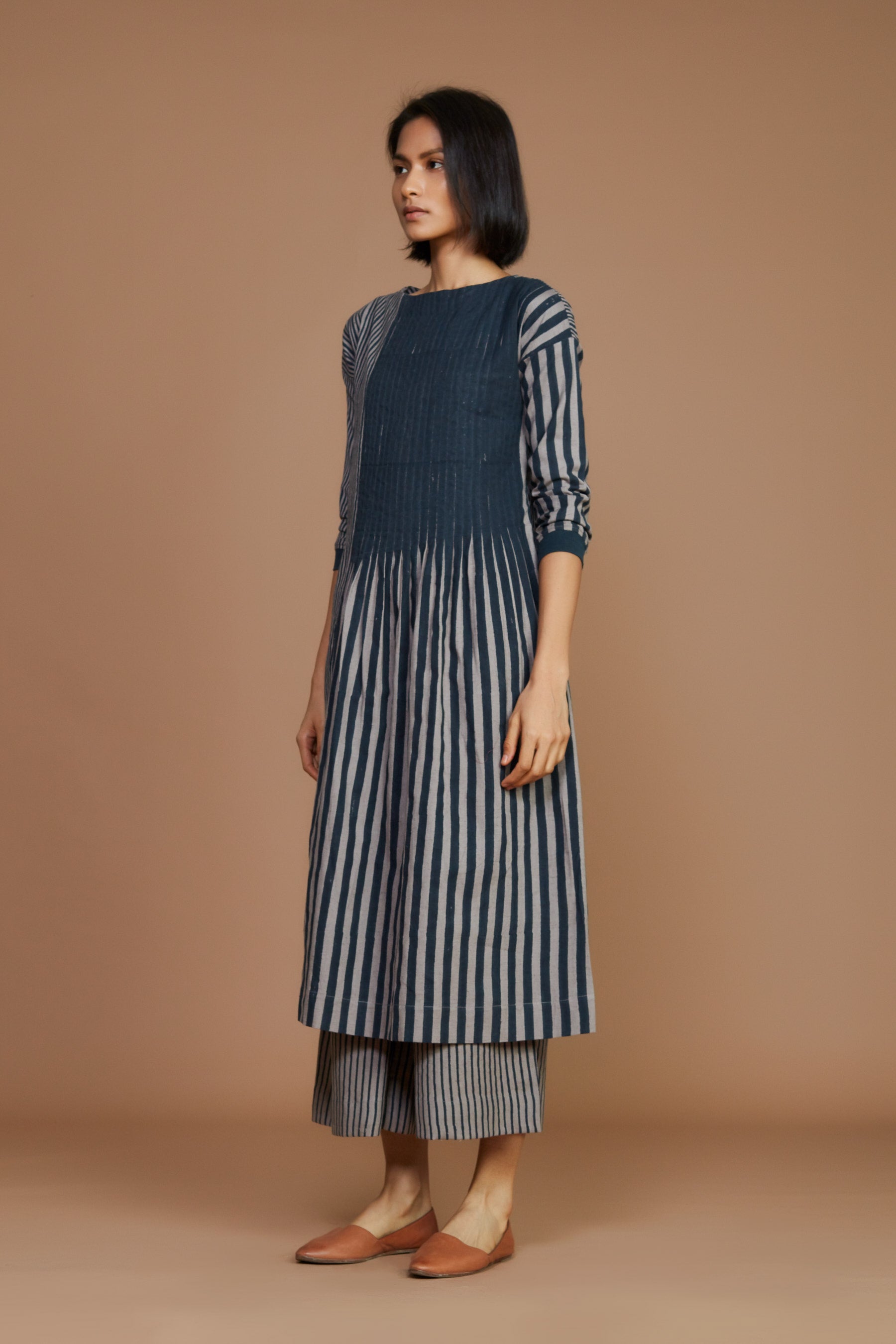 A colour block pattern created by joining the stripes together, this pleated tunic dress gives a nice defined shape around the torso. Comes in a set of 2 with the matching striped Re pants. Make it edgier by styling it with black boots.