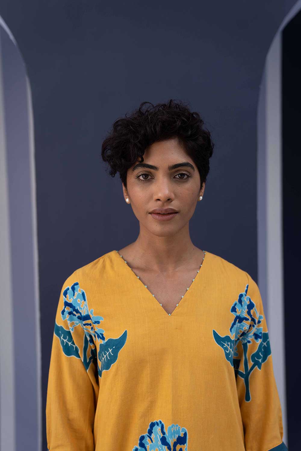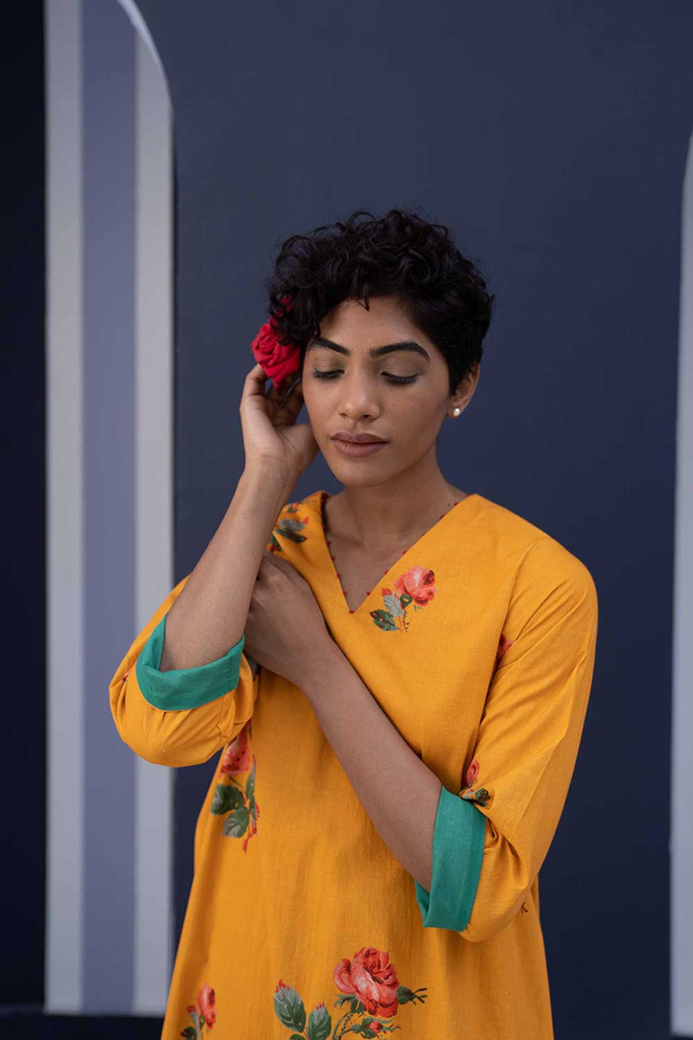 A Mango yellow cotton kurta set, accentuated with beading on kurta pati on the neck and printed roses, paired with straight printed pants