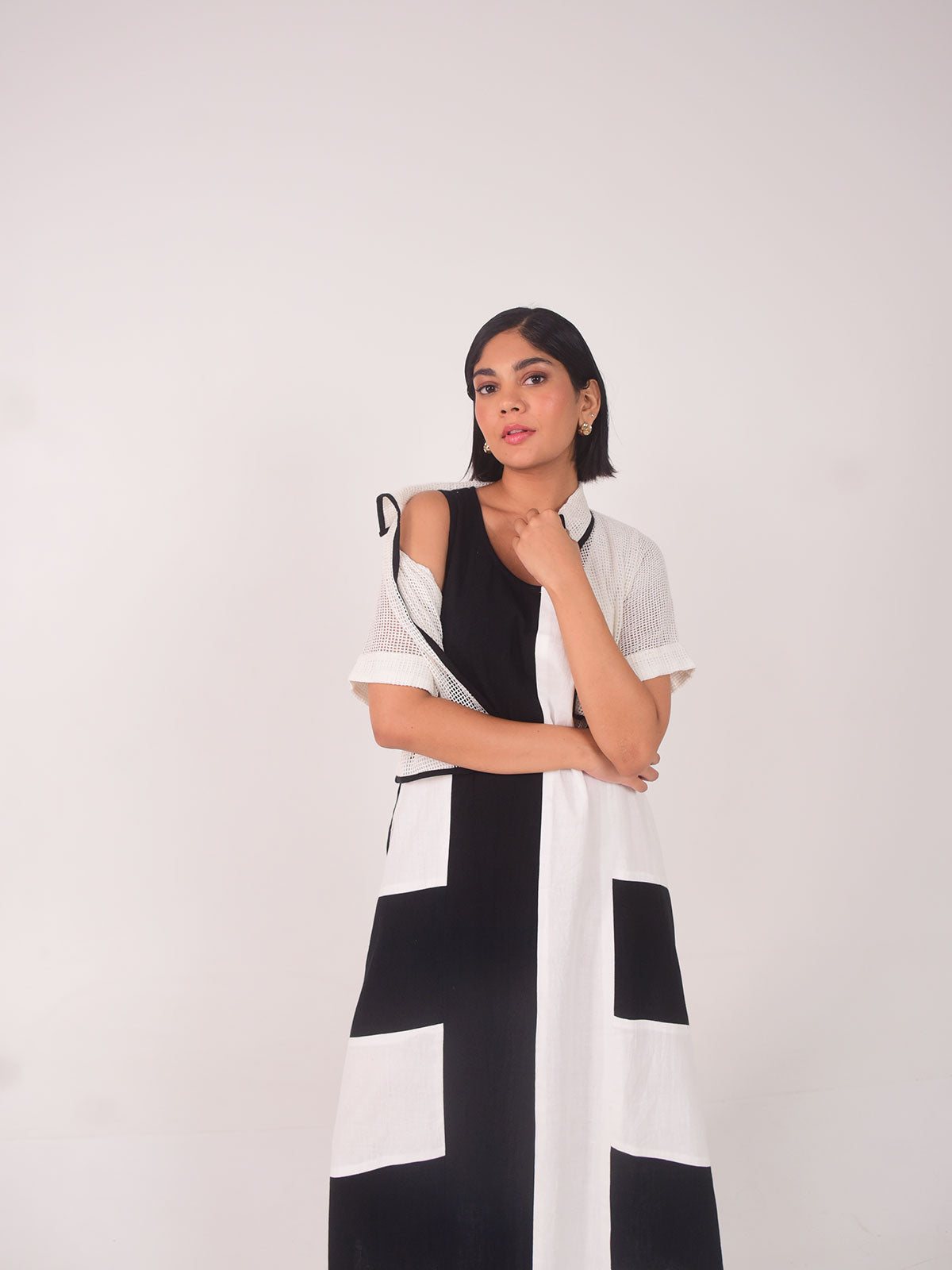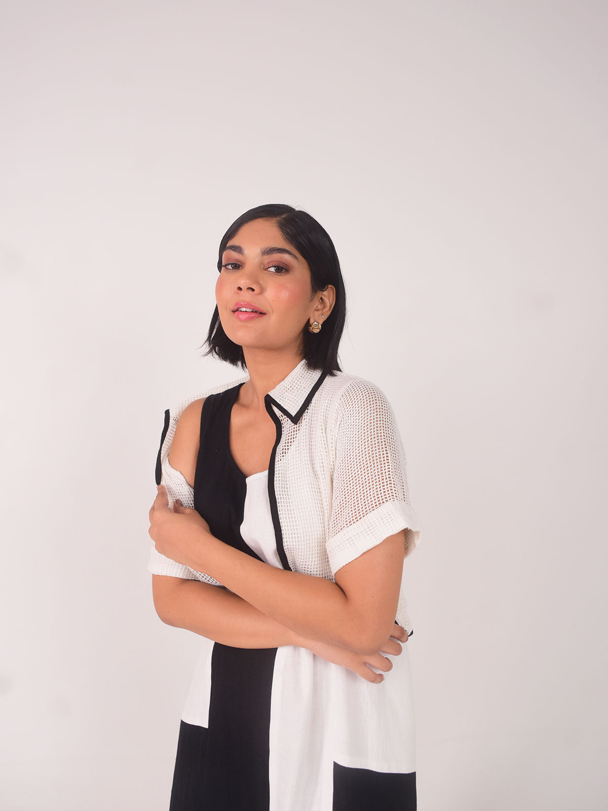 his white bold cropped jacket crafted from lightweight sheer net fabric, offering a modern edge to any outfit. Designed with clean, contrasting black linen-cotton piping that outlines the structure and adds definition. Its see-through finish adds texture without bulk—ideal for layering.