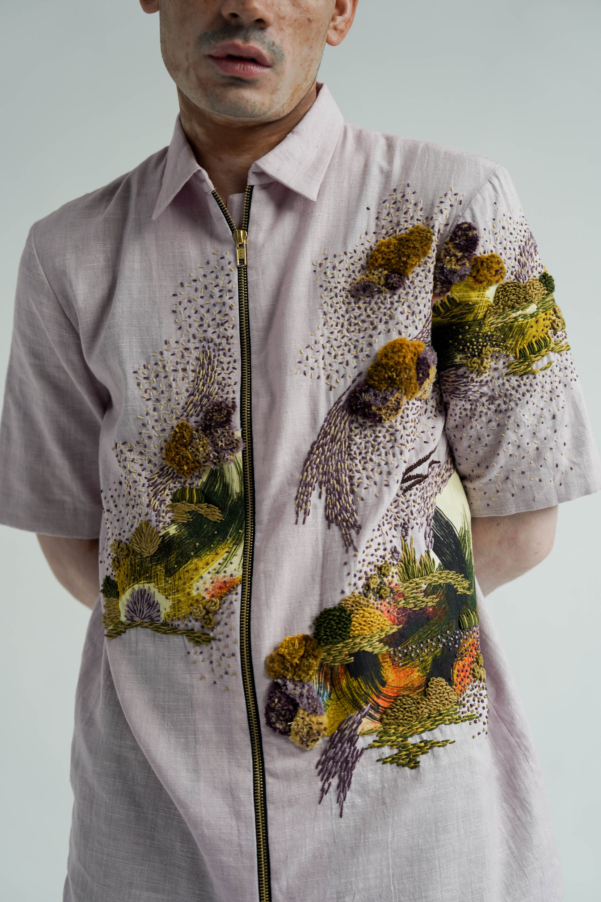 This Hana shirt, crafted from cotton and lined, showcases a hand-dyed lilac hue. It's adorned with hand-embroidered textures, offering a relaxed fit suitable for all genders.