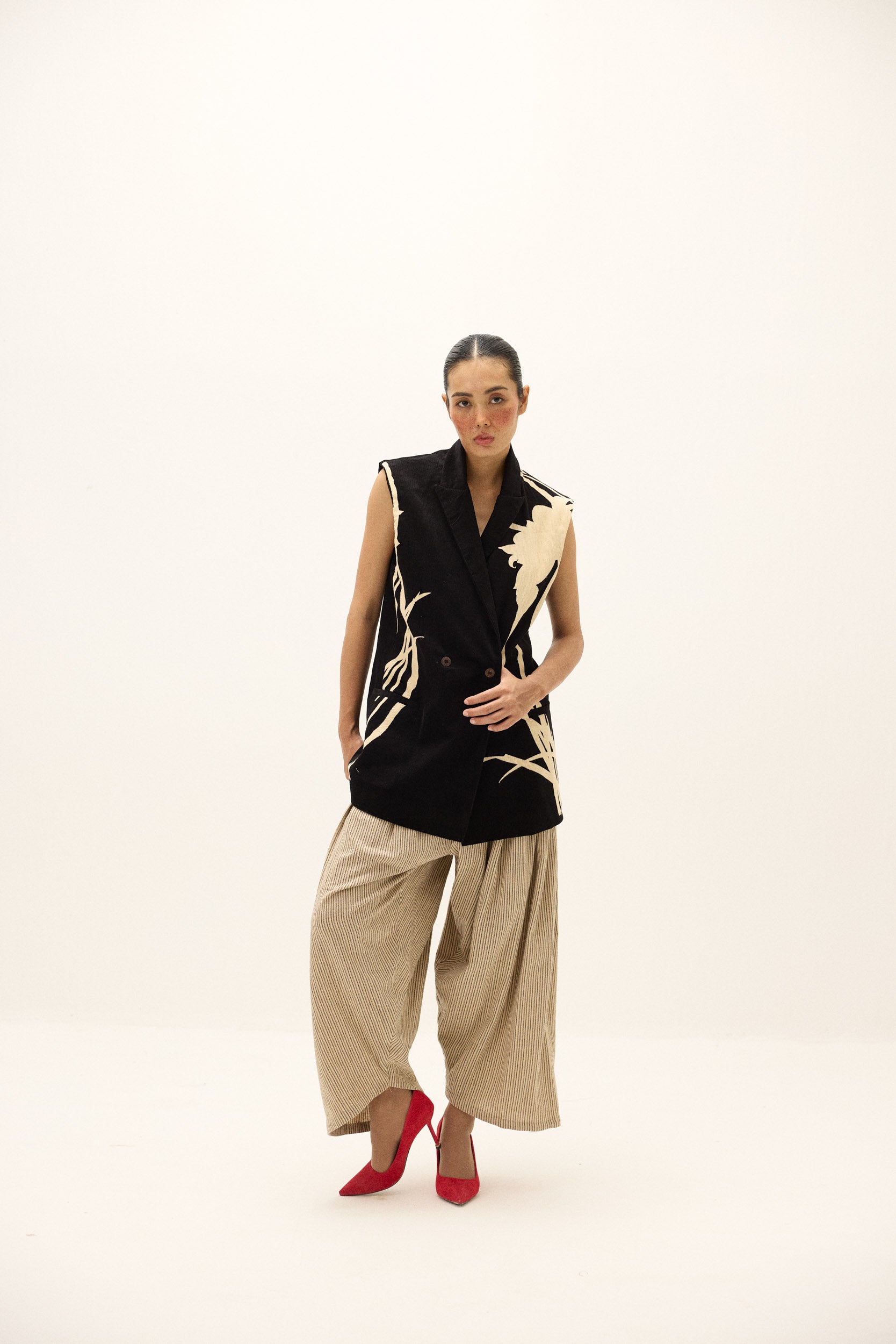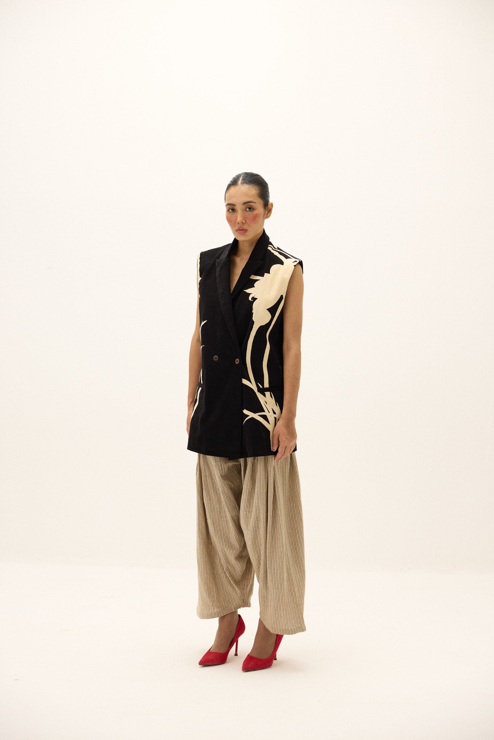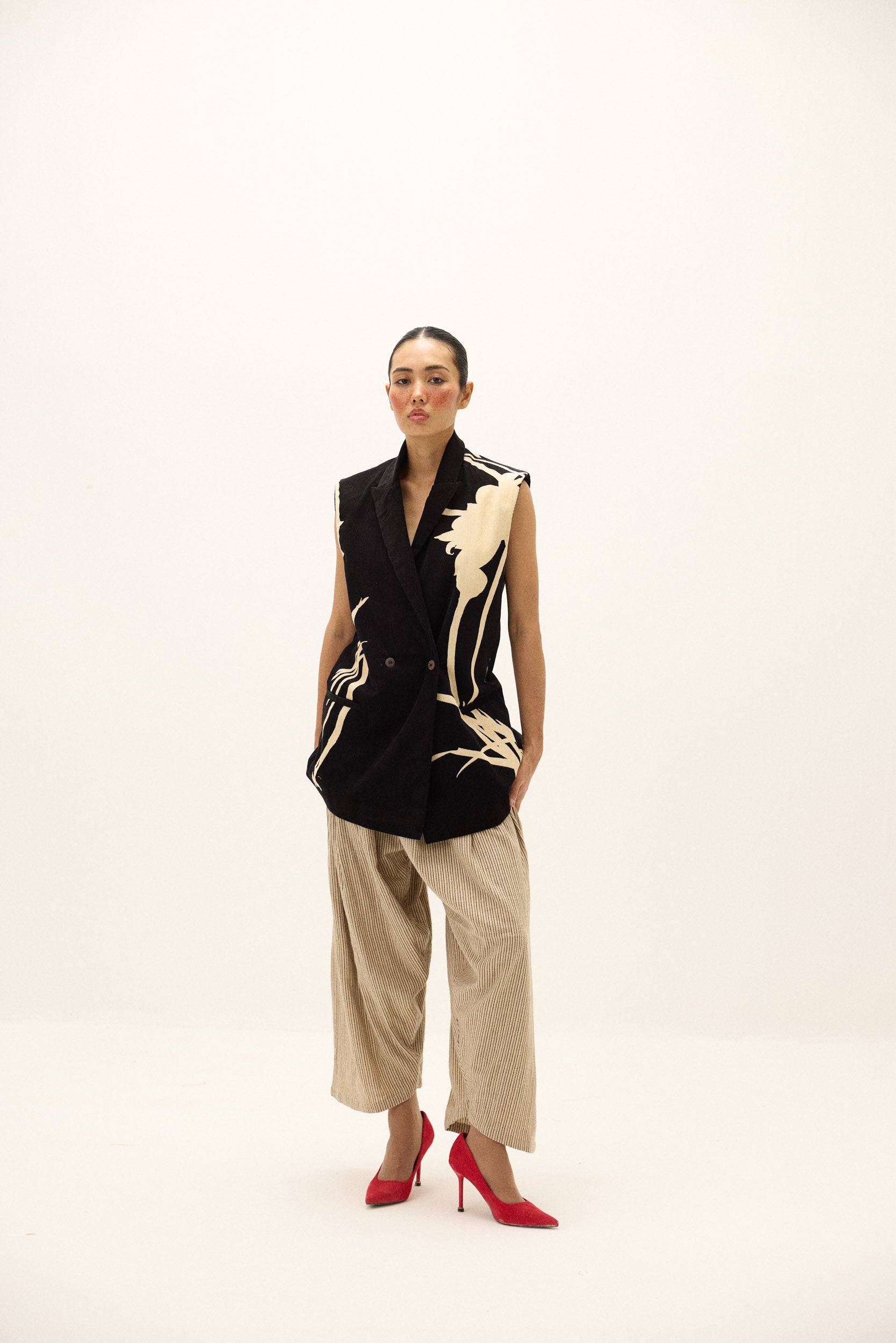A structured corduroy sleeveless blazer reimagined with an artisanal touch. Featuring an abstract ivory print on a deep black base, is tailored with front buttons and long length for a contemporary edge.