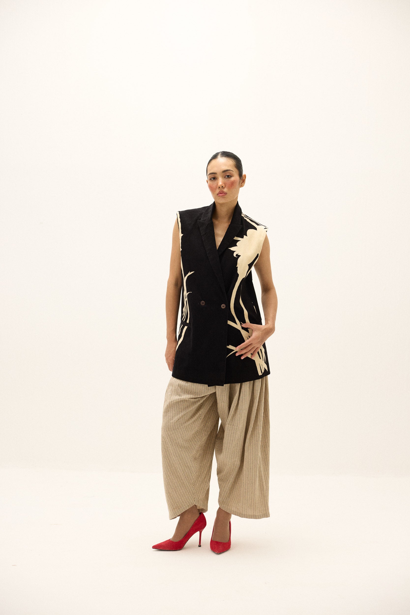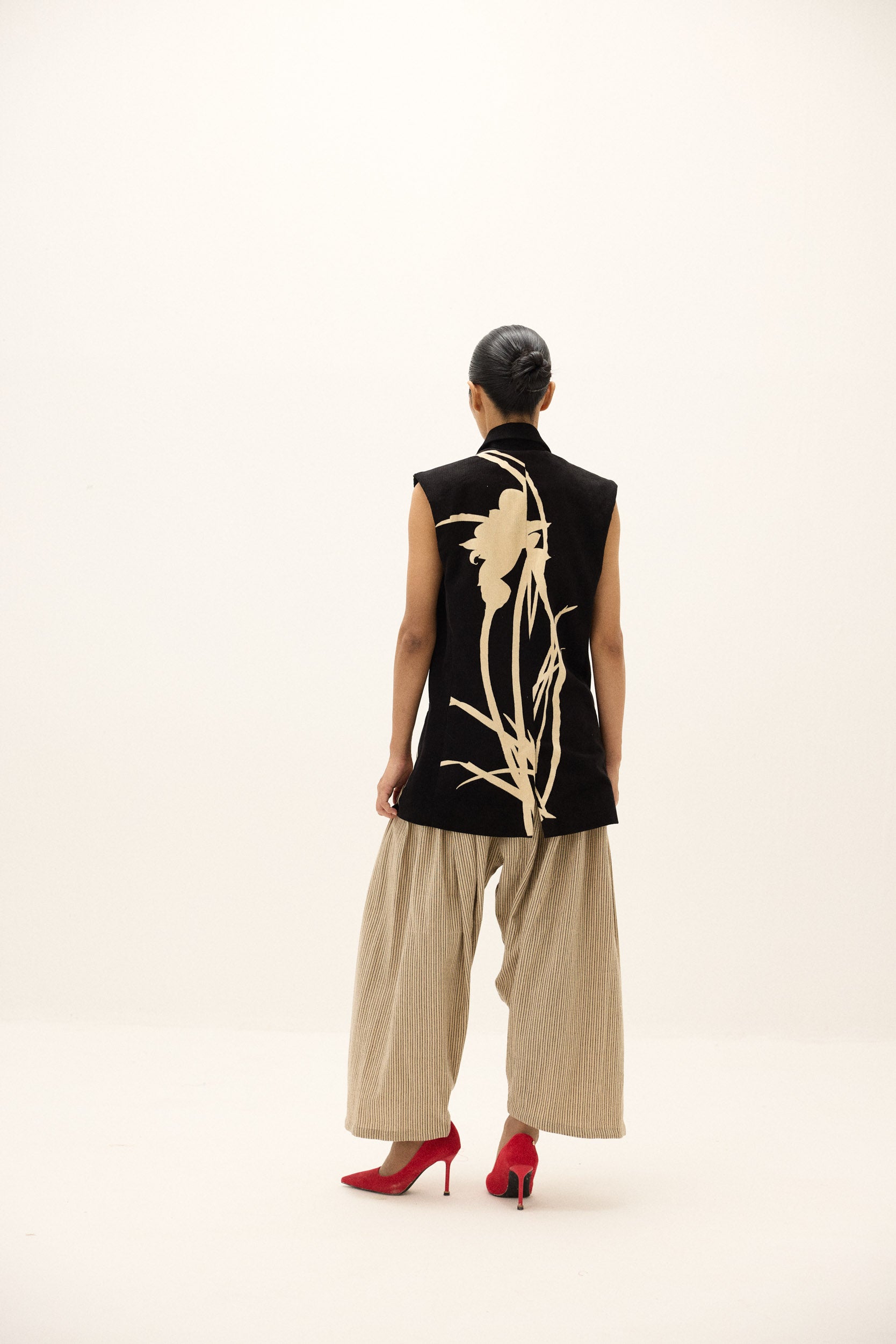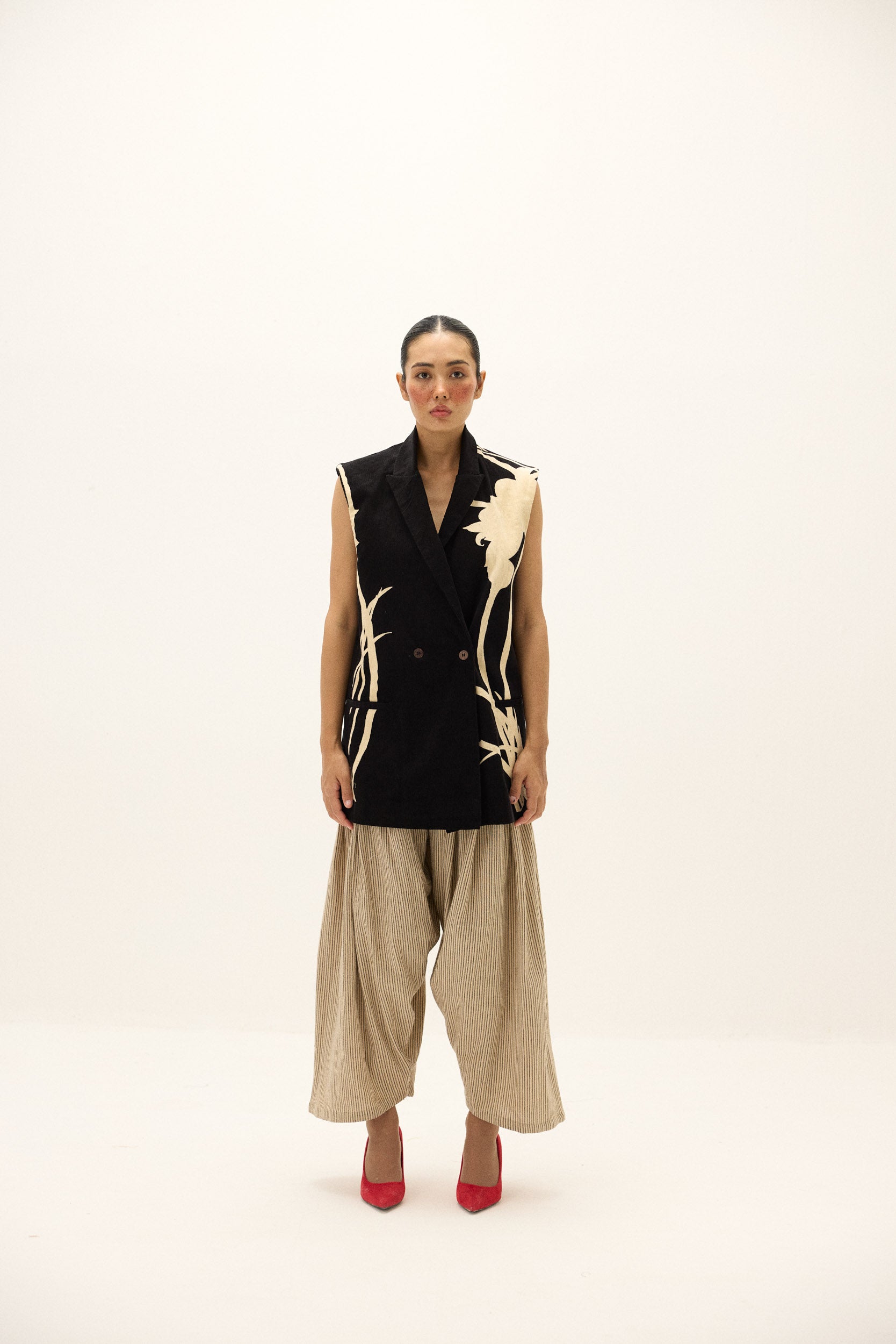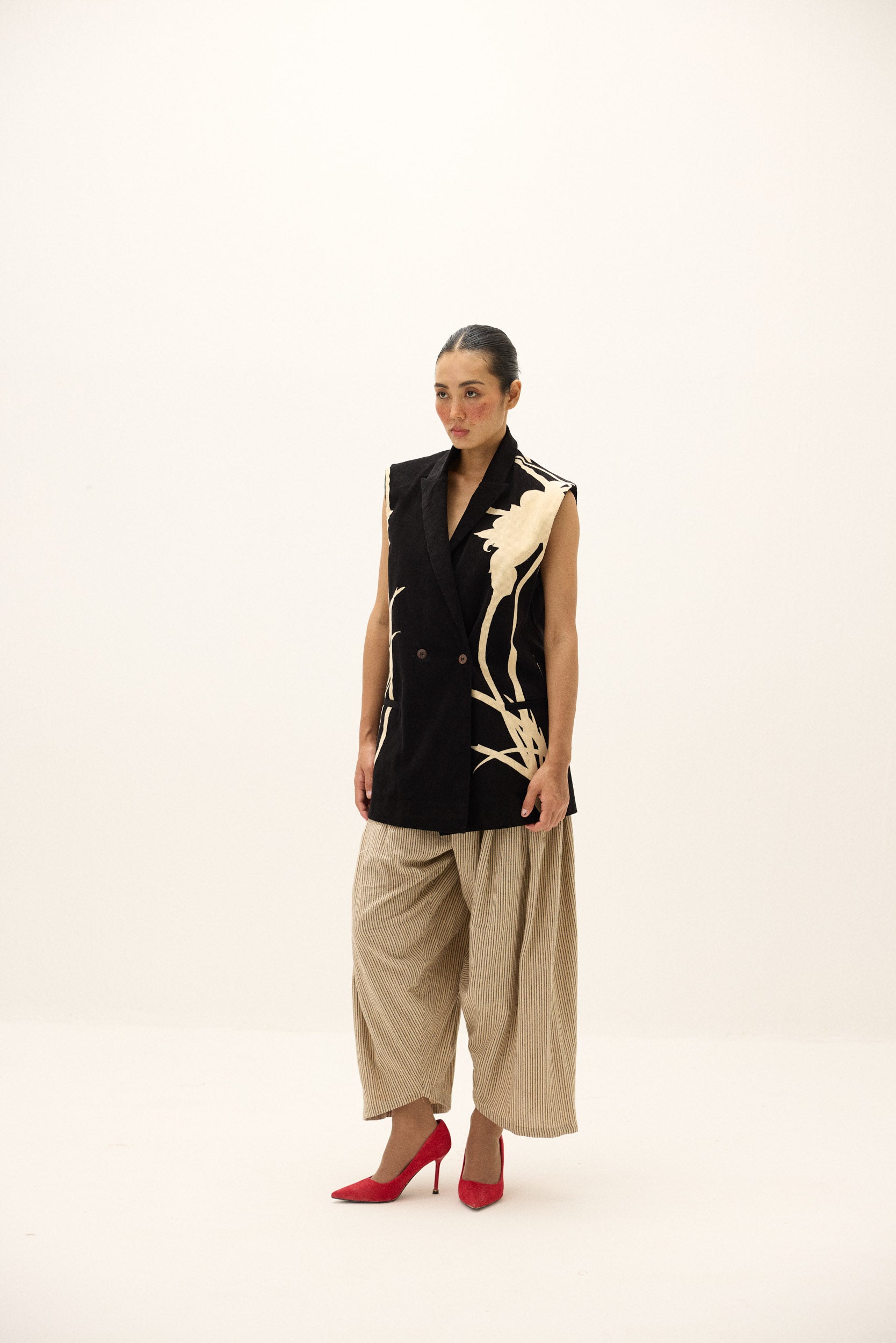 A structured corduroy sleeveless blazer reimagined with an artisanal touch. Featuring an abstract ivory print on a deep black base, is tailored with front buttons and long length for a contemporary edge.