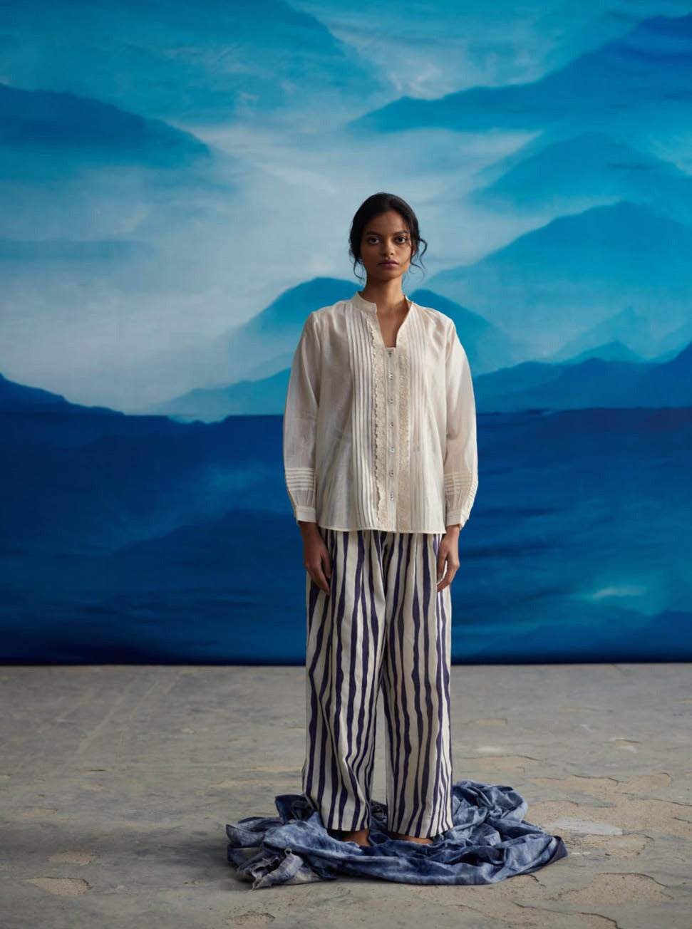 Offering a fresh perspective on the classic shirt, this iteration features a band collar and a low placket, complemented by refined pleat detailing and lace accents for added subtlety. The impeccably tailored fit gracefully conforms to the body, offering versatility that allows it to effortlessly complement a variety of outfits. Whether paired with trousers, jeans, or skirts, this shirt seamlessly combines sophistication with contemporary style, making it a versatile wardrobe essential for any occasion.