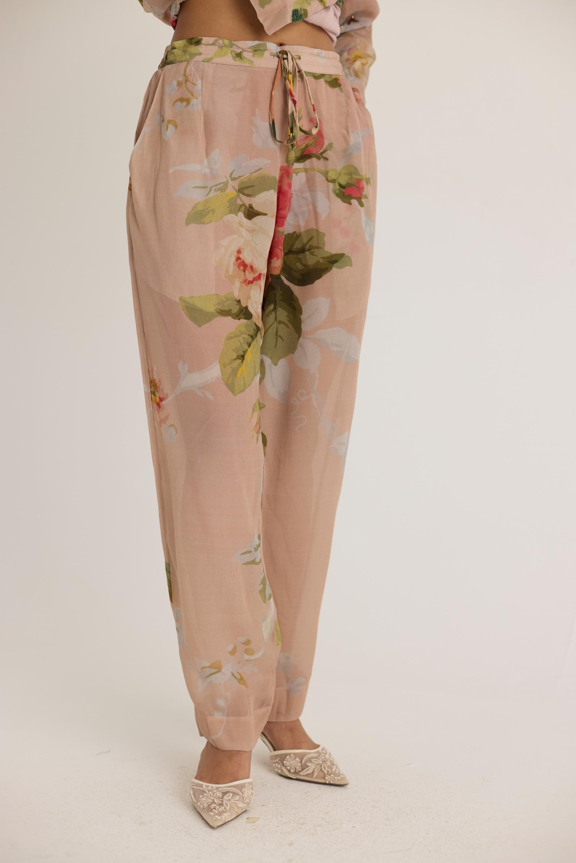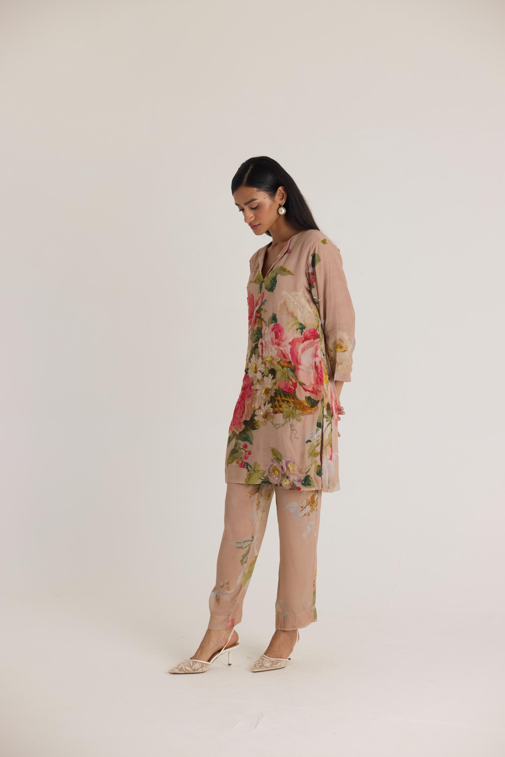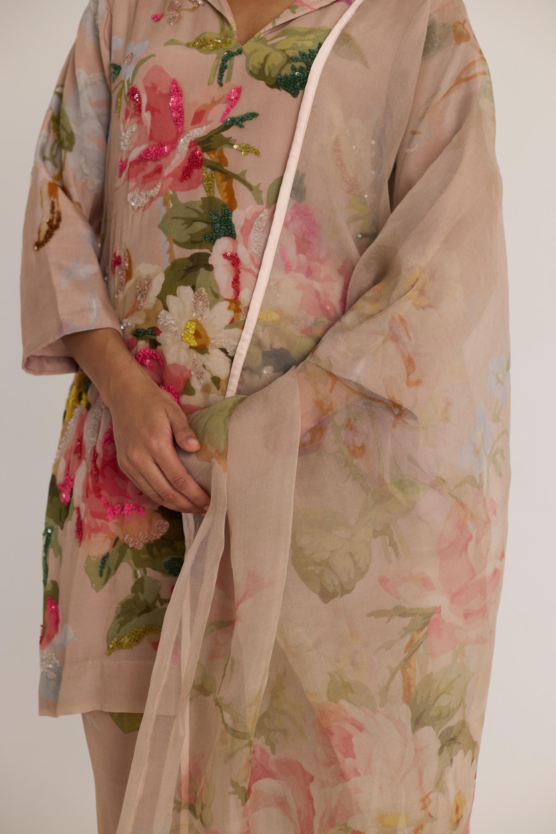 A delicate fusion of tradition and modernity, this 2 piece set features a soft blush-toned kurta adorned with exquisite hand-painted floral prints and intricate embroidery. The elegant floral motifs in shades of pink and green are further enhanced by fine embroidery, adding texture and depth. The sheer dupatta, adds a touch of ethereal charm can be added for an elevated look. Paired with matching straight trousers, this outfit is perfect for refined daywear or an elegant evening look.
